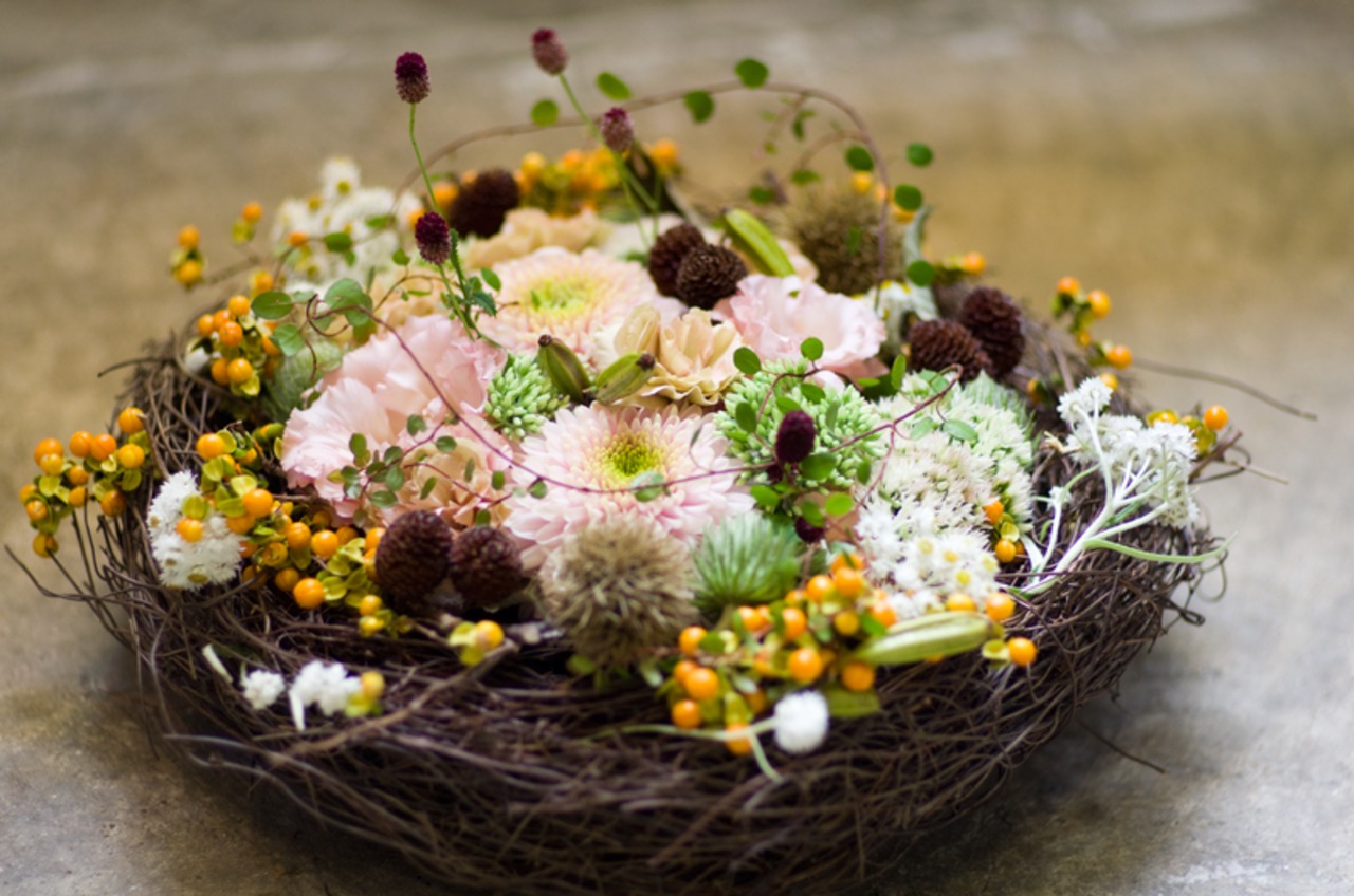 秋の訪れを感じさせる、鳥の巣に実の物をあしらったフラワーアレンジをご提案いたします!