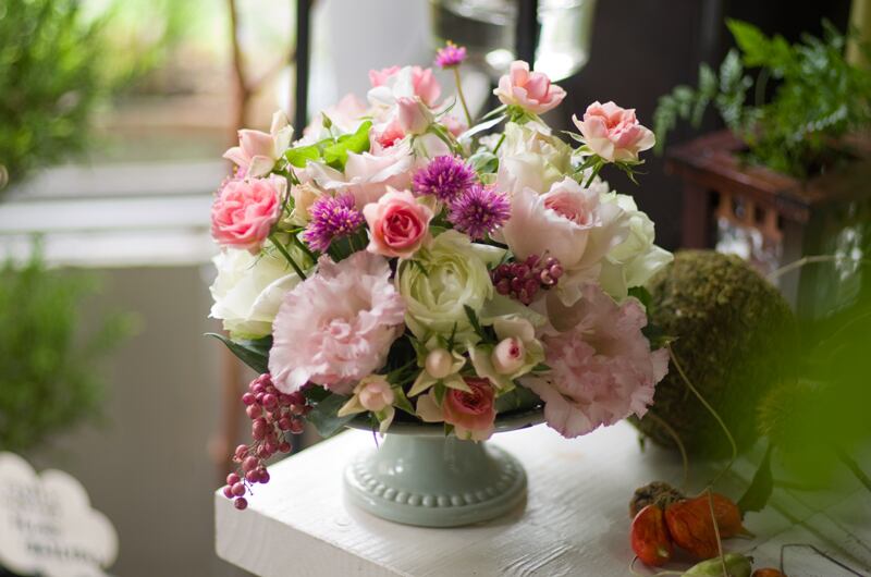 淡いピンクでまとめたキュートなフラワーアレンジをご覧ください!