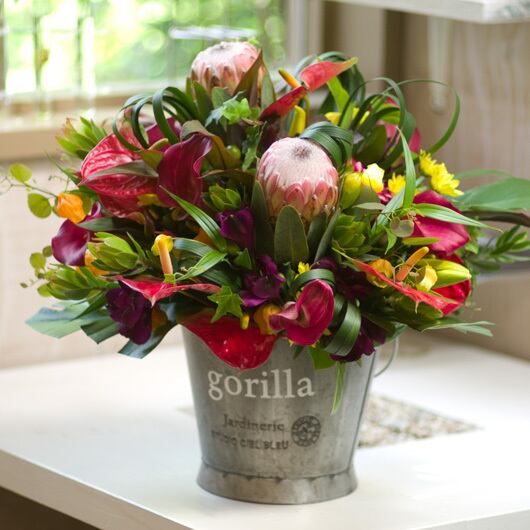 ・アンスリューム、カラー、キングプロティアを使用した華やかなフラワーアレンジ
