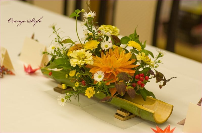 竹の器に秋を彩るフラワーアレンジ
