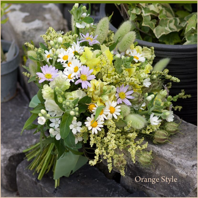 その季節ならではの瑞々しいお花を贅沢に使った、天のひらオリジナルのフラワーブーケです。決まった形ではなく、ご注文をいただいてから、その日一番の状態の良い花材を厳選してお作りします。