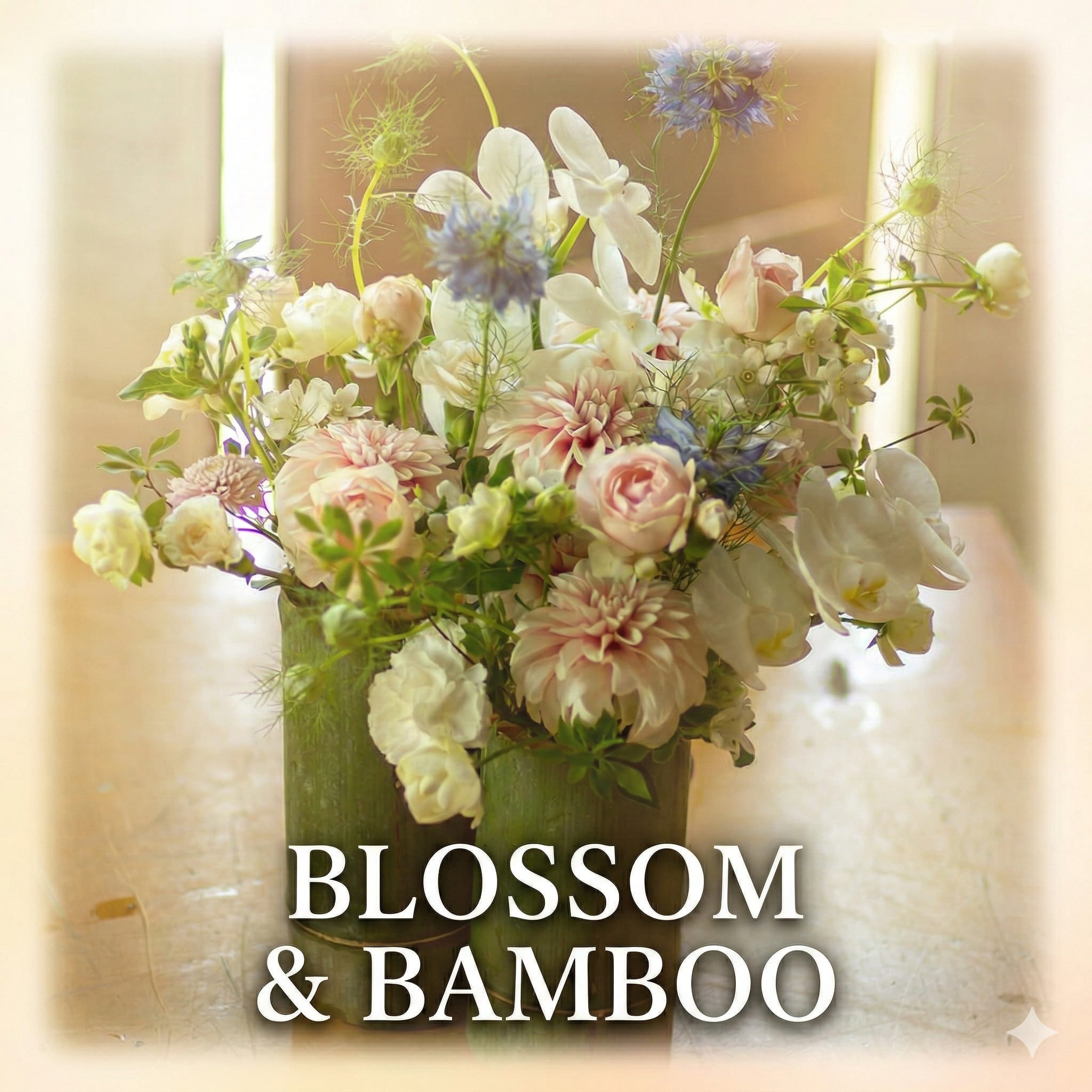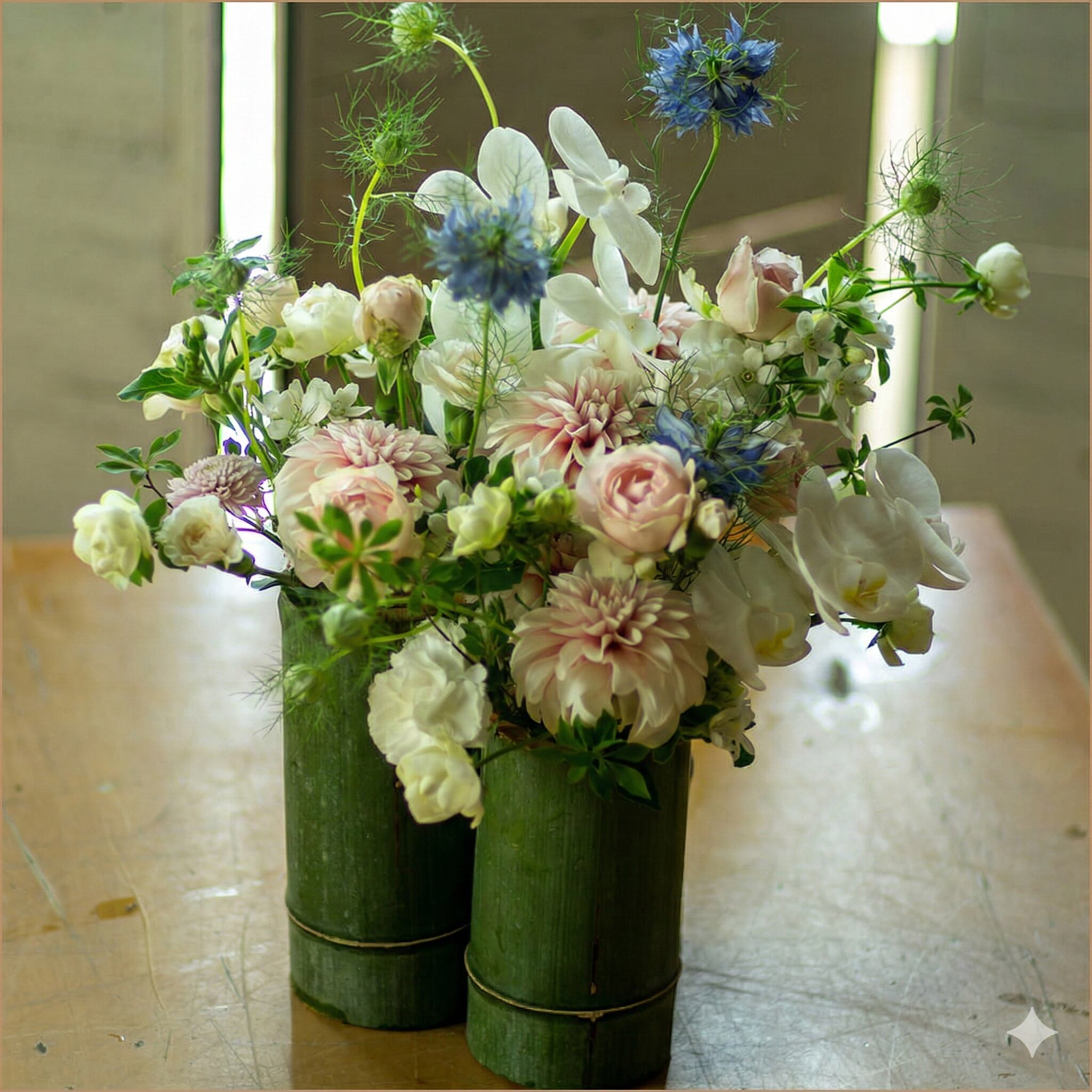 天然の竹筒を花器に見立て、爽やかな青いニゲラ、幾重な花びらを重ねた優しいピンクのダリア、そして気品あふれる白い蘭などを贅沢に束ねました。