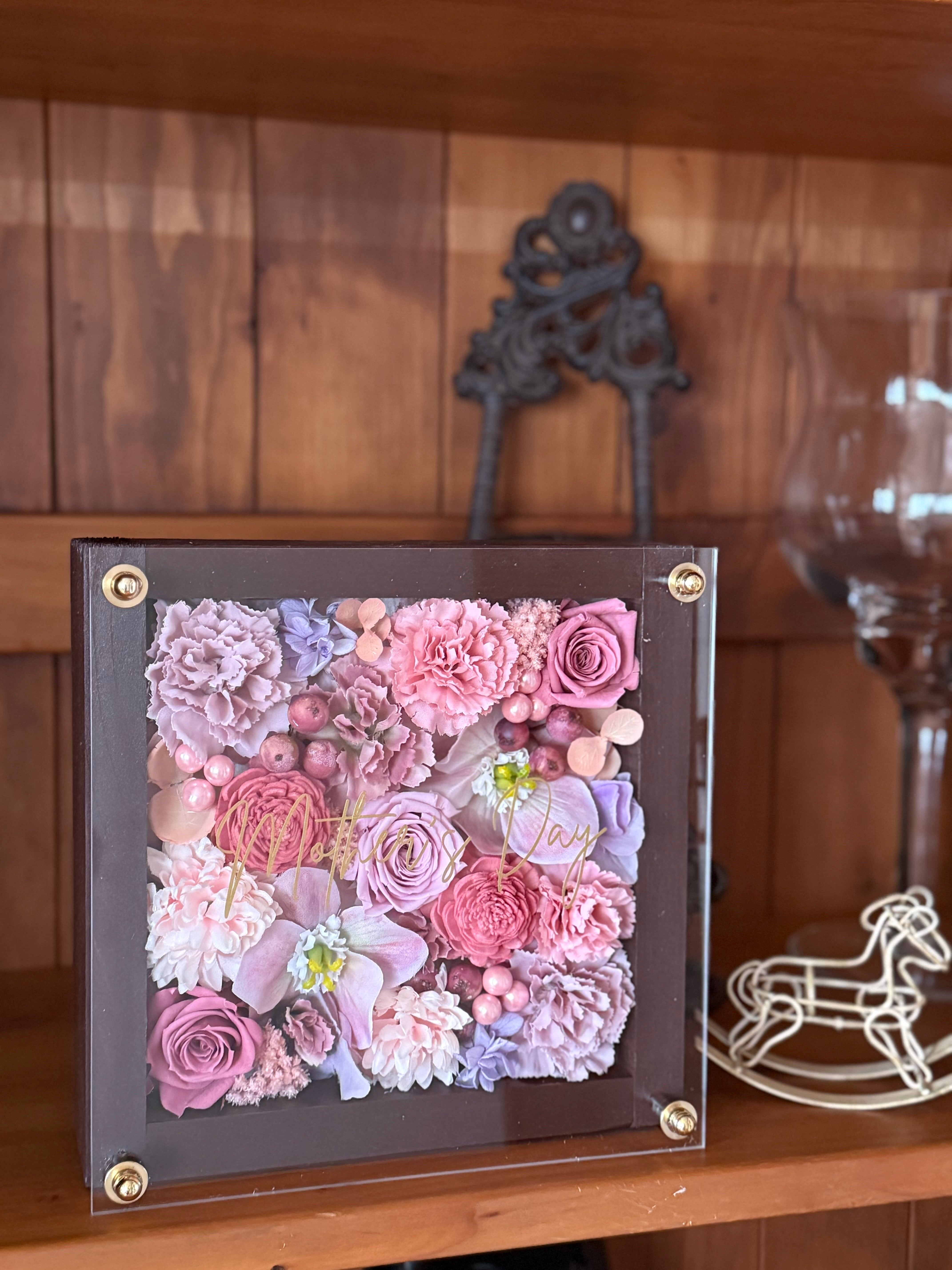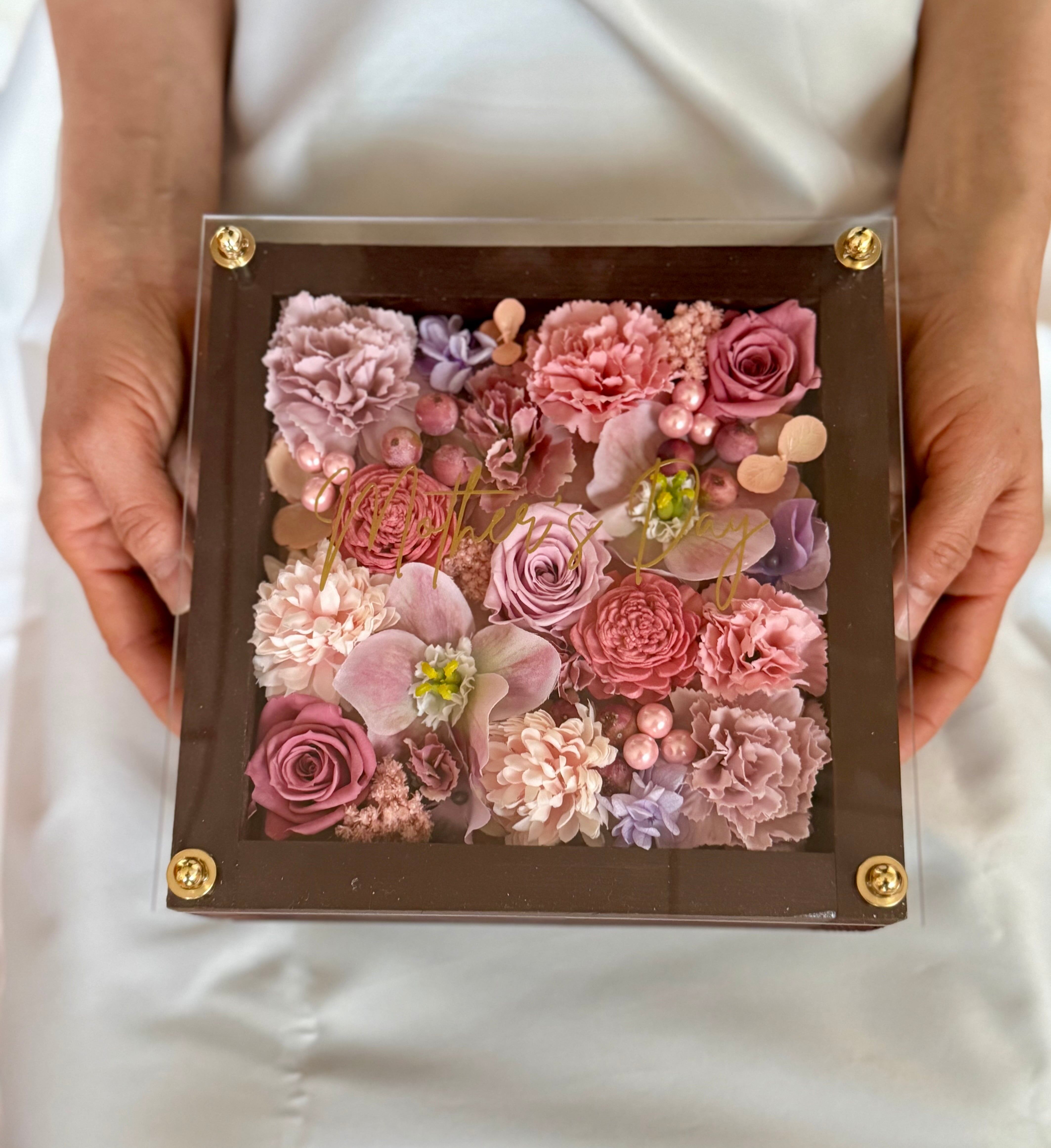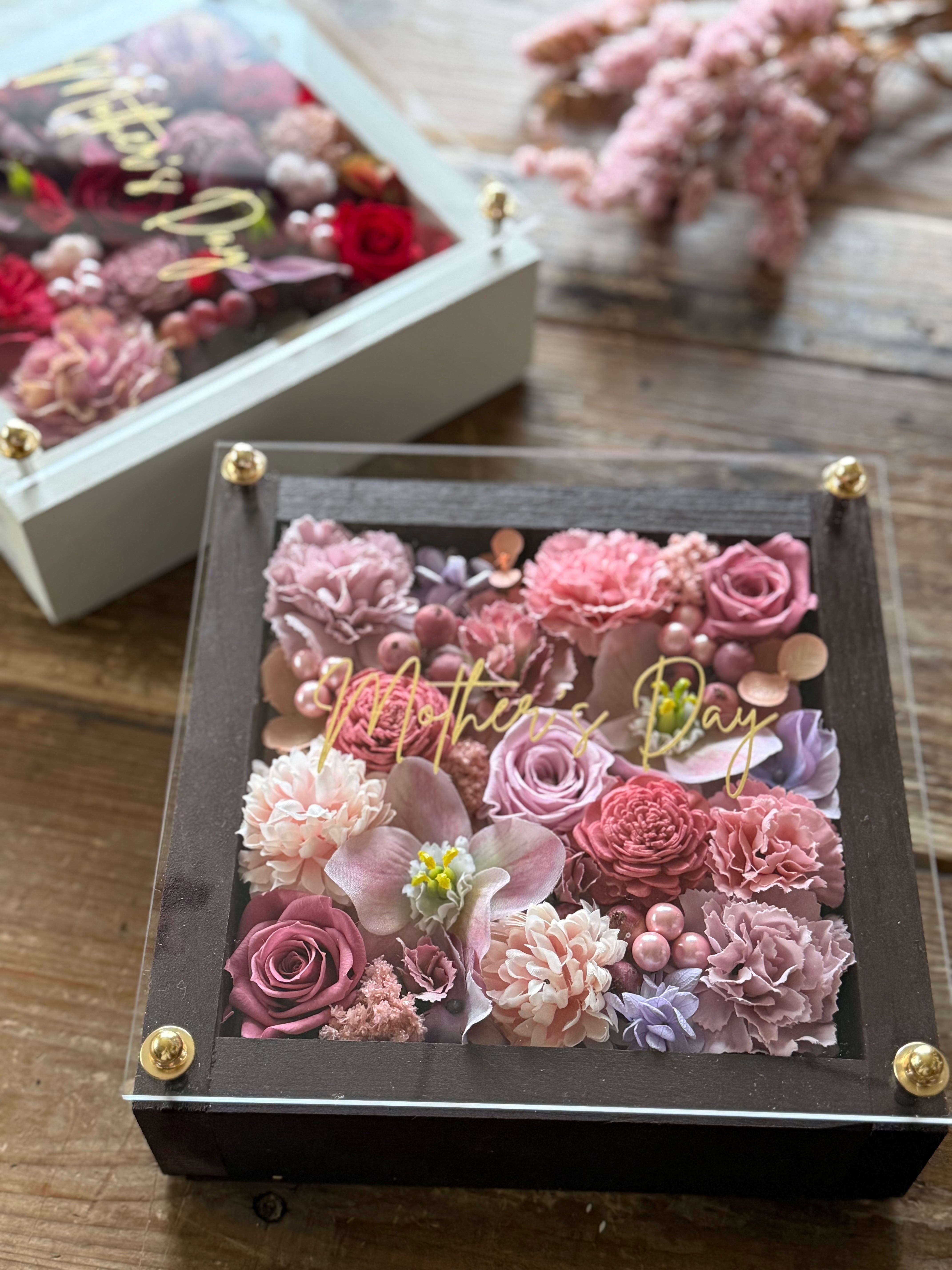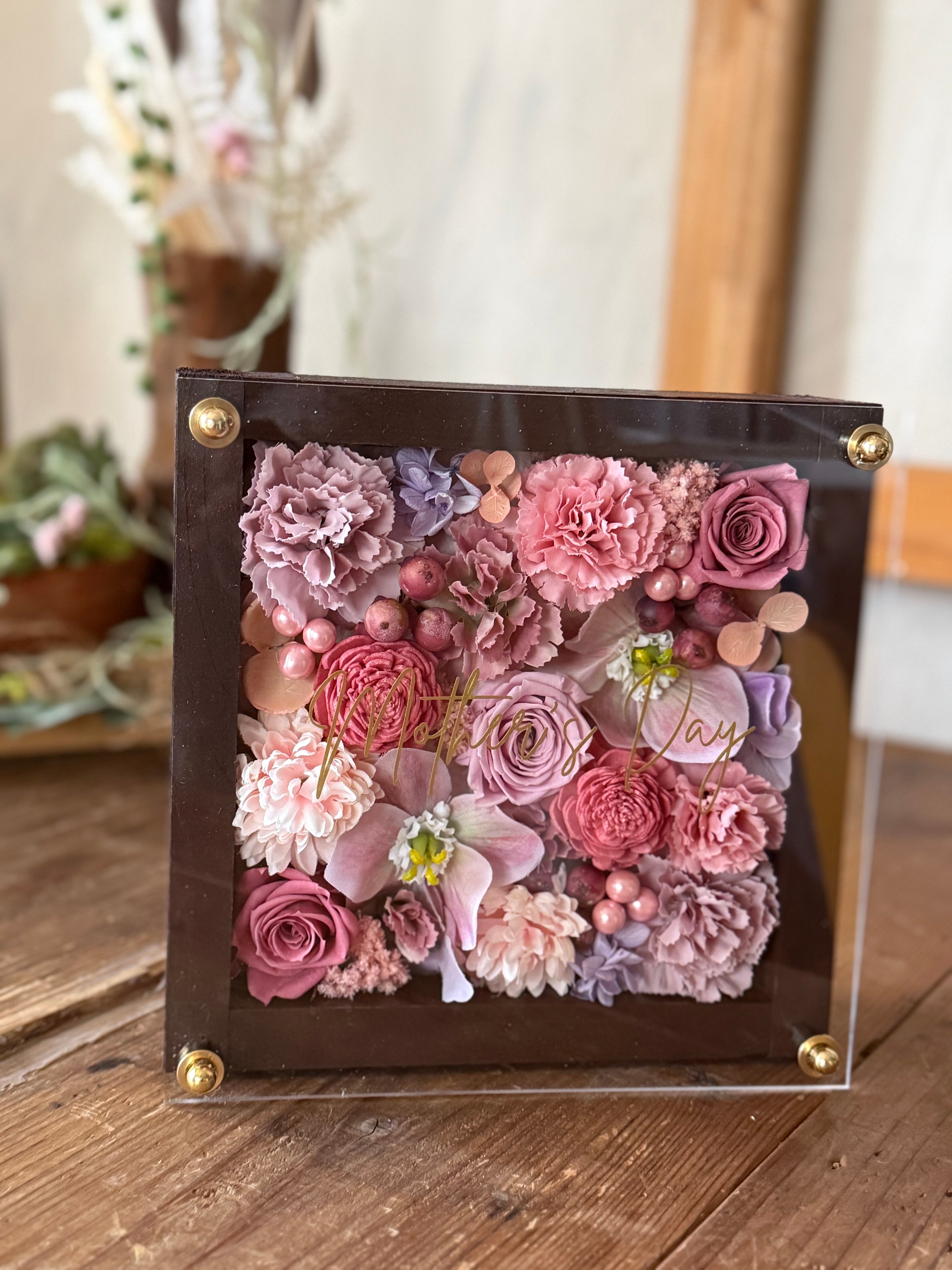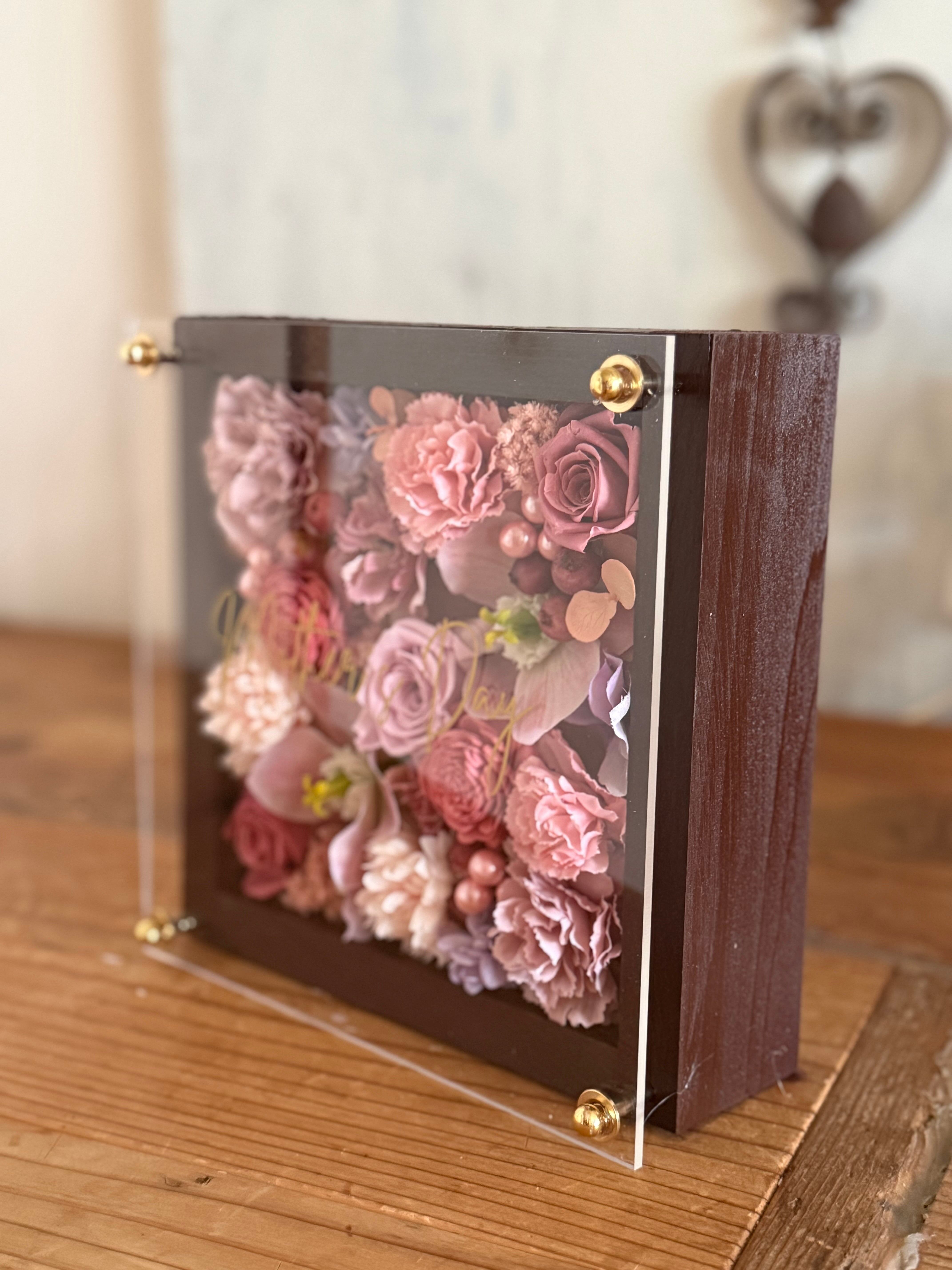 母の日ギフト プリザーブドフラワーアレンジメント【母の日限定】ゴールド文字入れ ウッドフレーム 茶木枠〈シックピンクバラ〉