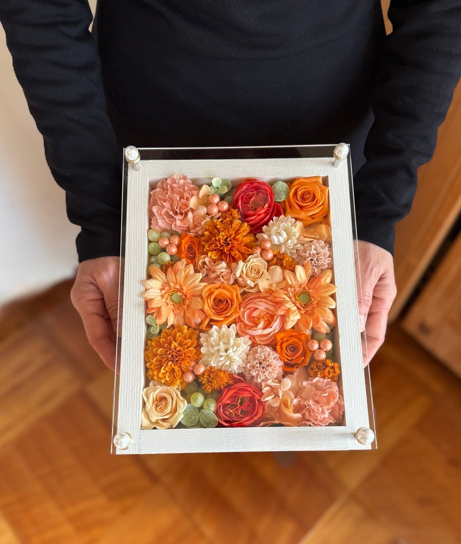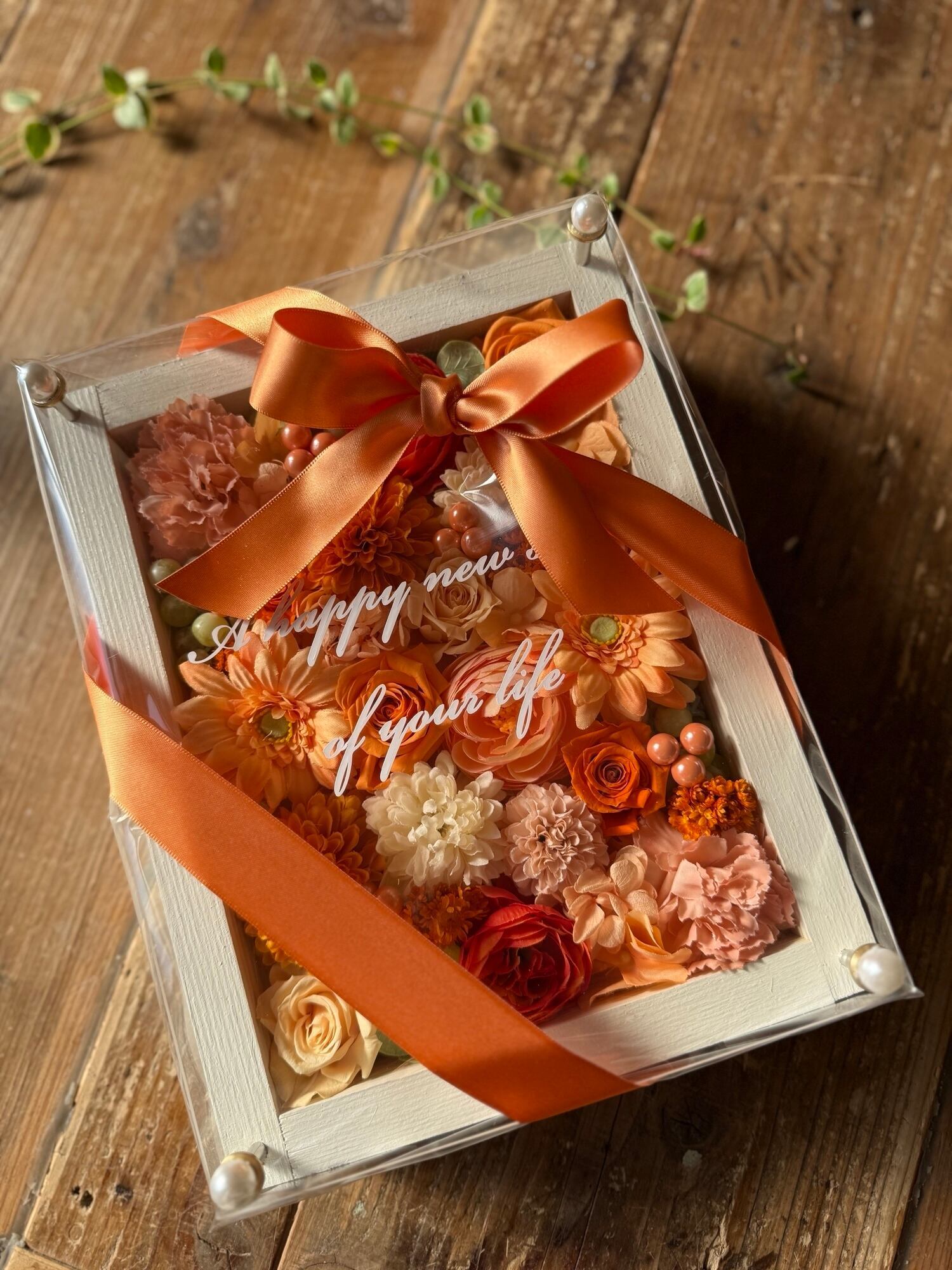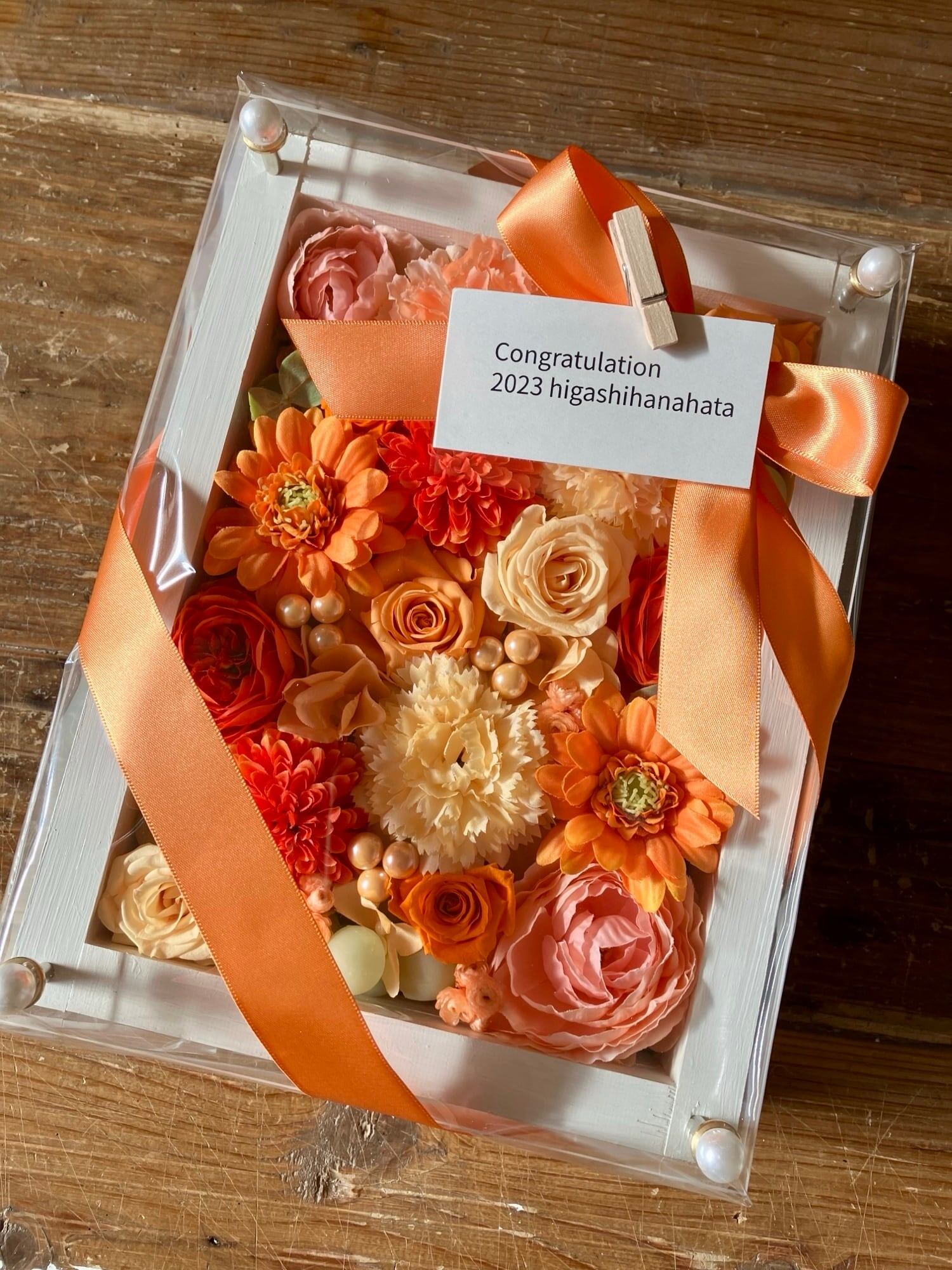 開店祝い・サロンオープン祝い・退職祝い・結婚祝い【名入れ】プリザーブドフラワーアレンジ ウッドフレーム 白木枠〈オレンジ〉