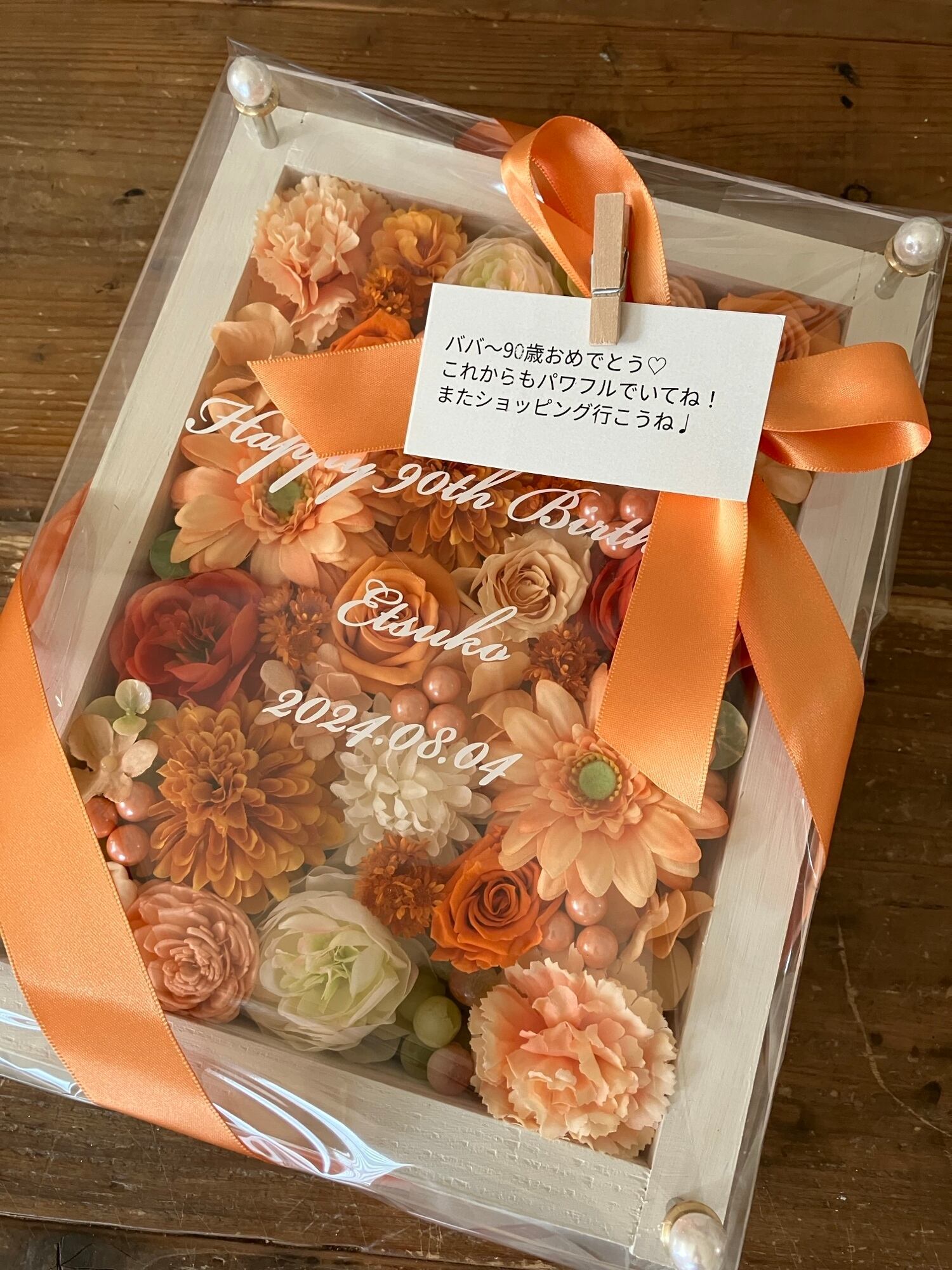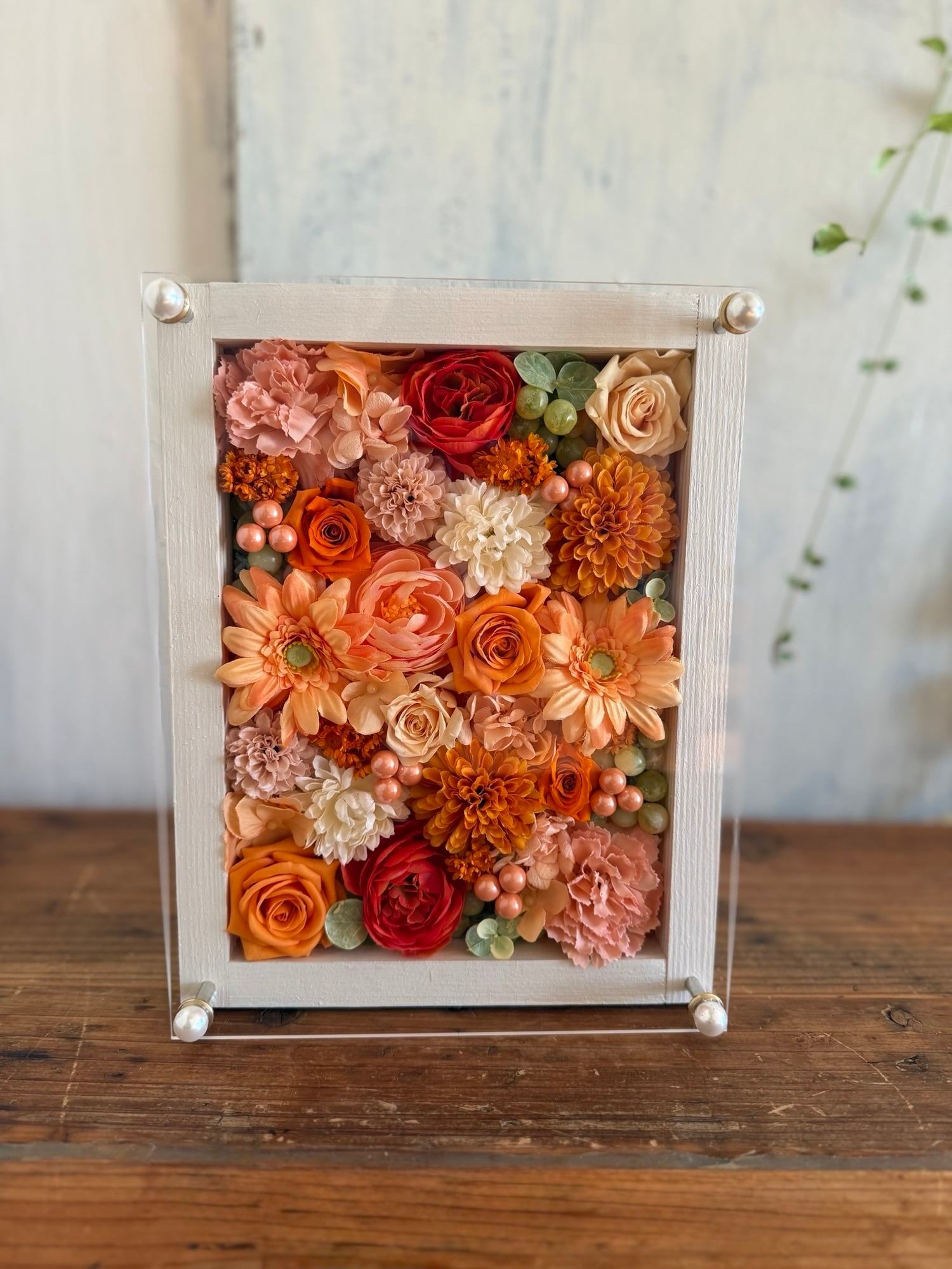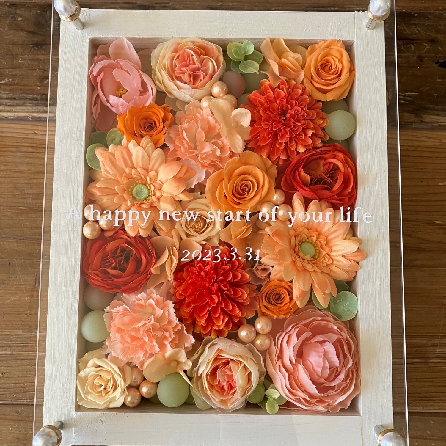 白色のウッドフレームにプリザーブドフラワーと造花をぎっしり詰め込み、アクリル板にはカッティングシートでメッセージをお入れします。
