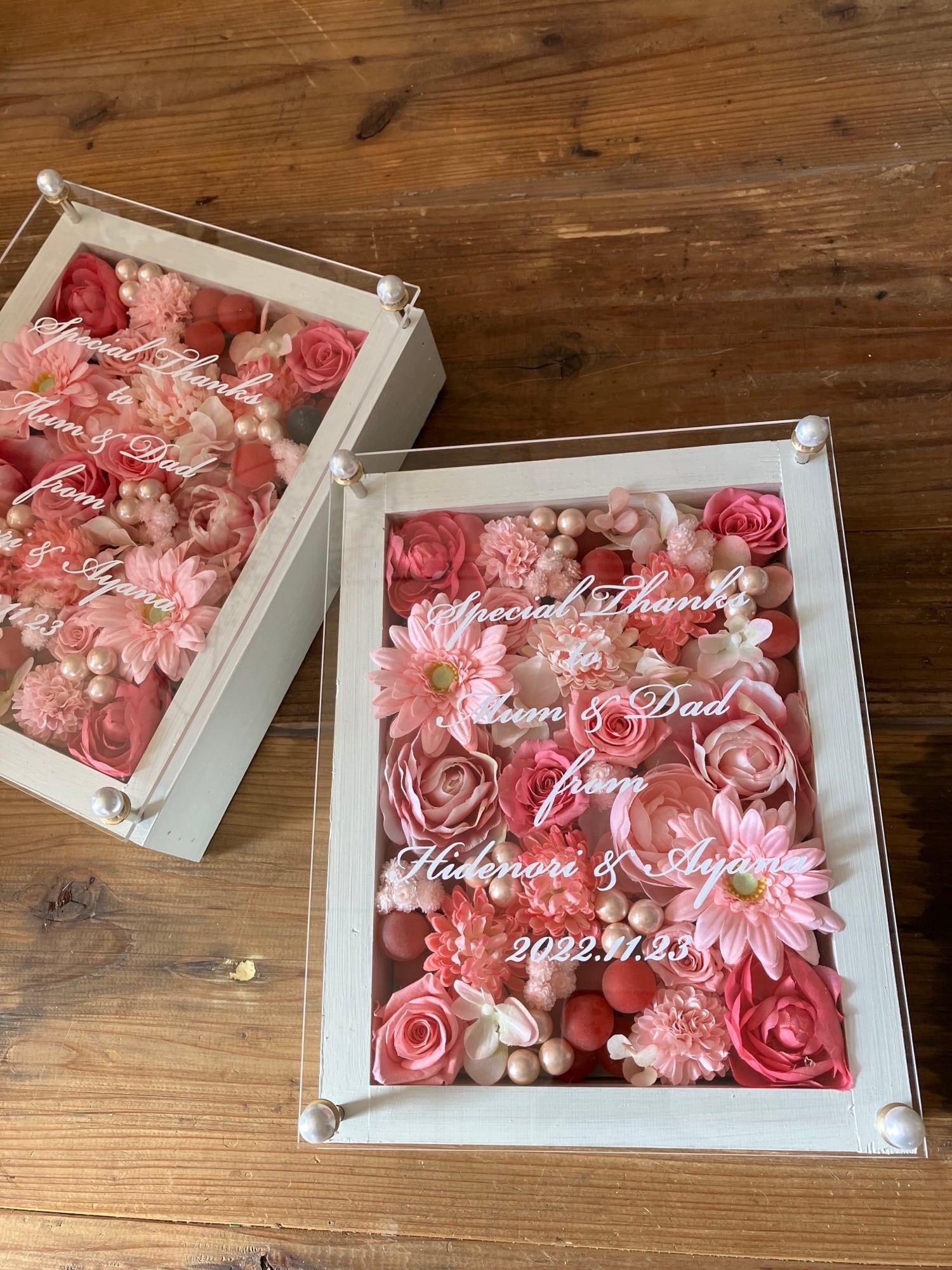 子育て感謝状・両親贈呈品 2個セット【名入れ】プリザーブドフラワーアレンジ ウッドフレーム〈ピンクペア〉結婚式 ギフト