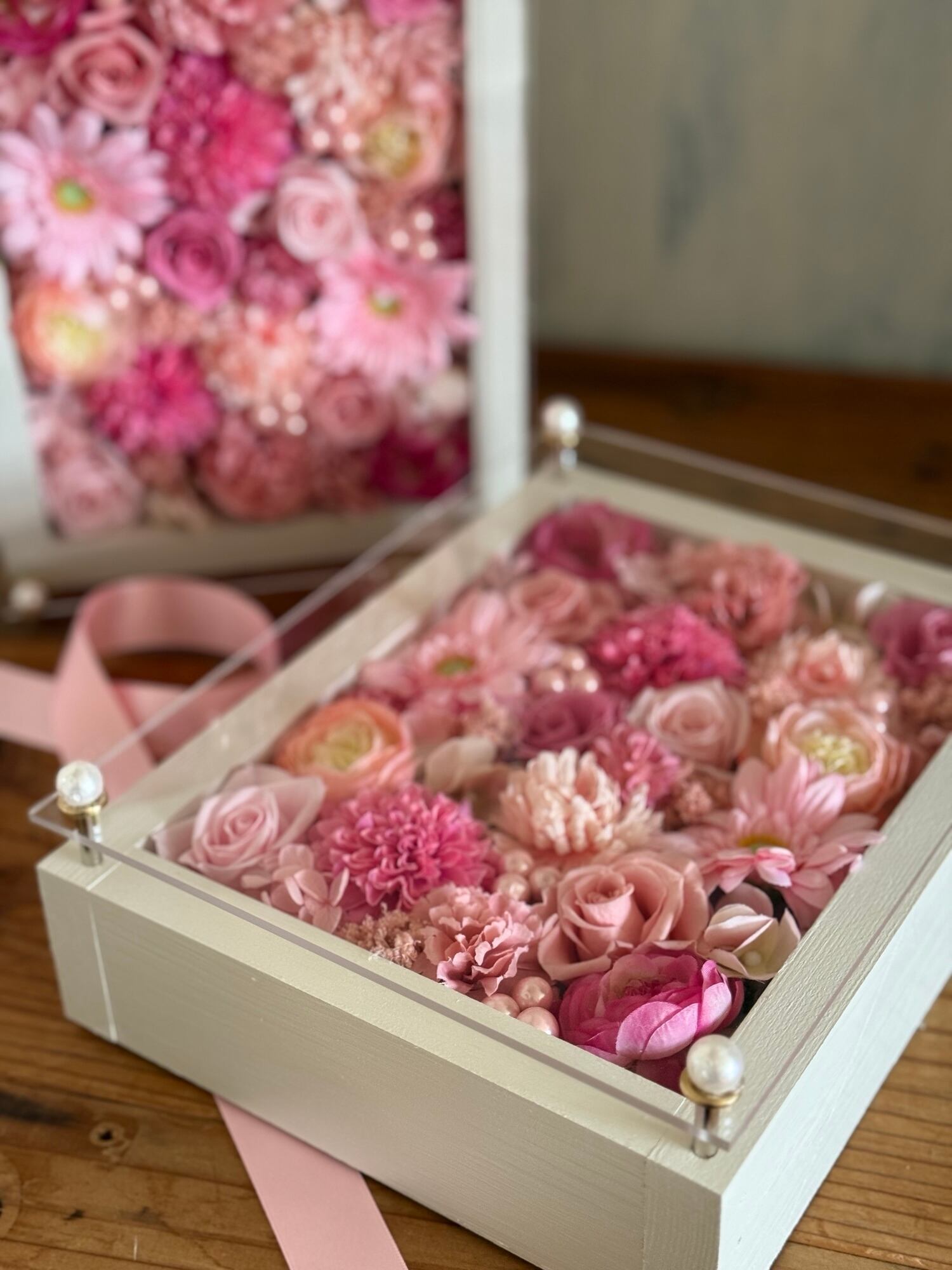 プリザーブドフラワーアレンジメントの美しい花々が、お二人からの感謝の気持ちを伝えます。