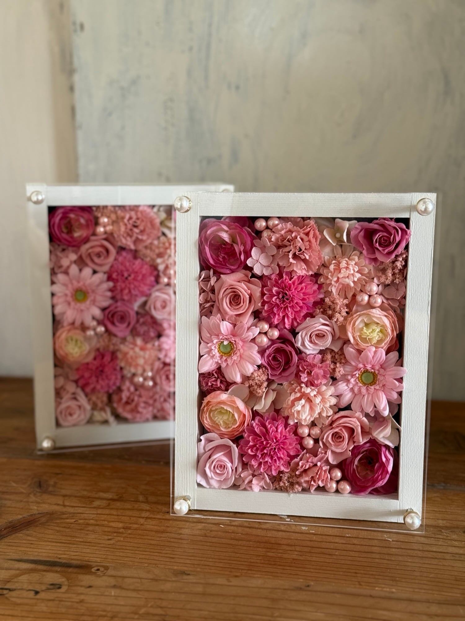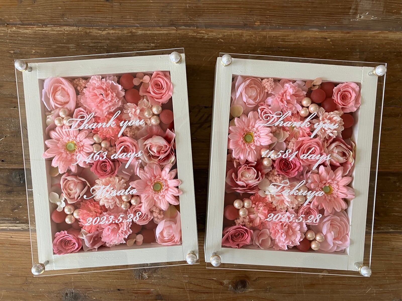 ウッドフレームにプリザーブドフラワーと造花をぎっしり詰め込み、アクリル板にはカッティングシートでお名前、挙式日、生まれてから今日までの日数などをお入れします
