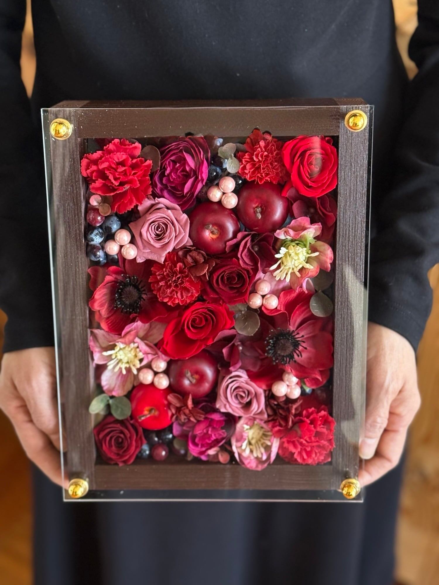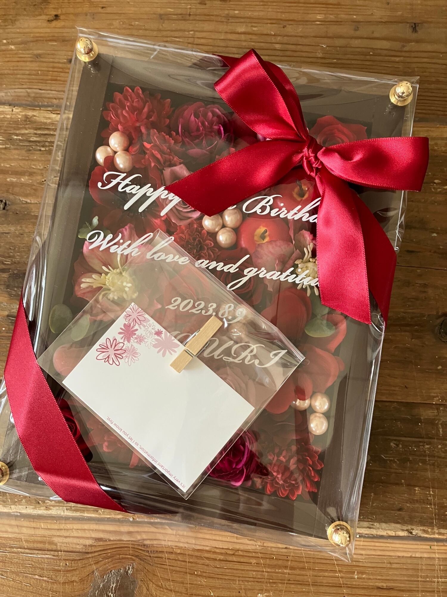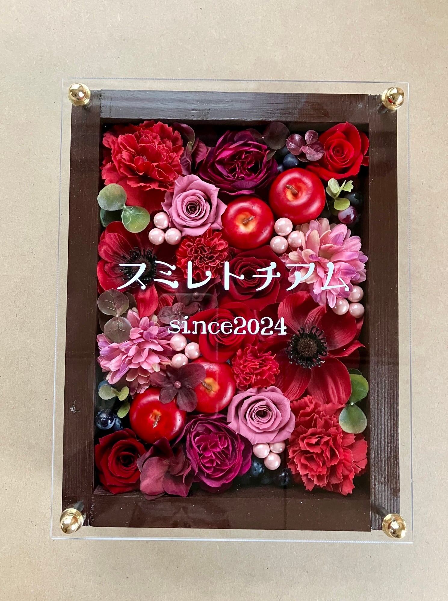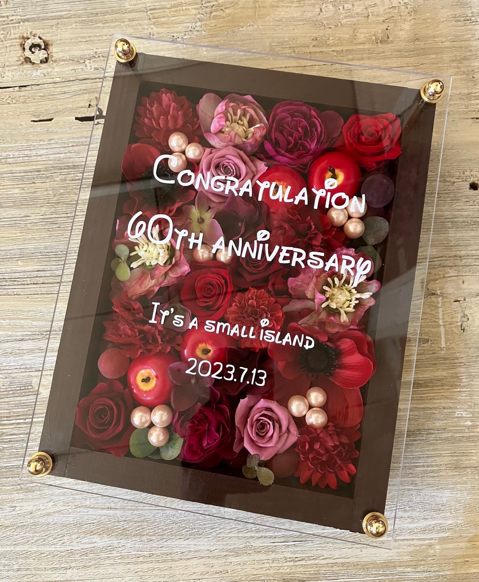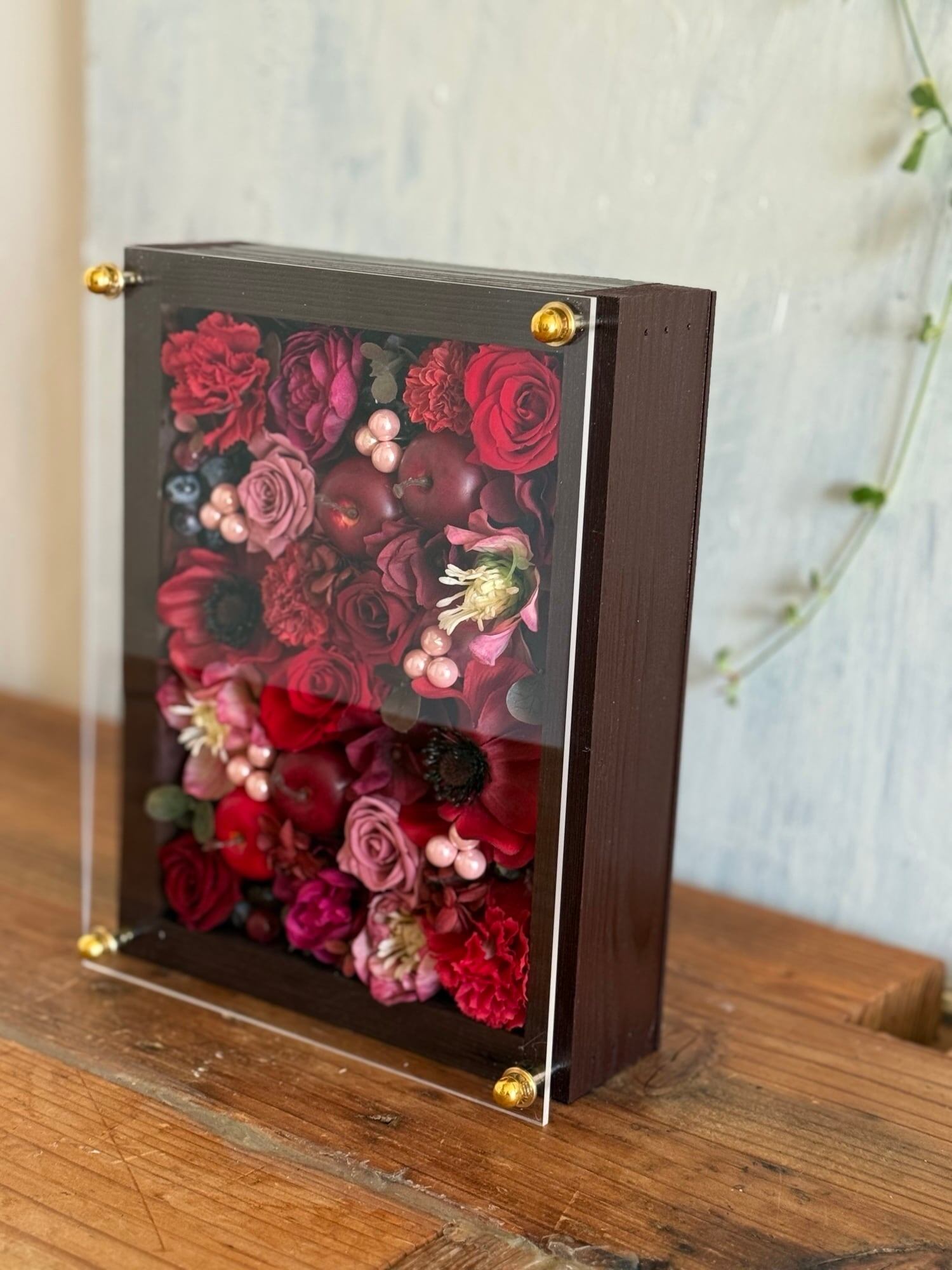茶色のウッドフレームにプリザーブドフラワーと造花をぎっしり詰め込み、アクリル板にはカッティングシートでメッセージをお入れします。