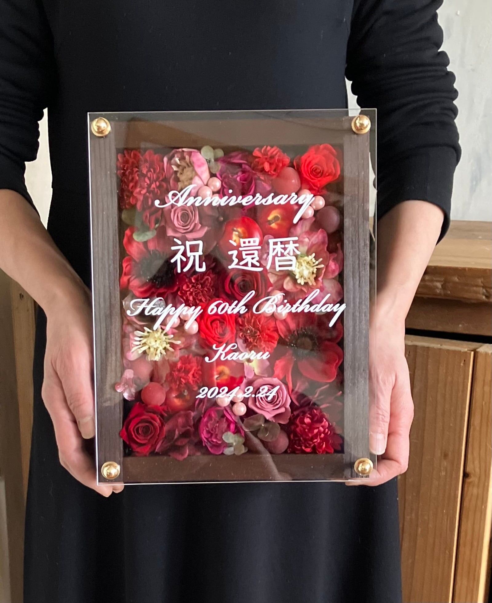還暦祝い・週年祝い・結婚記念日祝い・退職祝い【名入れ】プリザーブドフラワーアレンジ ウッドフレーム 茶木枠〈レッド〉