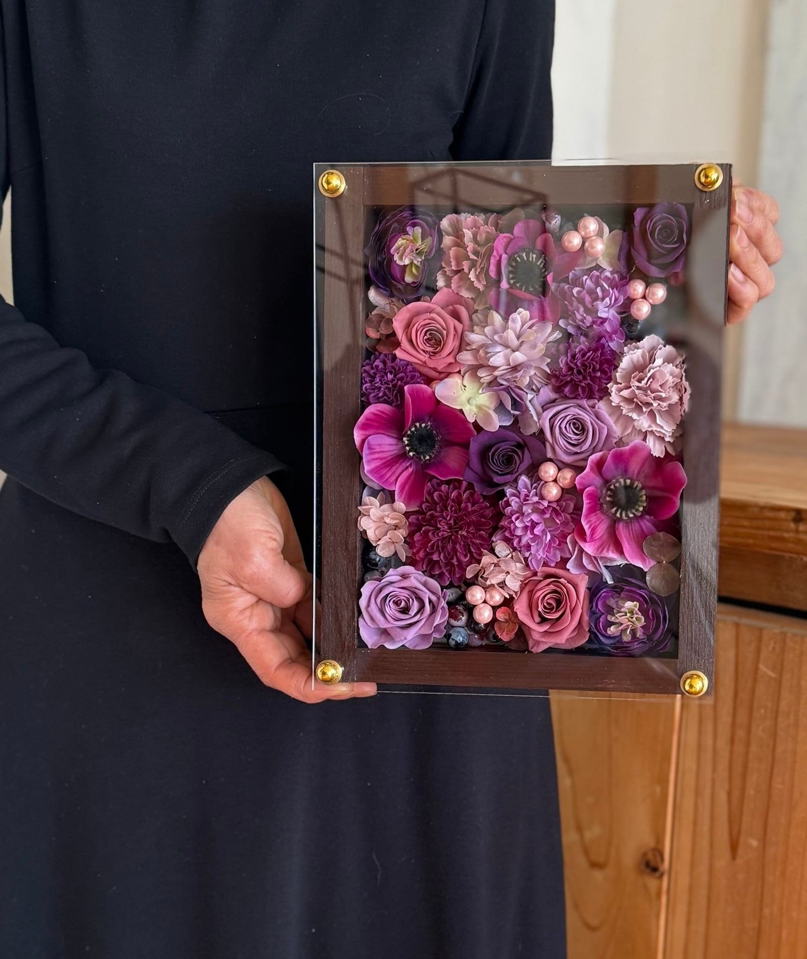 茶色のウッドフレームにプリザーブドフラワーと造花をぎっしり詰め込み、アクリル板にはカッティングシートでメッセージをお入れします。