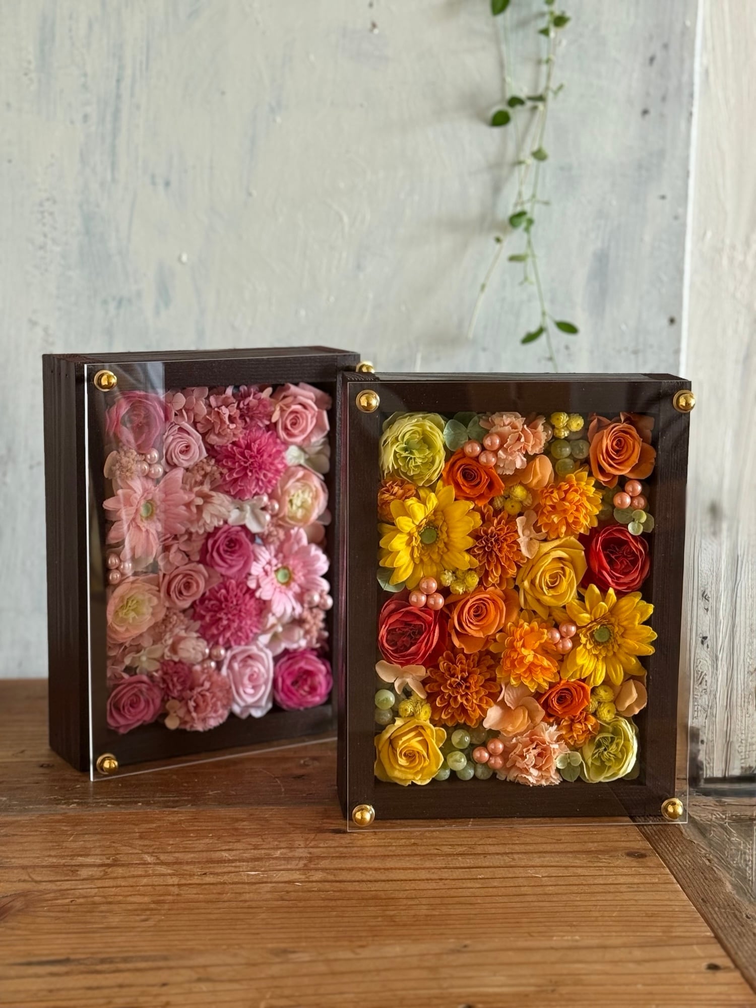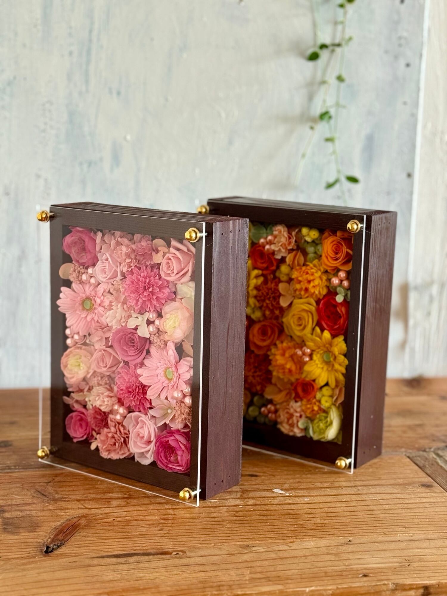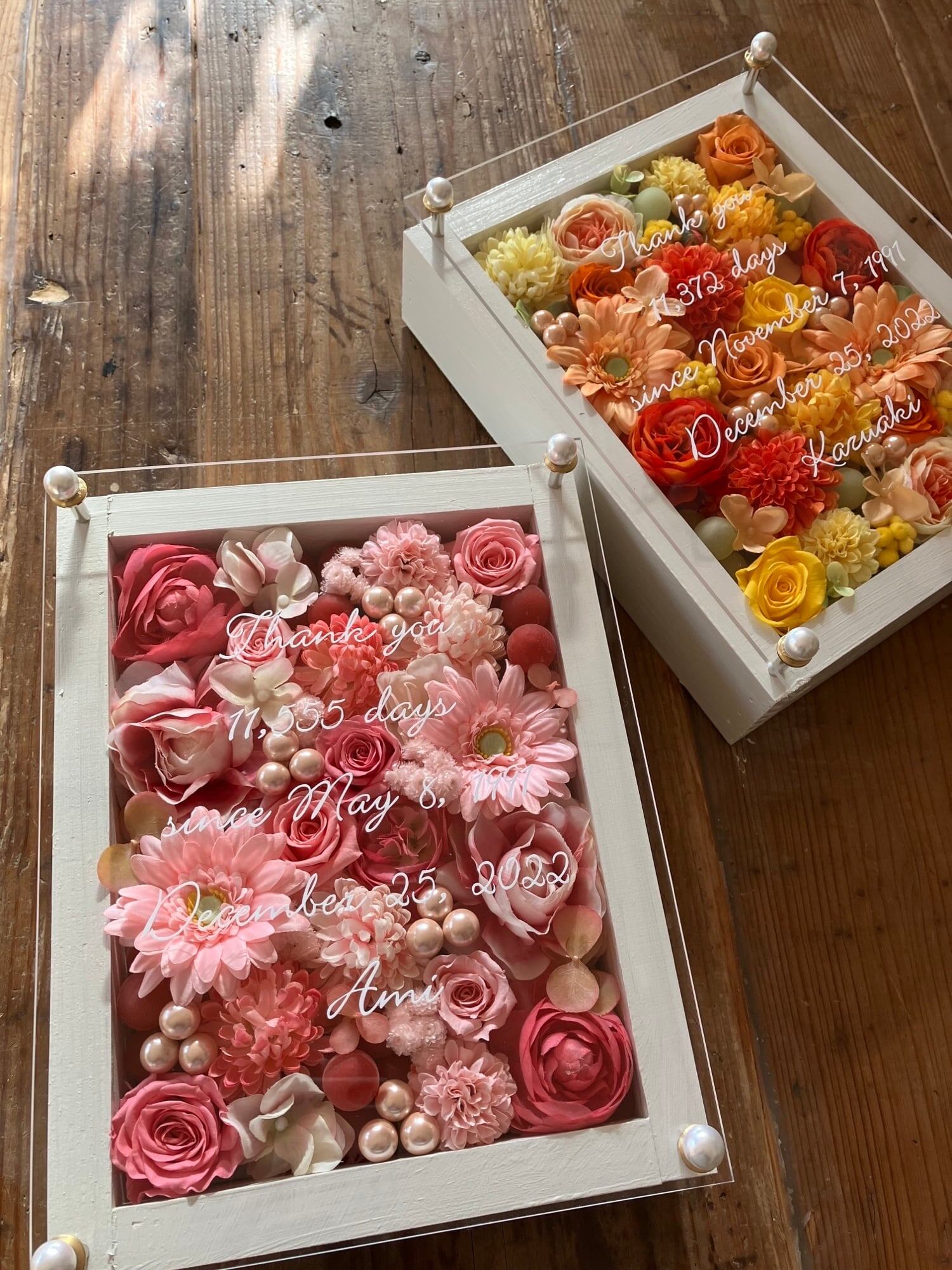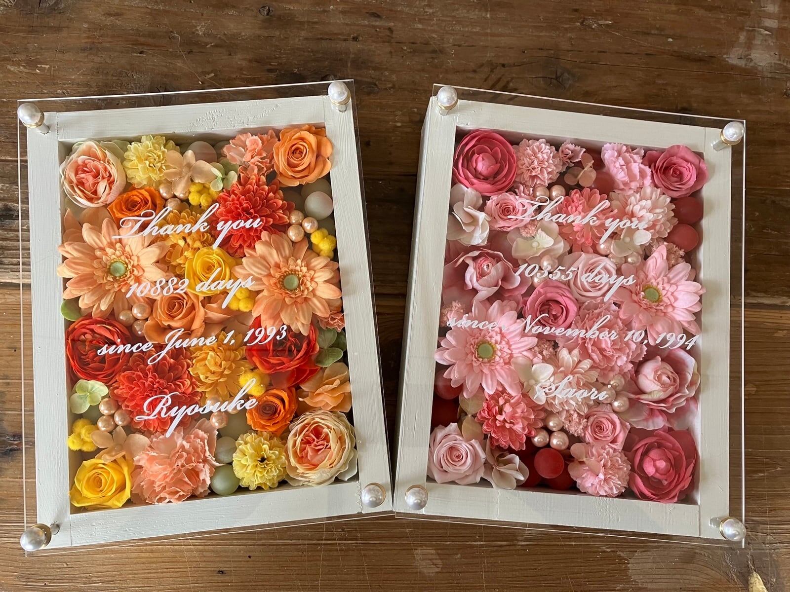 ウッドフレームにプリザーブドフラワーと造花をぎっしり詰め込み、アクリル板にはカッティングシートでお名前、挙式日、生まれてから今日までの日数などをお入れします