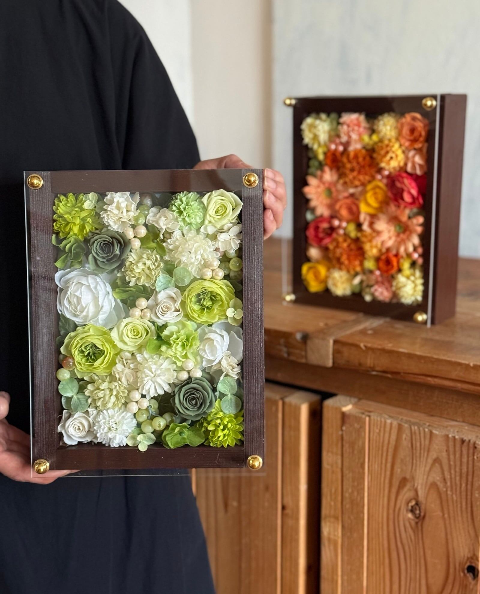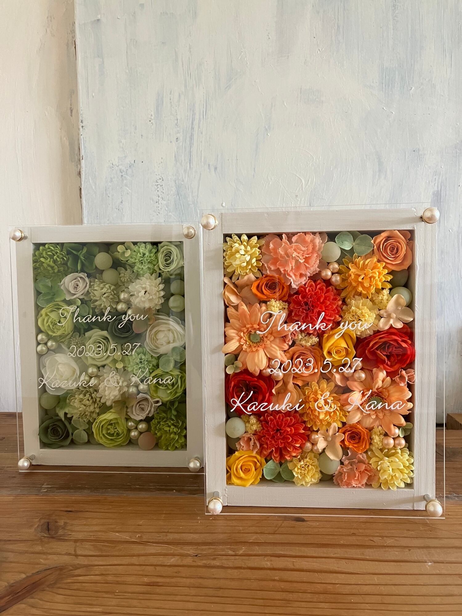 子育て感謝状・両親贈呈品 2個セット【名入れ】プリザーブドフラワーアレンジ ウッドフレーム〈イエローオレンジ&白グリーン〉結婚式 ギフト