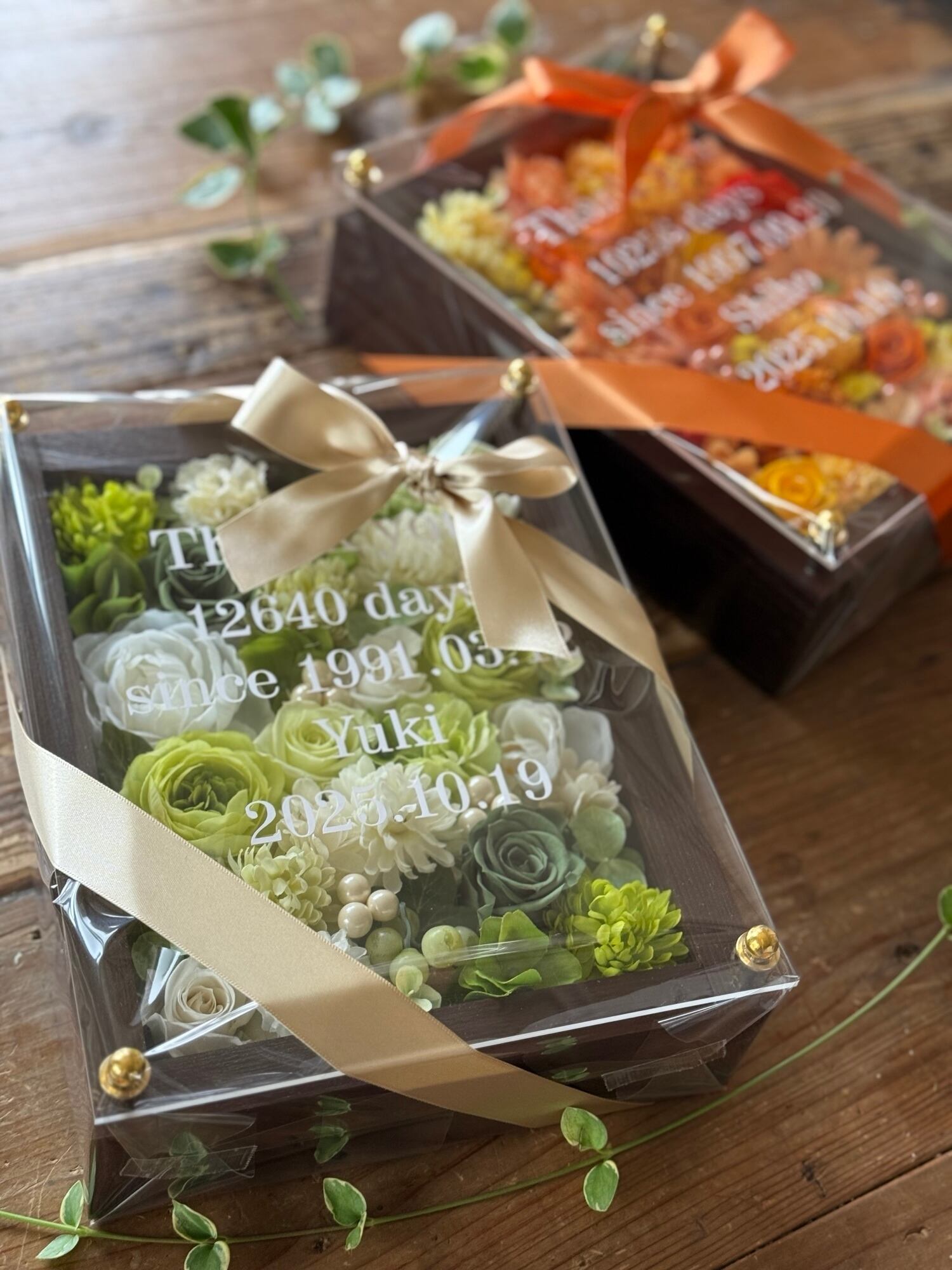 ウッドフレームにプリザーブドフラワーと造花をぎっしり詰め込み、アクリル板にはカッティングシートでお名前、挙式日、生まれてから今日までの日数などをお入れします。