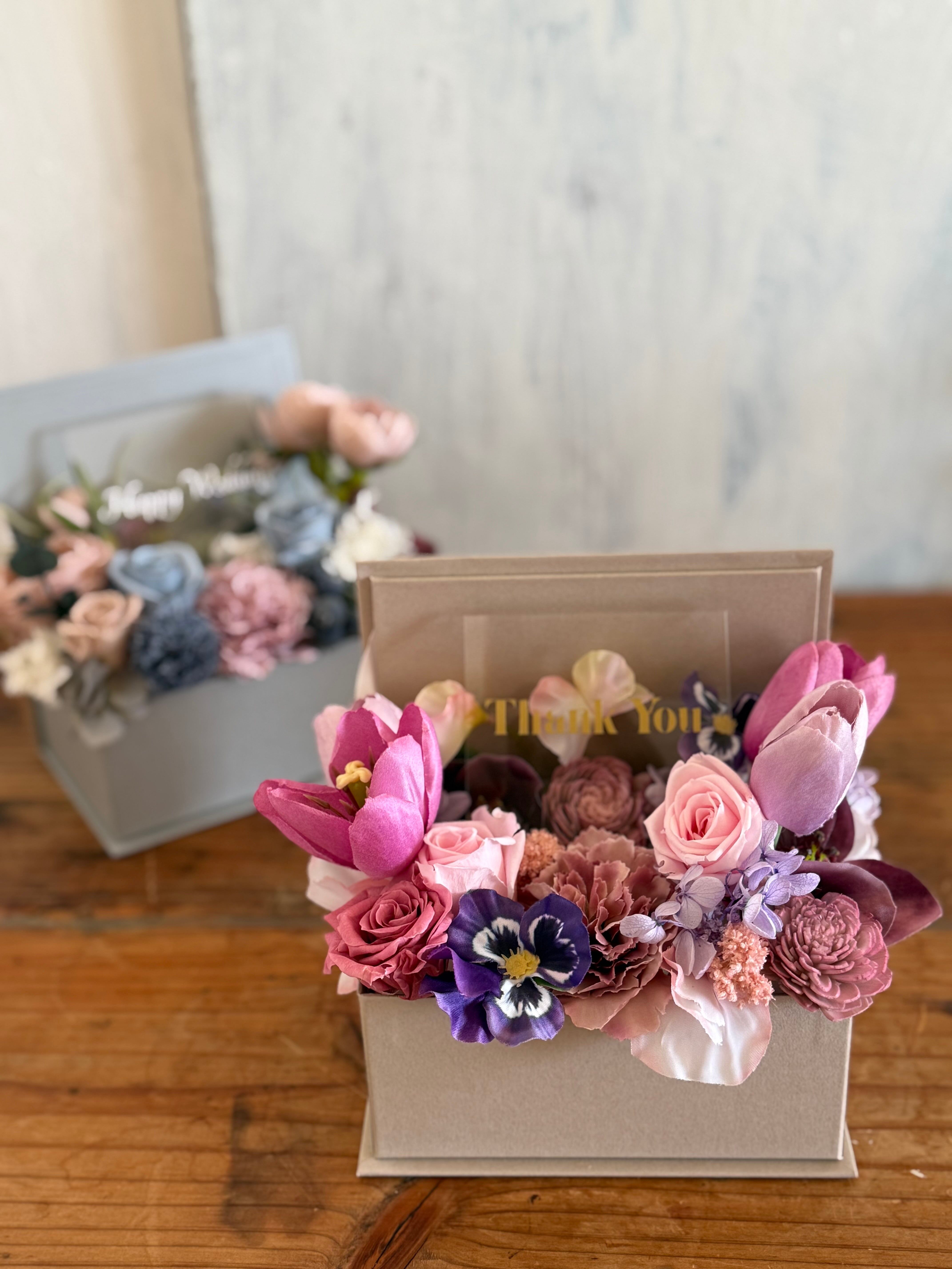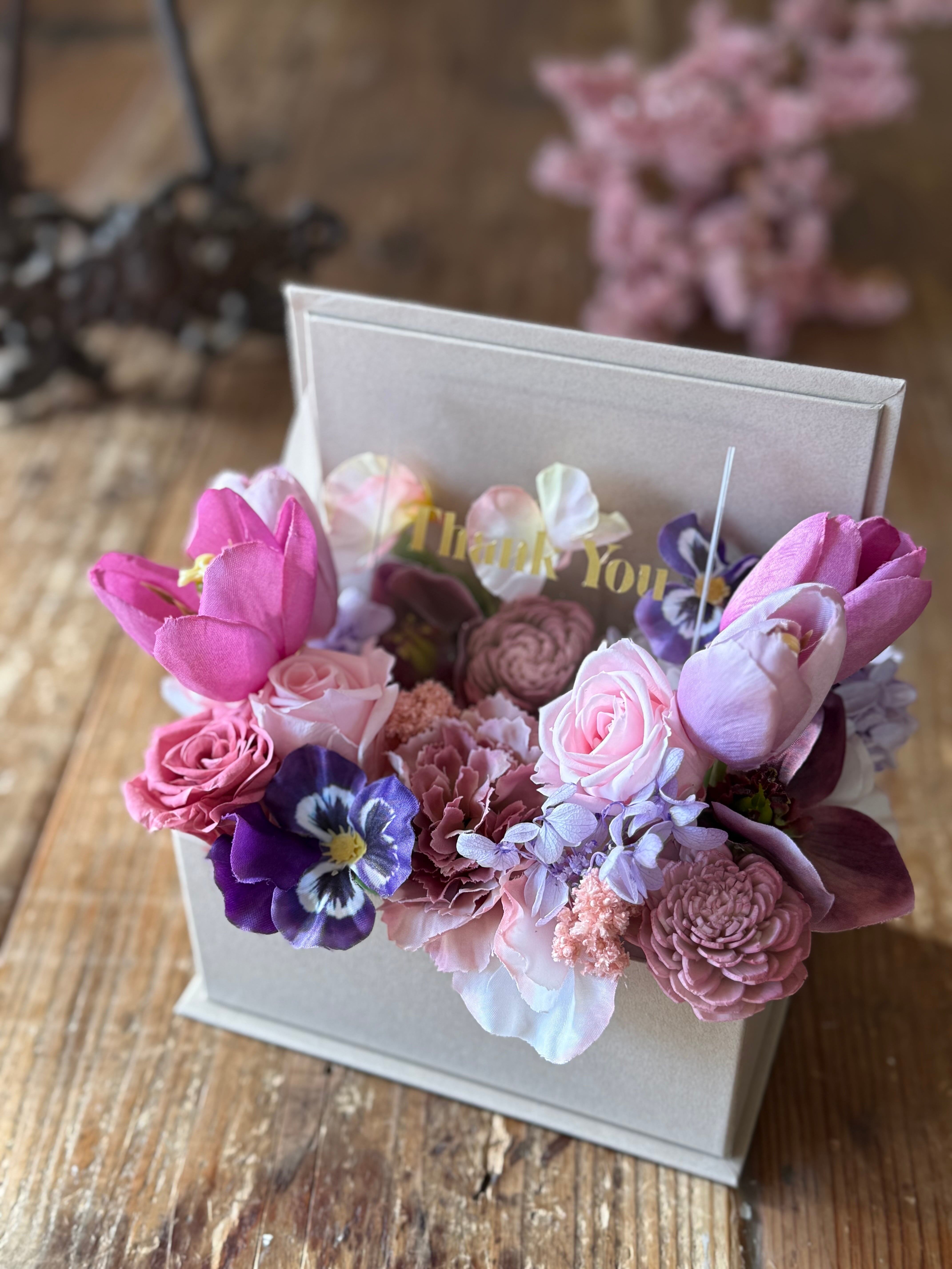 春のお花をまとめたシックピンクのボックスアレンジ