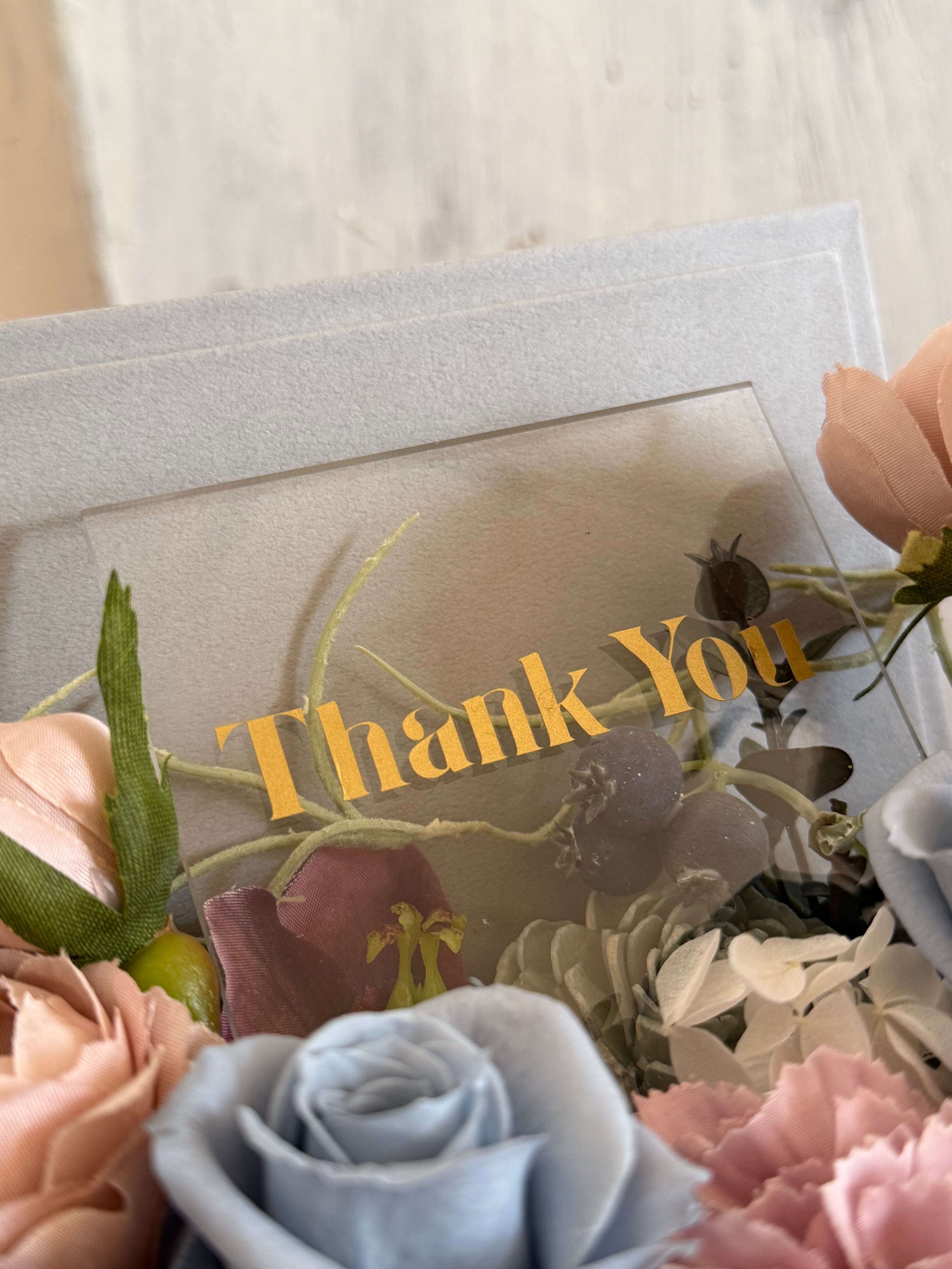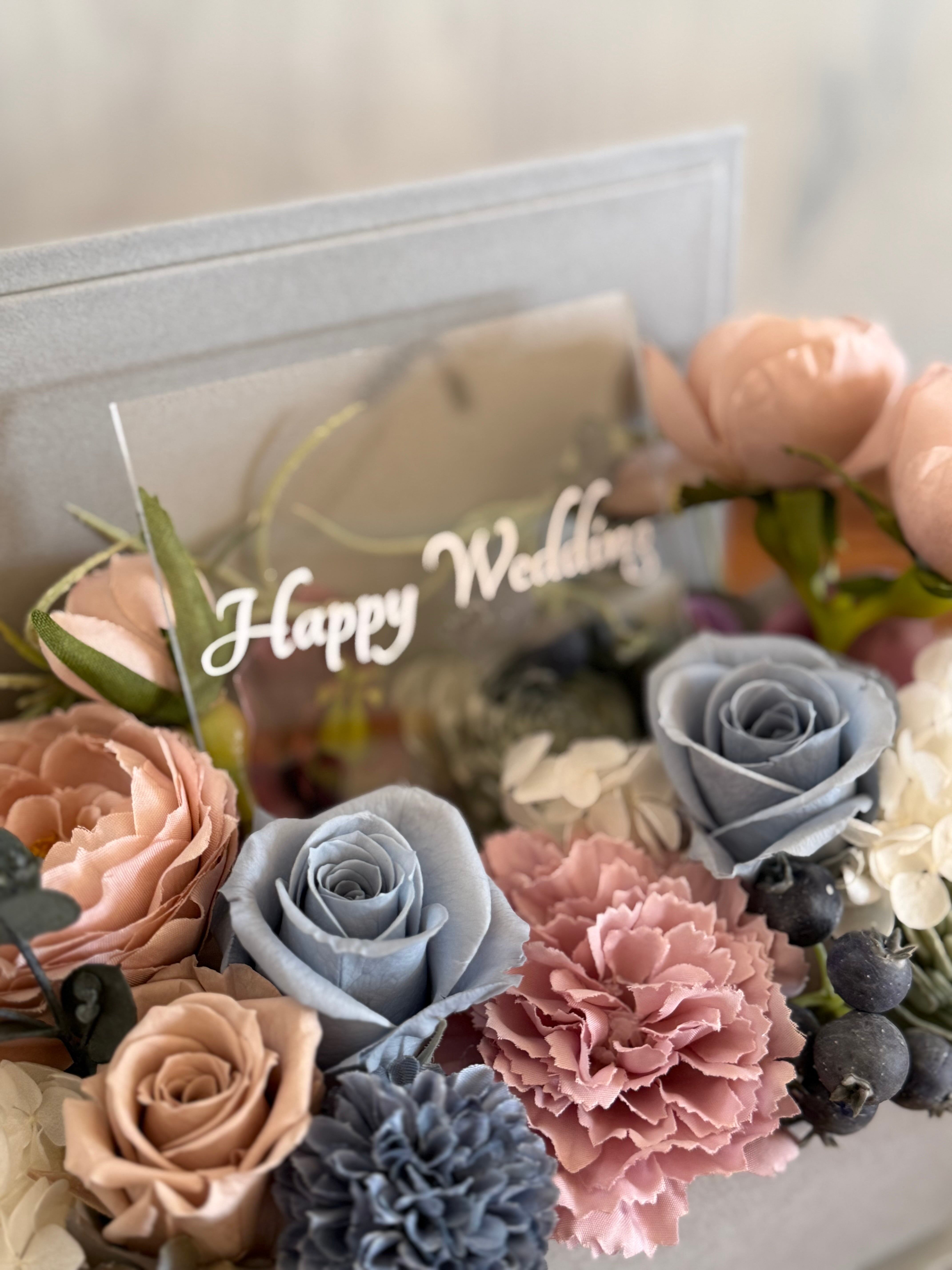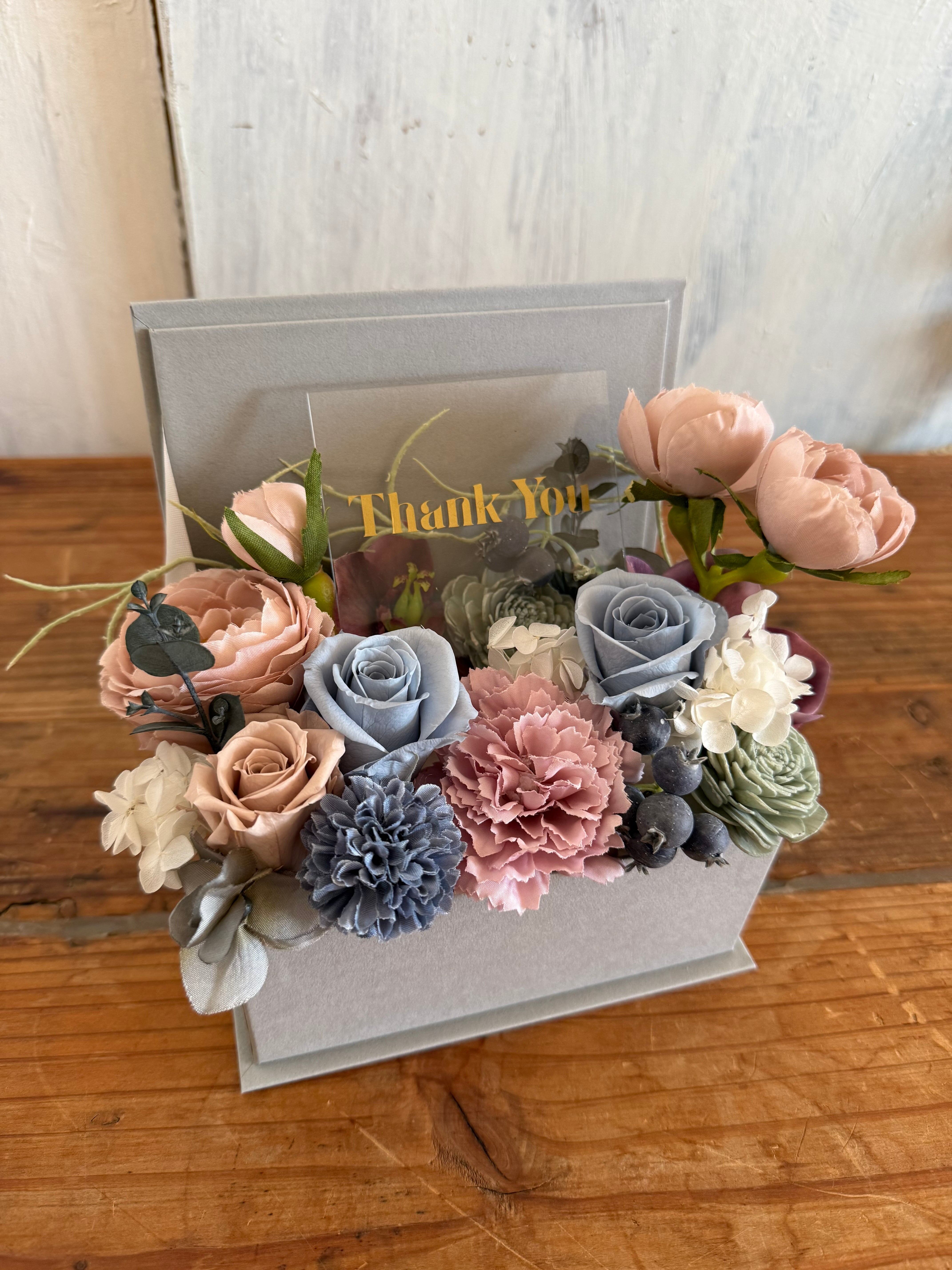 結婚祝い 退職祝い 母の日フラワーギフト 開店祝い【名入れ】プリザーブドフラワーアレンジ ボックスアレンジ〈ブルーグレー〉