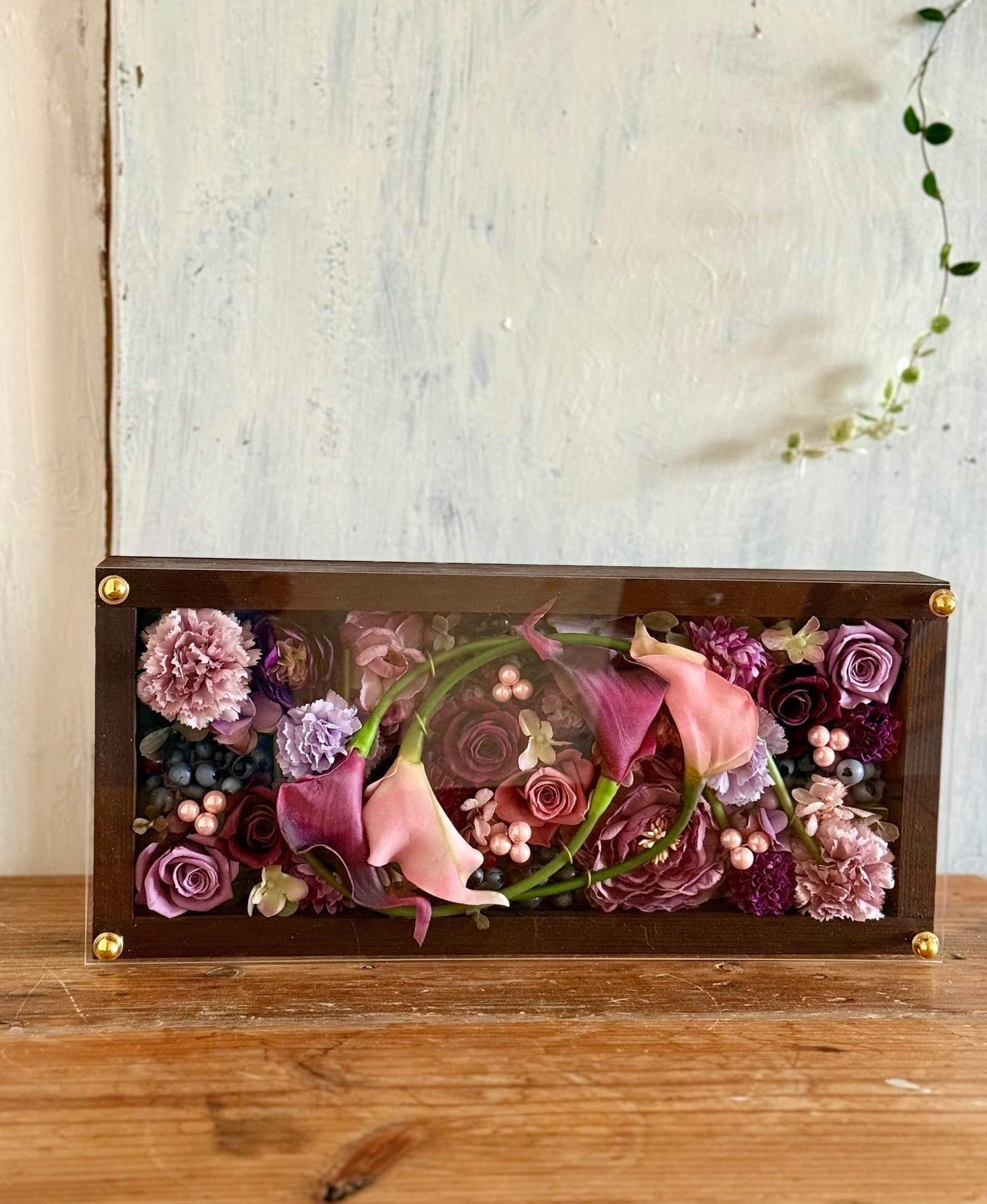 茶色のロングサイズのウッドフレームにプリザーブドフラワーと造花をぎっしり詰め込み、アクリル板にはカッティングシートでメッセージをお入れします。