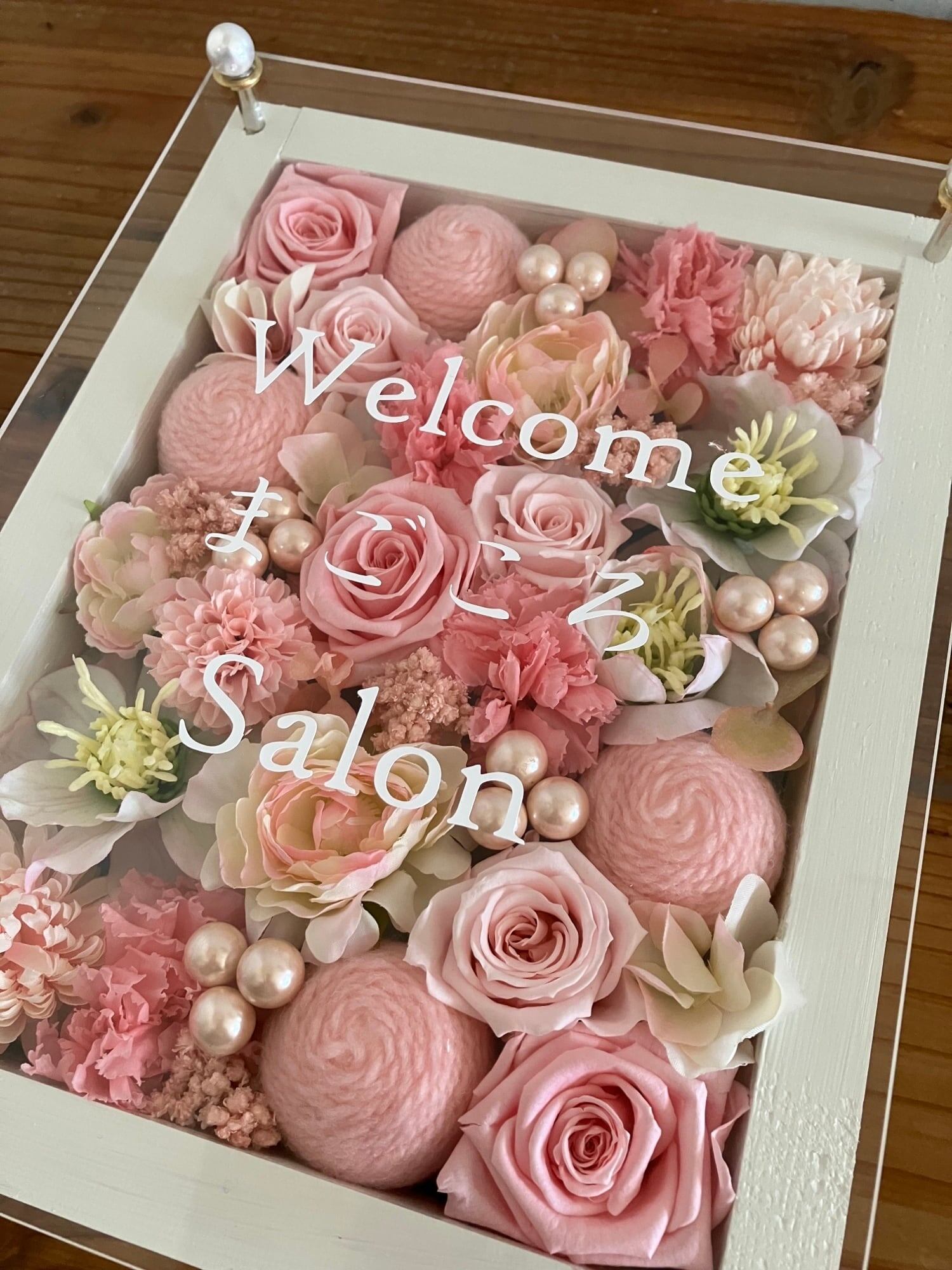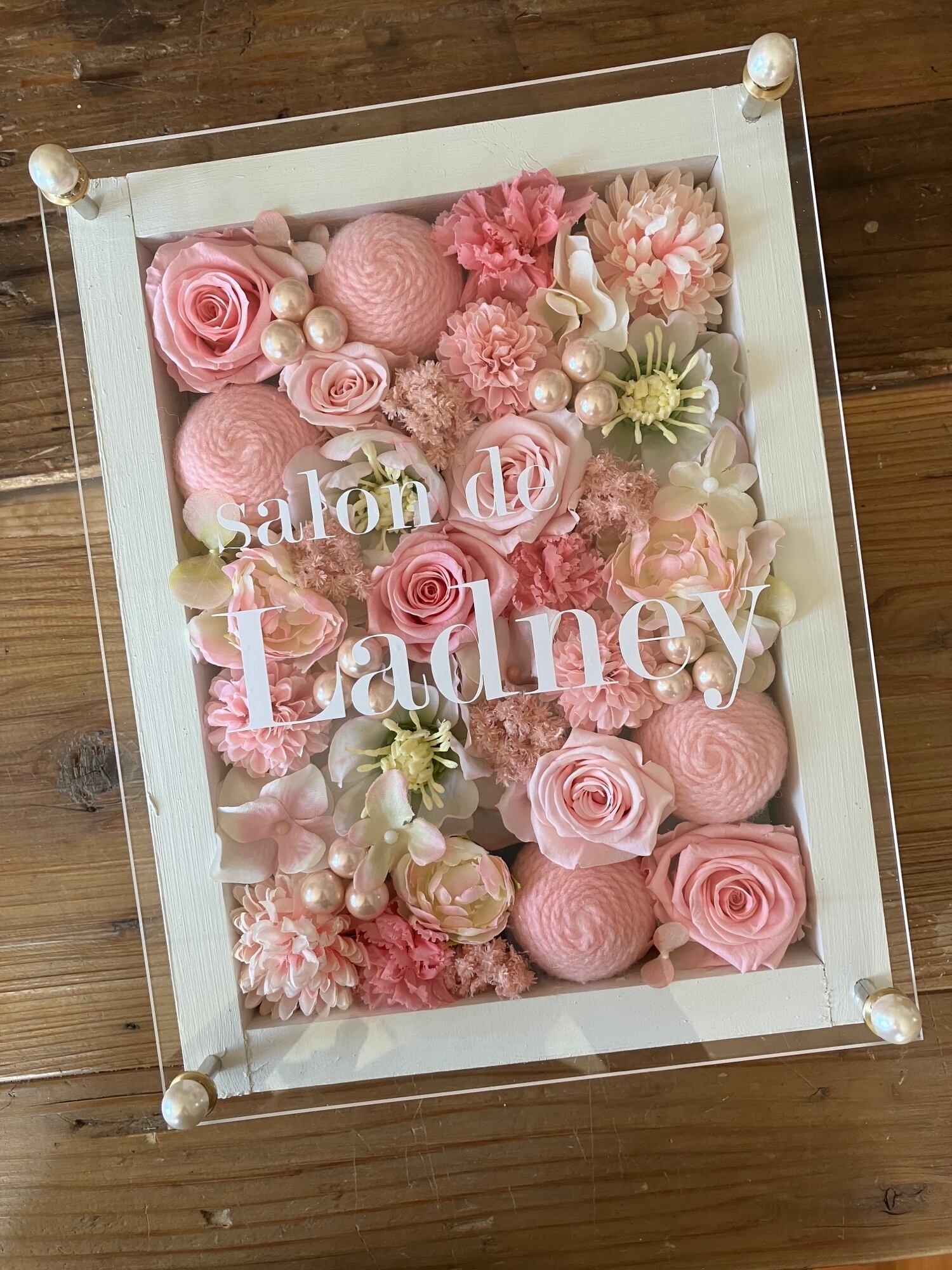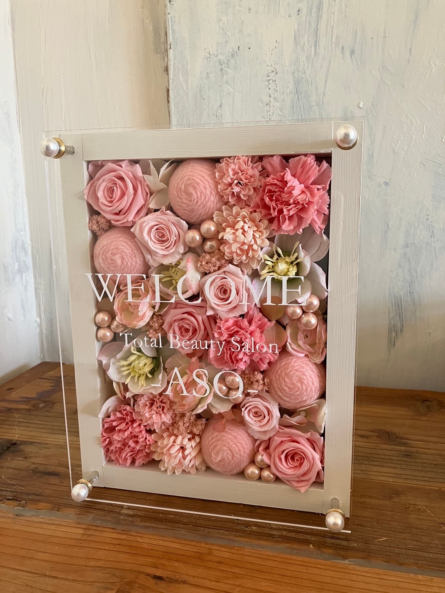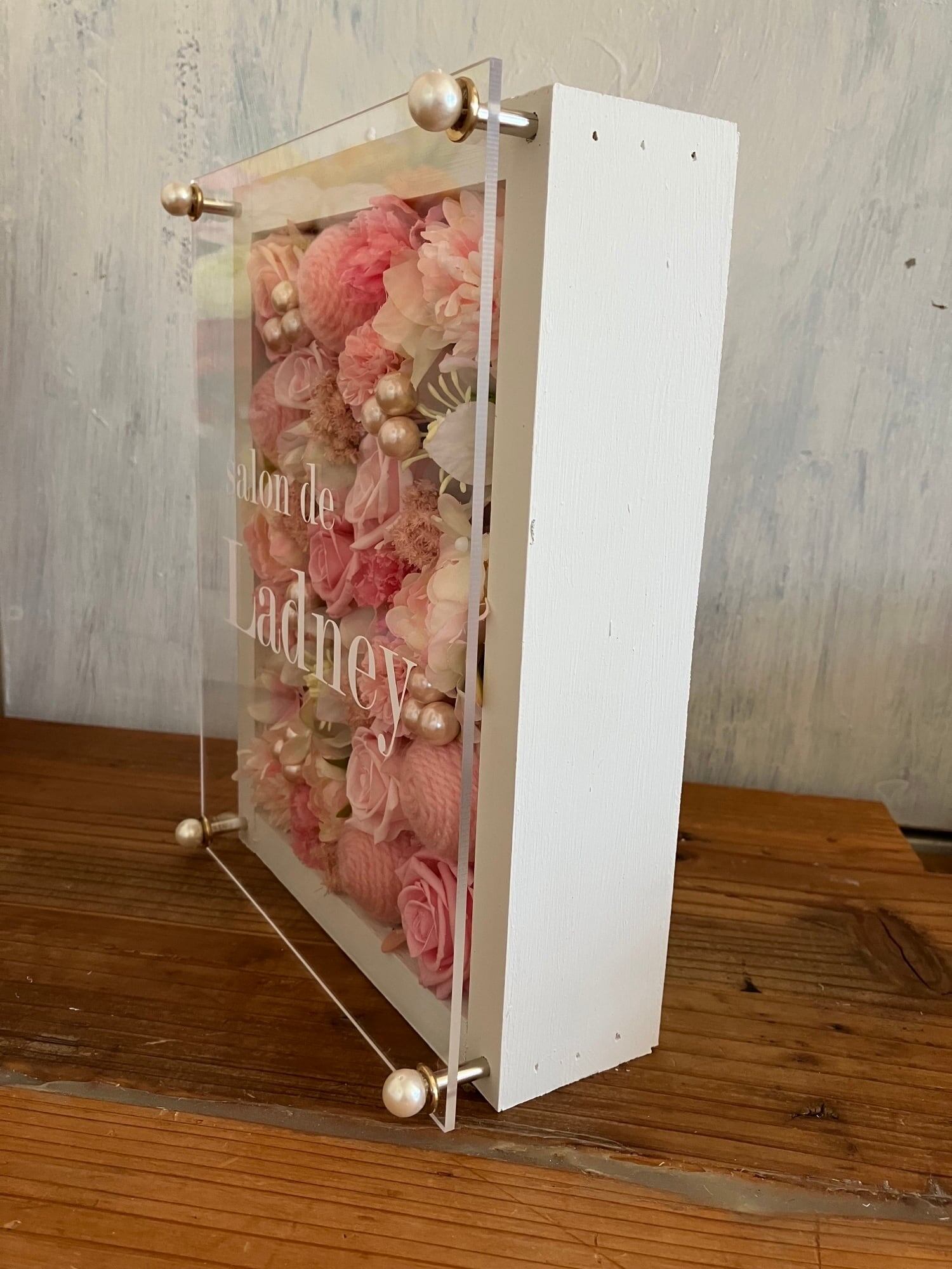 白色のウッドフレームにプリザーブドフラワーと造花をぎっしり詰め込み、アクリル板にはカッティングシートでメッセージをお入れします。