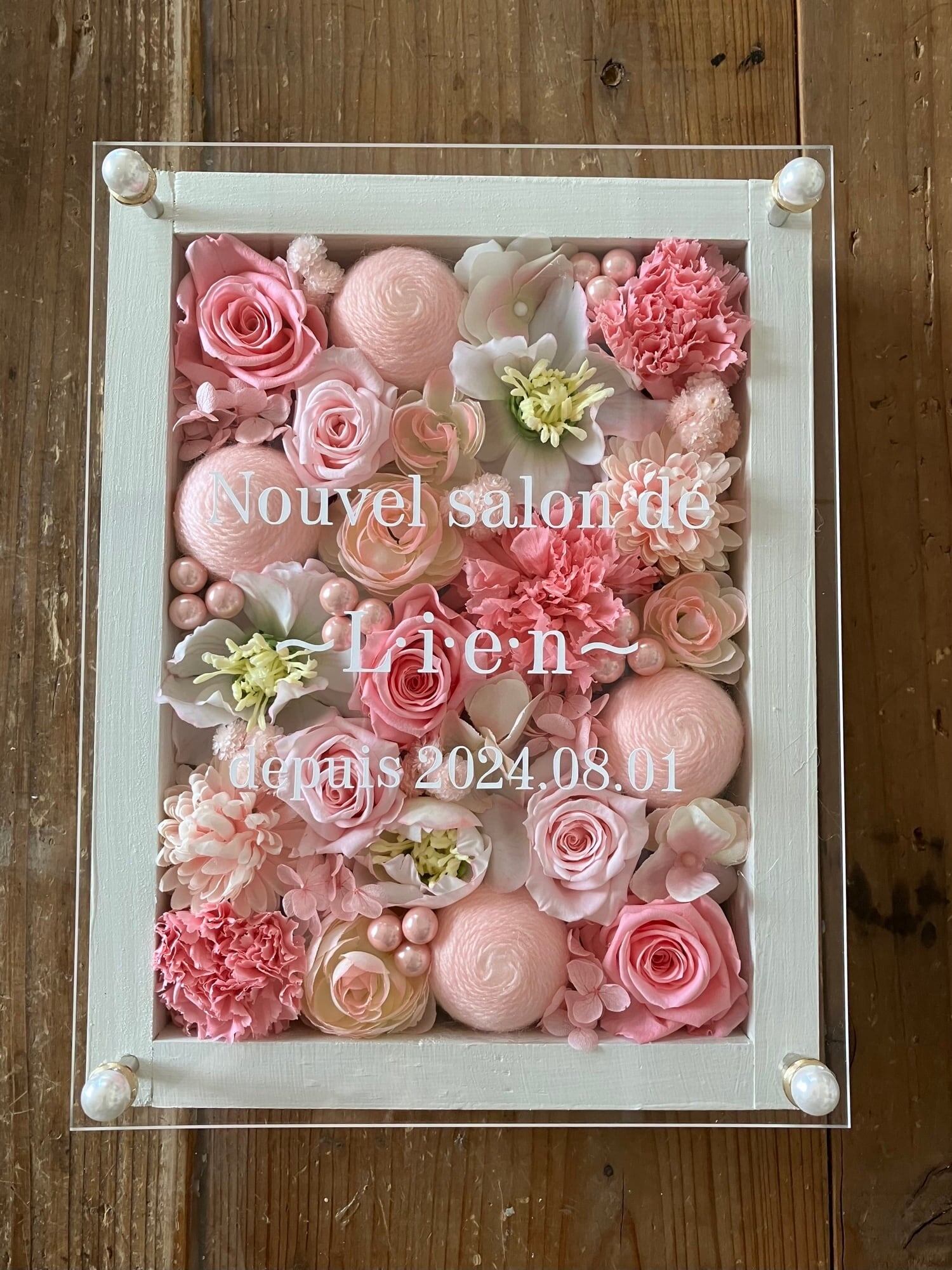 開店祝い・サロンオープン祝い・還暦祝い【名入れ】プリザーブドフラワーアレンジ ウッドフレーム 白木枠〈ライトピンク〉プライム