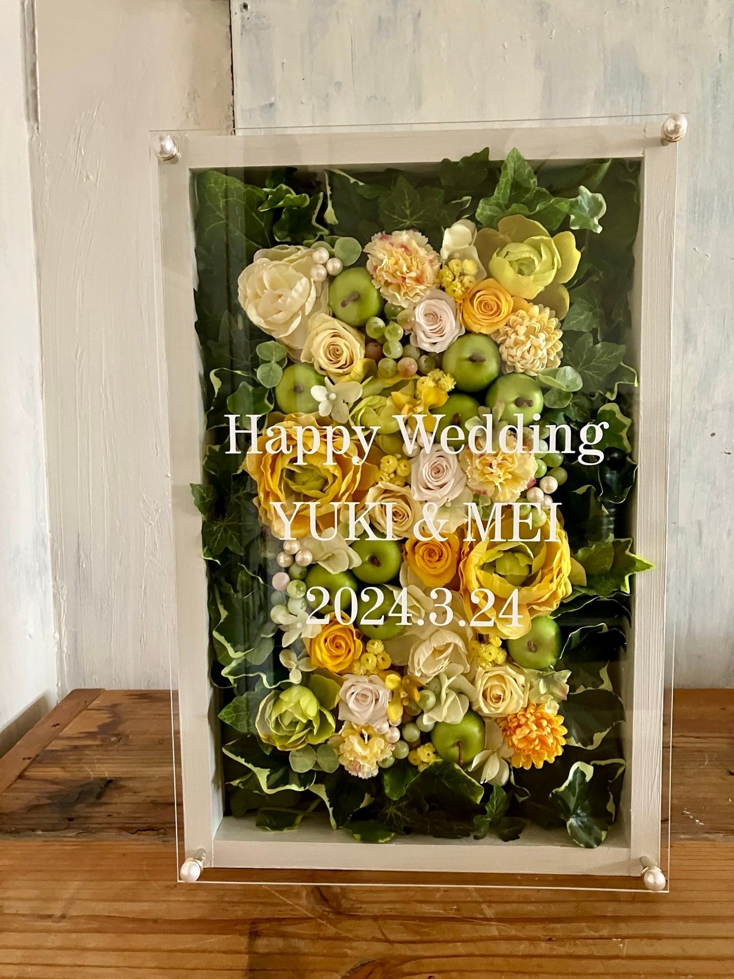 結婚祝い・退職祝い・ウェルカムボード【名入れ】プリザーブドフラワーアレンジ ウッドフレーム・大きい白木枠 アイビー〈イエロー〉