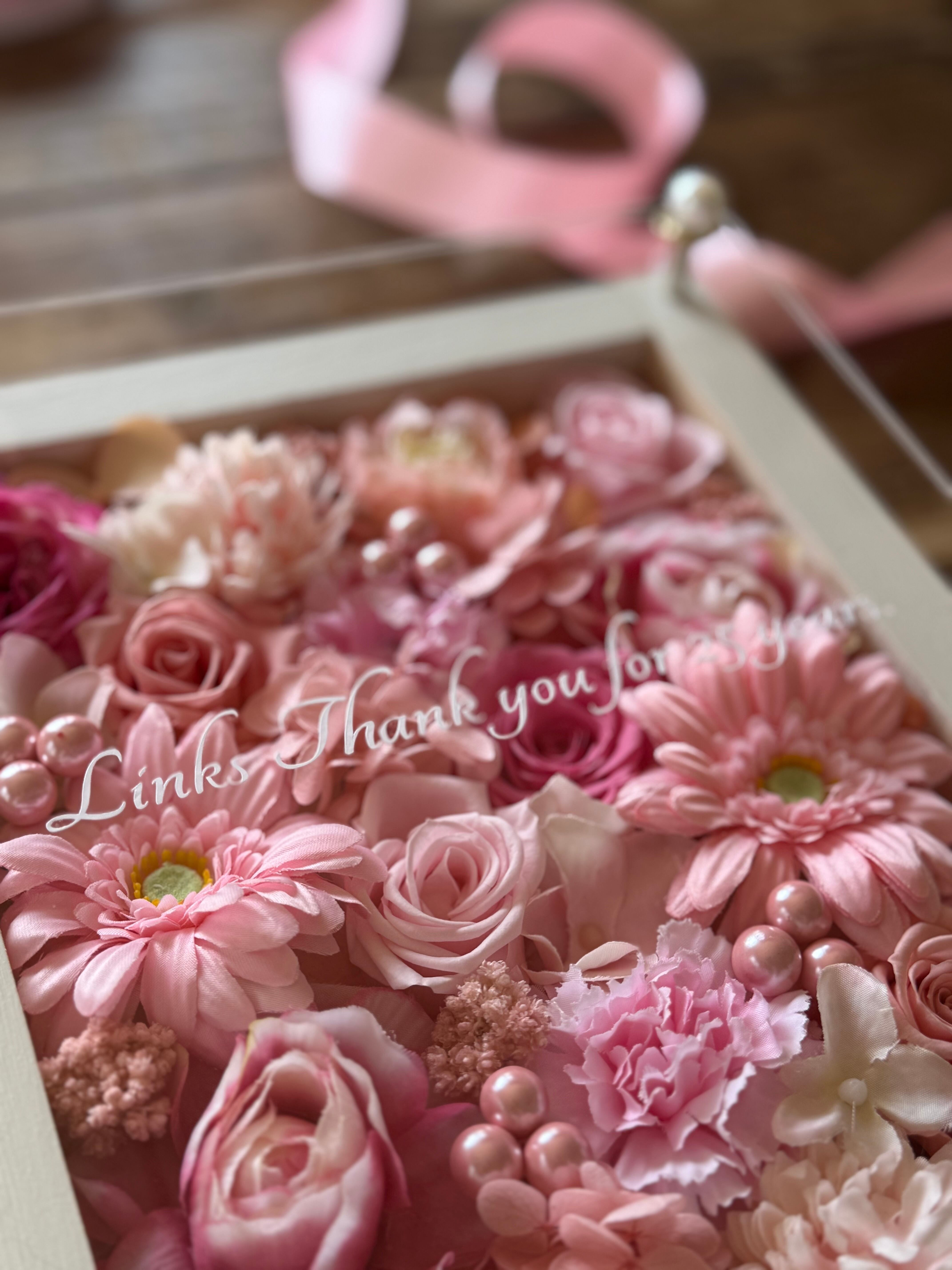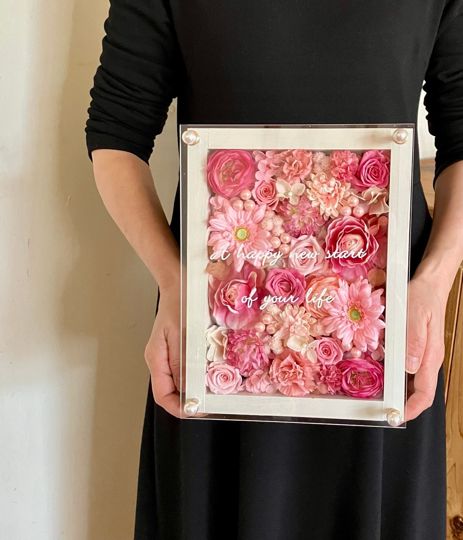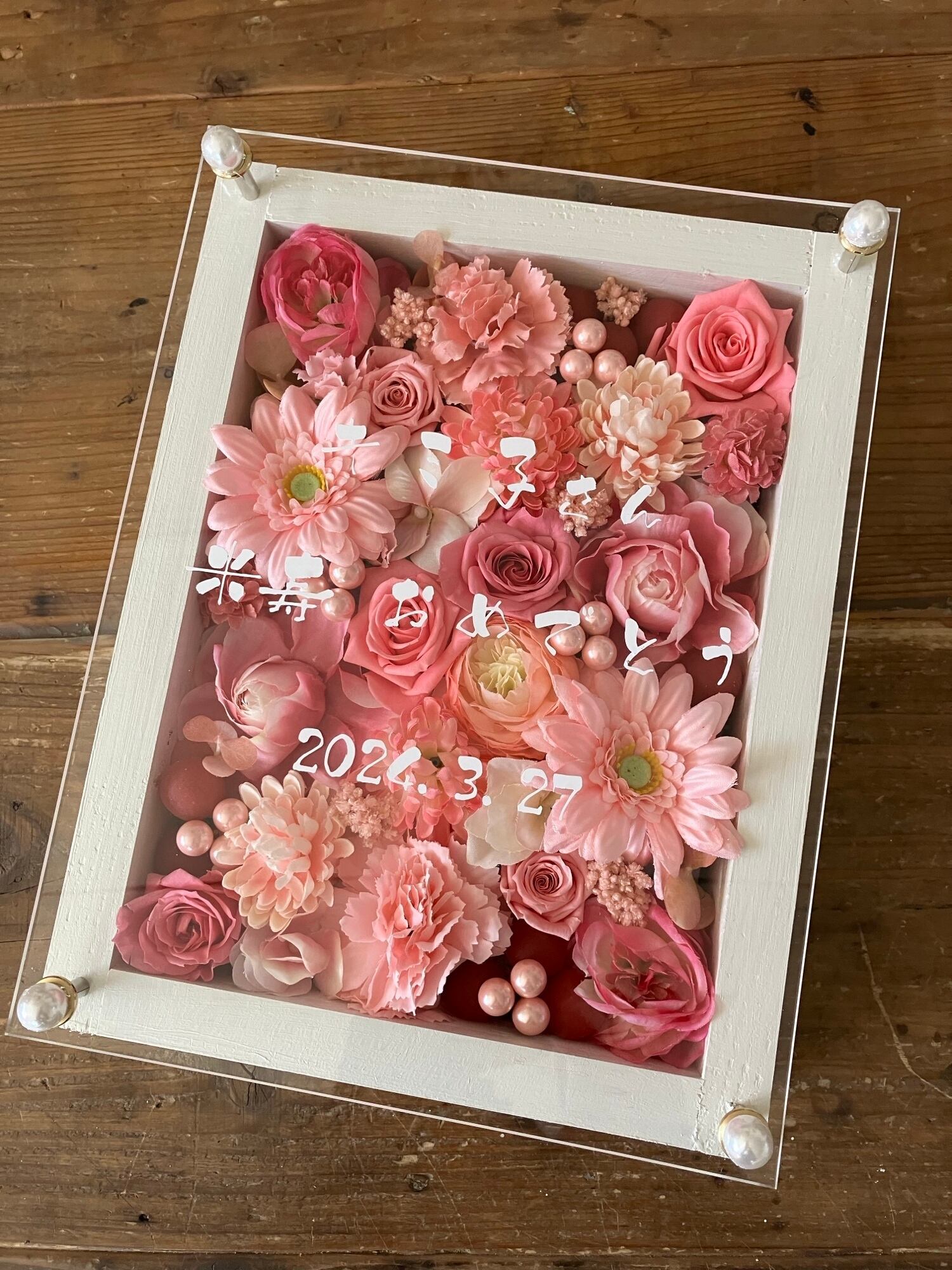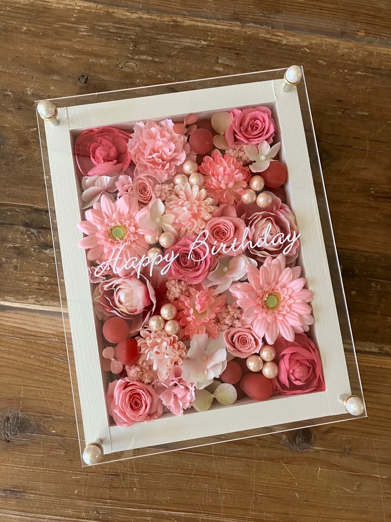 白色のウッドフレームにプリザーブドフラワーと造花をぎっしり詰め込み、アクリル板にはカッティングシートでメッセージをお入れします。