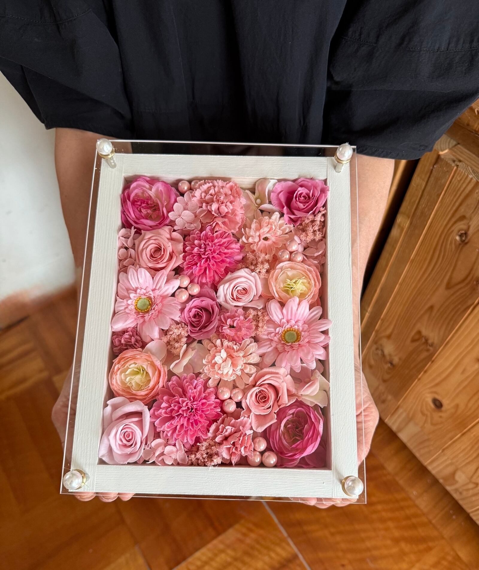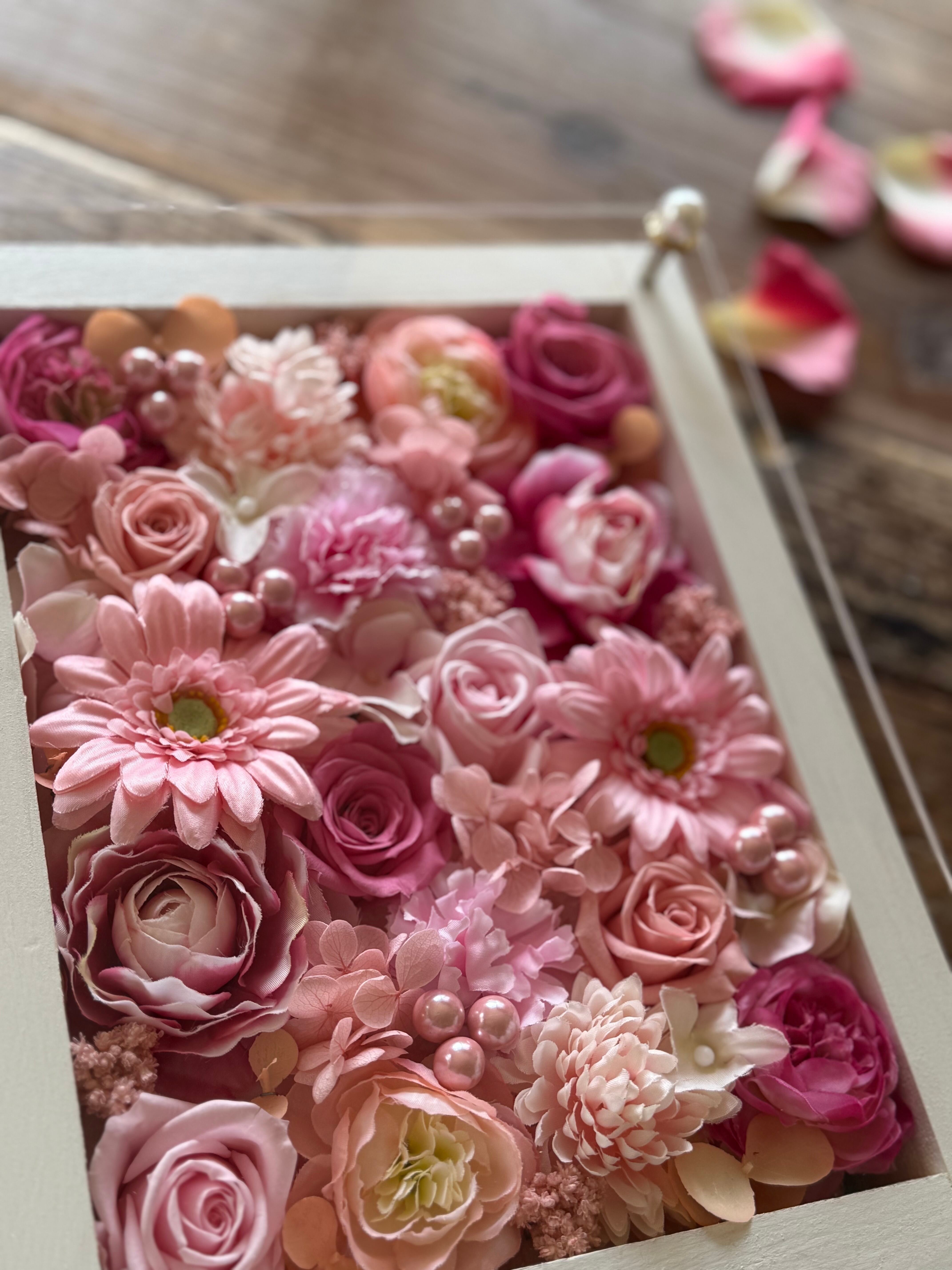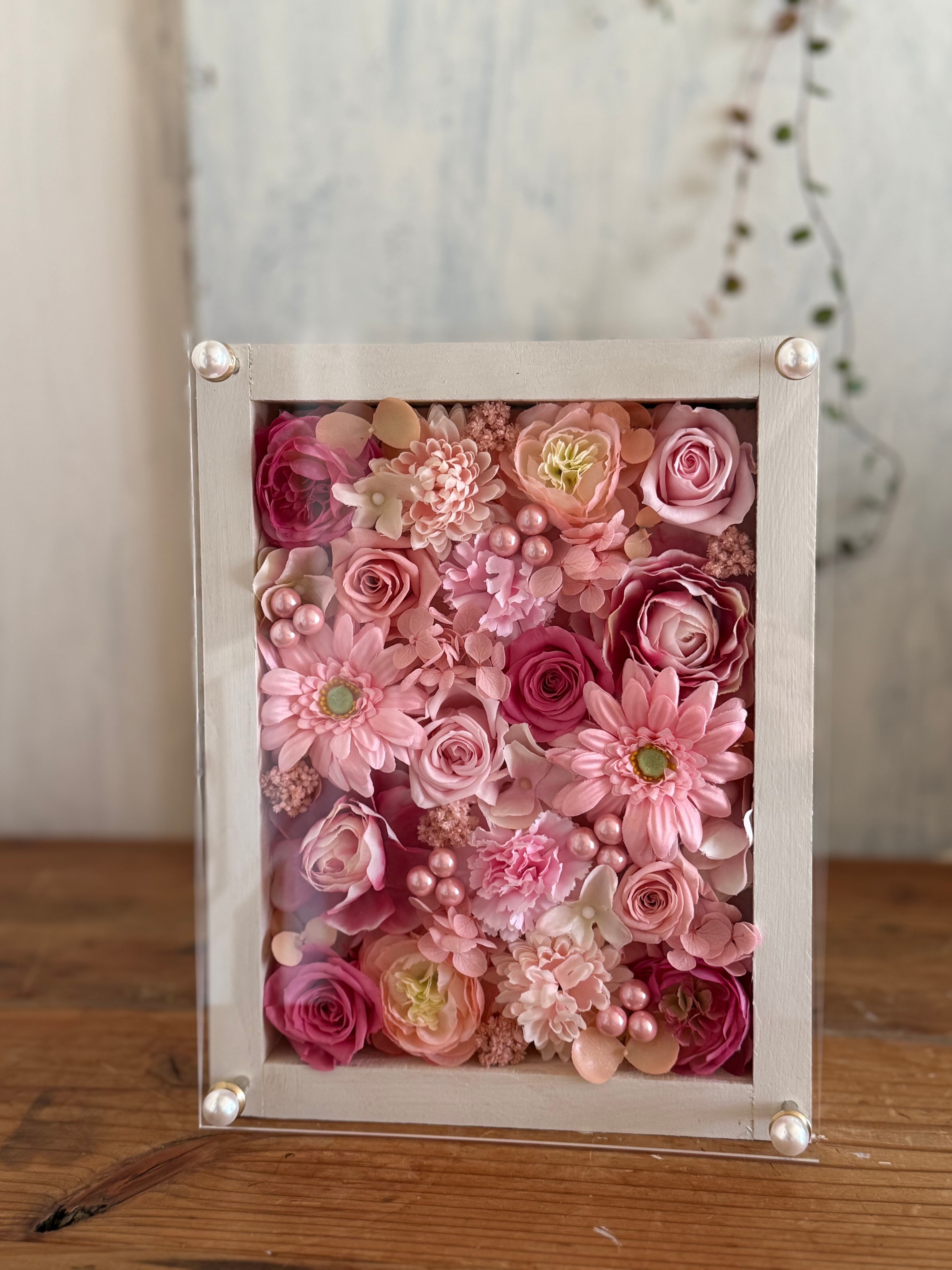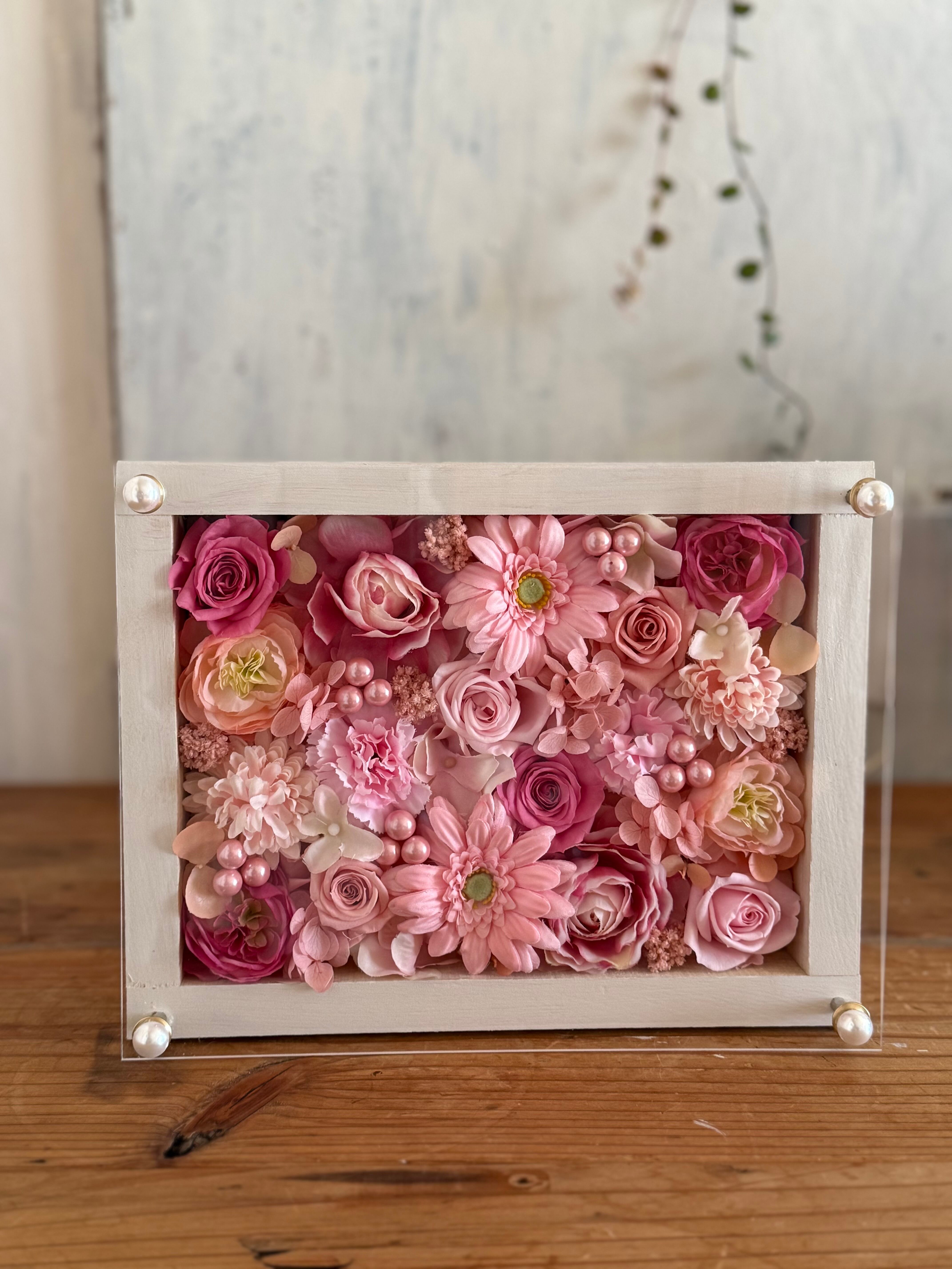 白色のウッドフレームにプリザーブドフラワーと造花をぎっしり詰め込み、アクリル板にはカッティングシートでメッセージをお入れします。