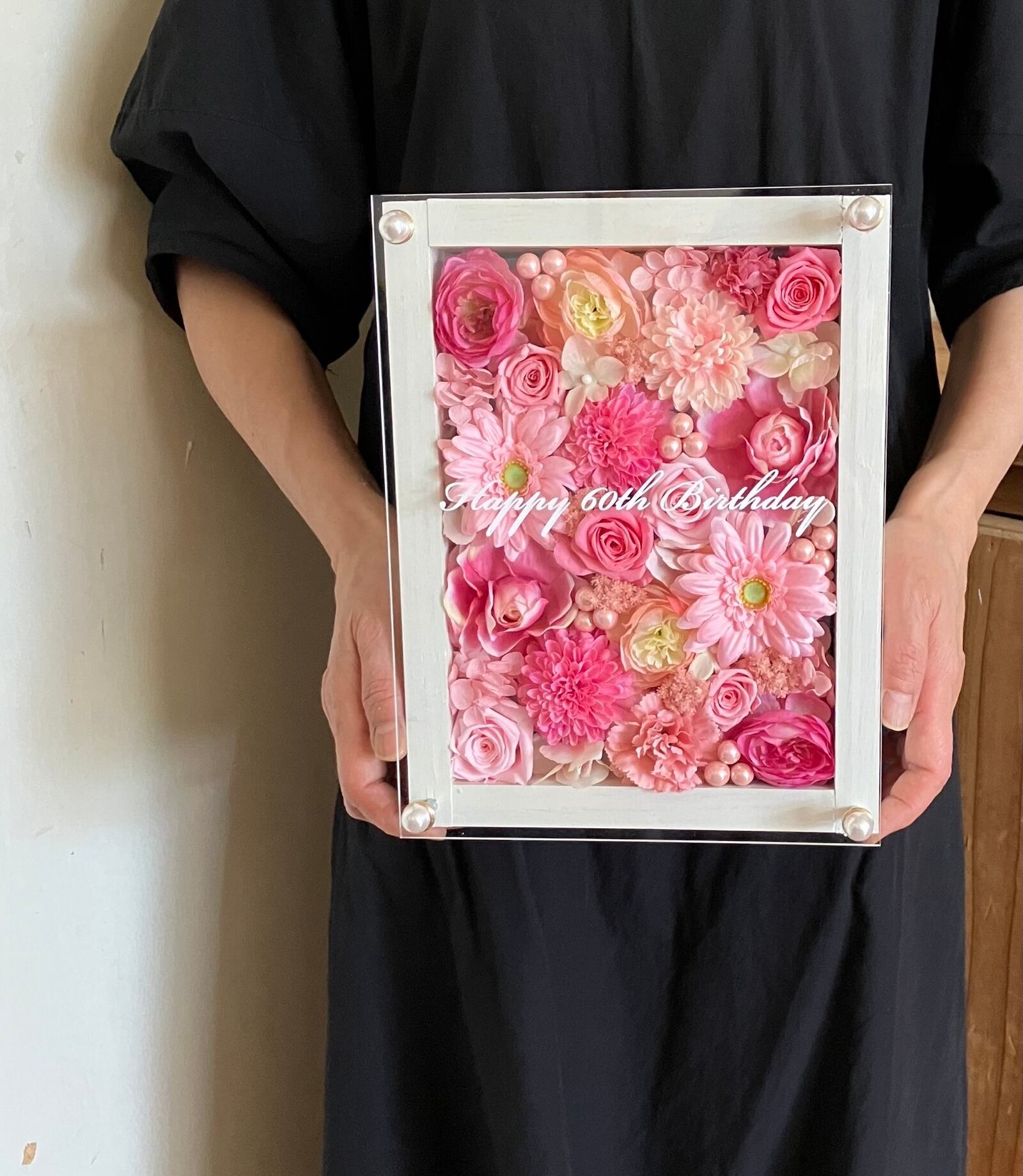 結婚祝い・還暦祝い・傘寿祝い・百寿祝い・開店祝い・母の日ギフト【名入れ】プリザーブドフラワーアレンジ ウッドフレーム 白木枠〈ピンク〉