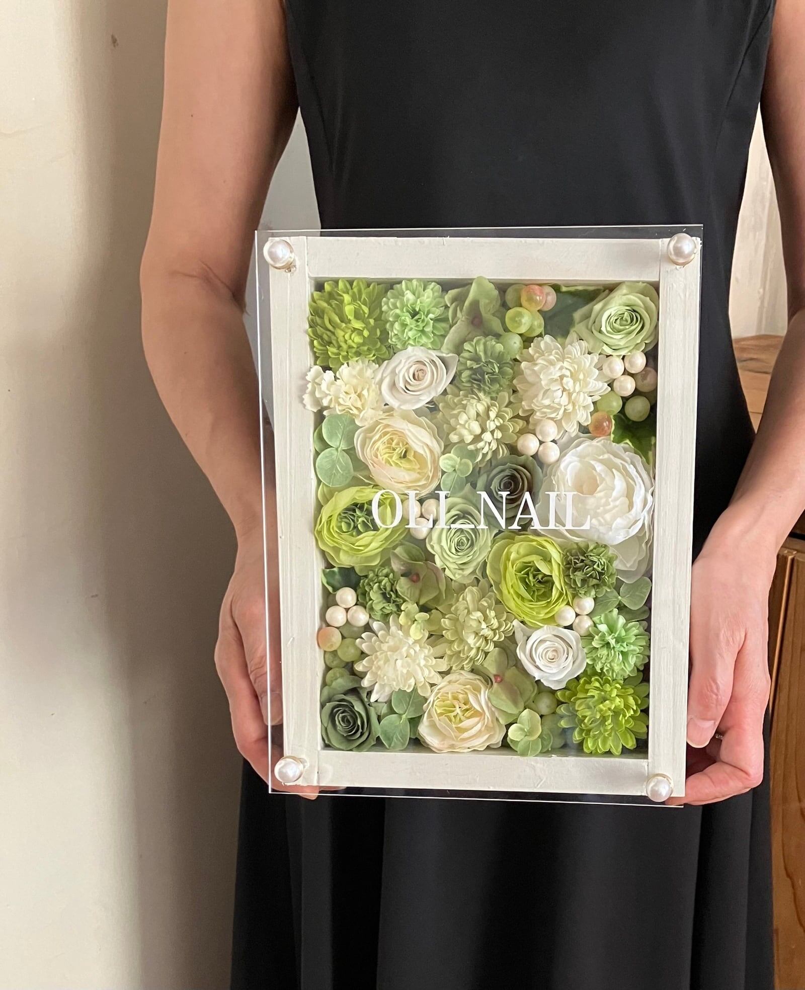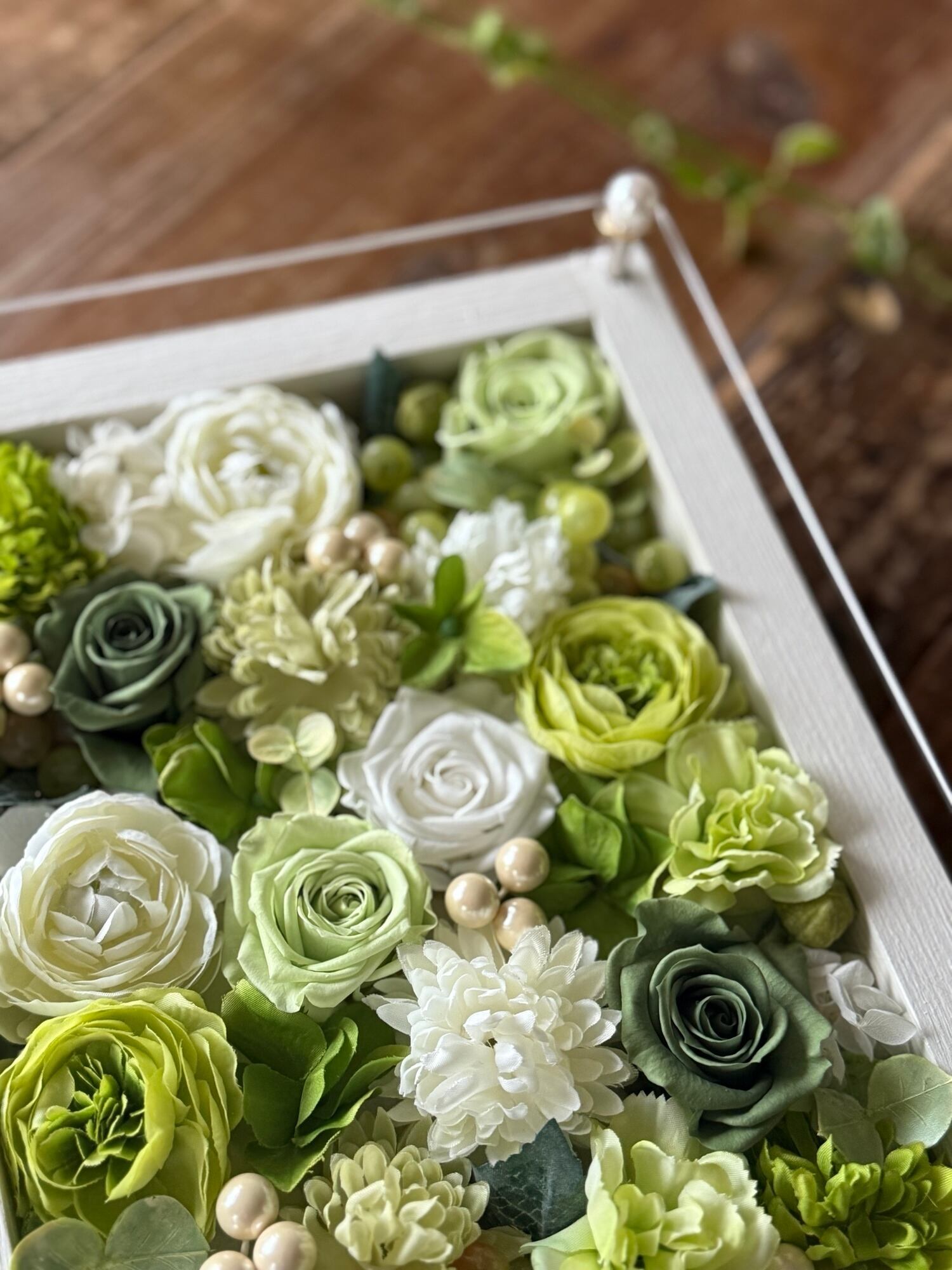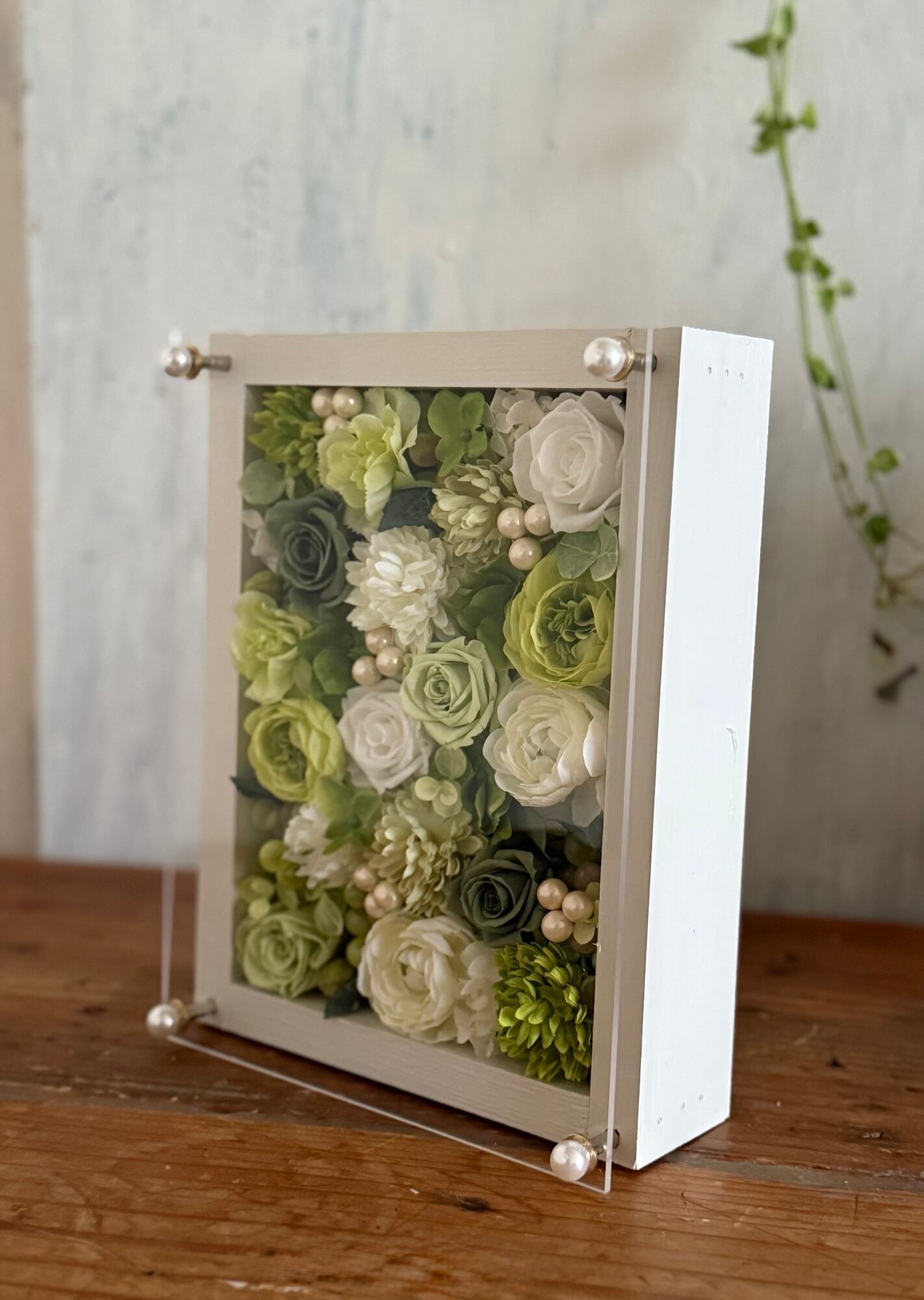開店祝い・サロンオープン祝い・開院祝い・退職祝い【名入れ】プリザーブドフラワーアレンジ ウッドフレーム 白木枠〈白グリーン〉