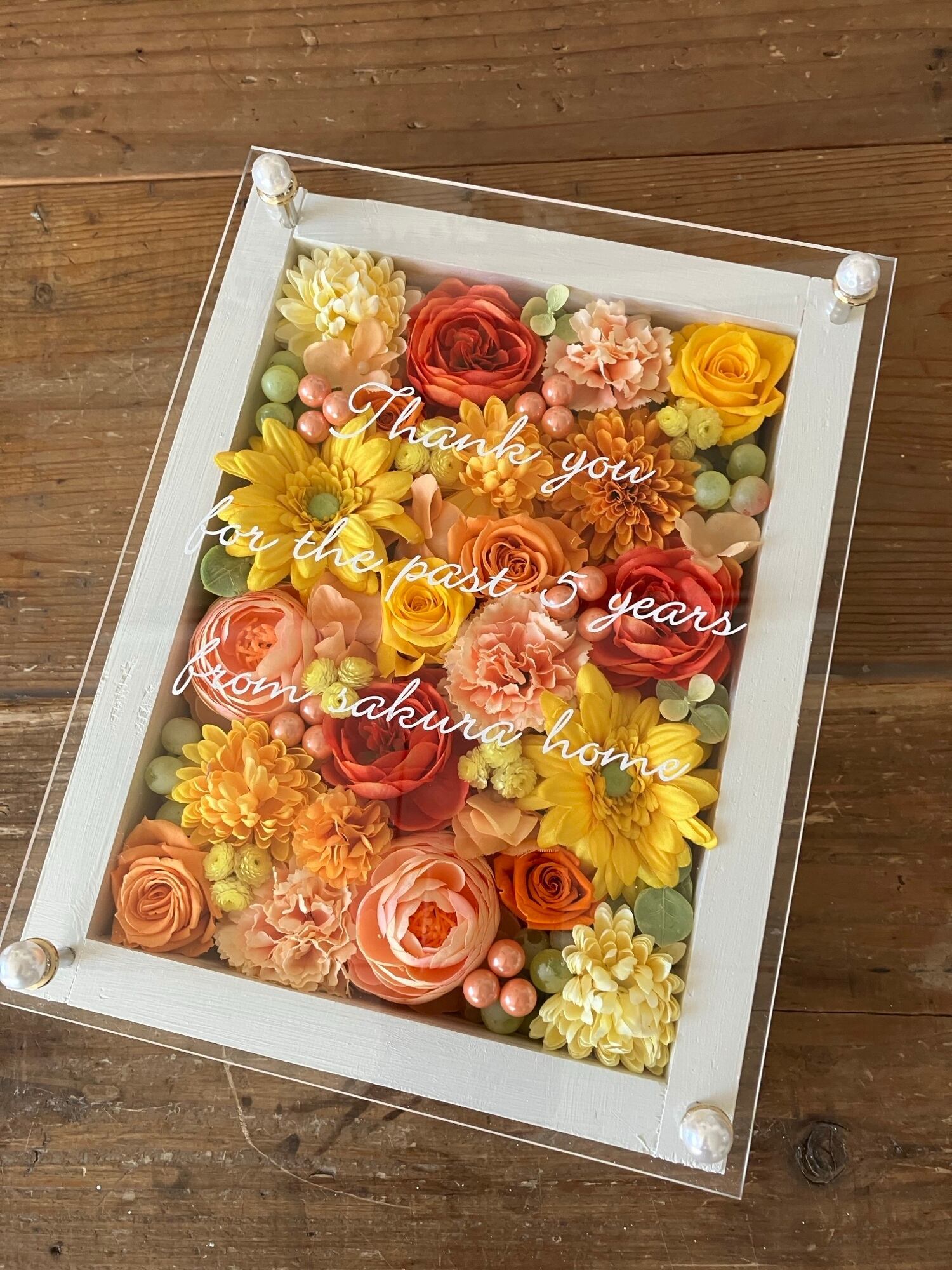白色のウッドフレームにプリザーブドフラワーと造花をぎっしり詰め込み、アクリル板にはカッティングシートでメッセージをお入れします。