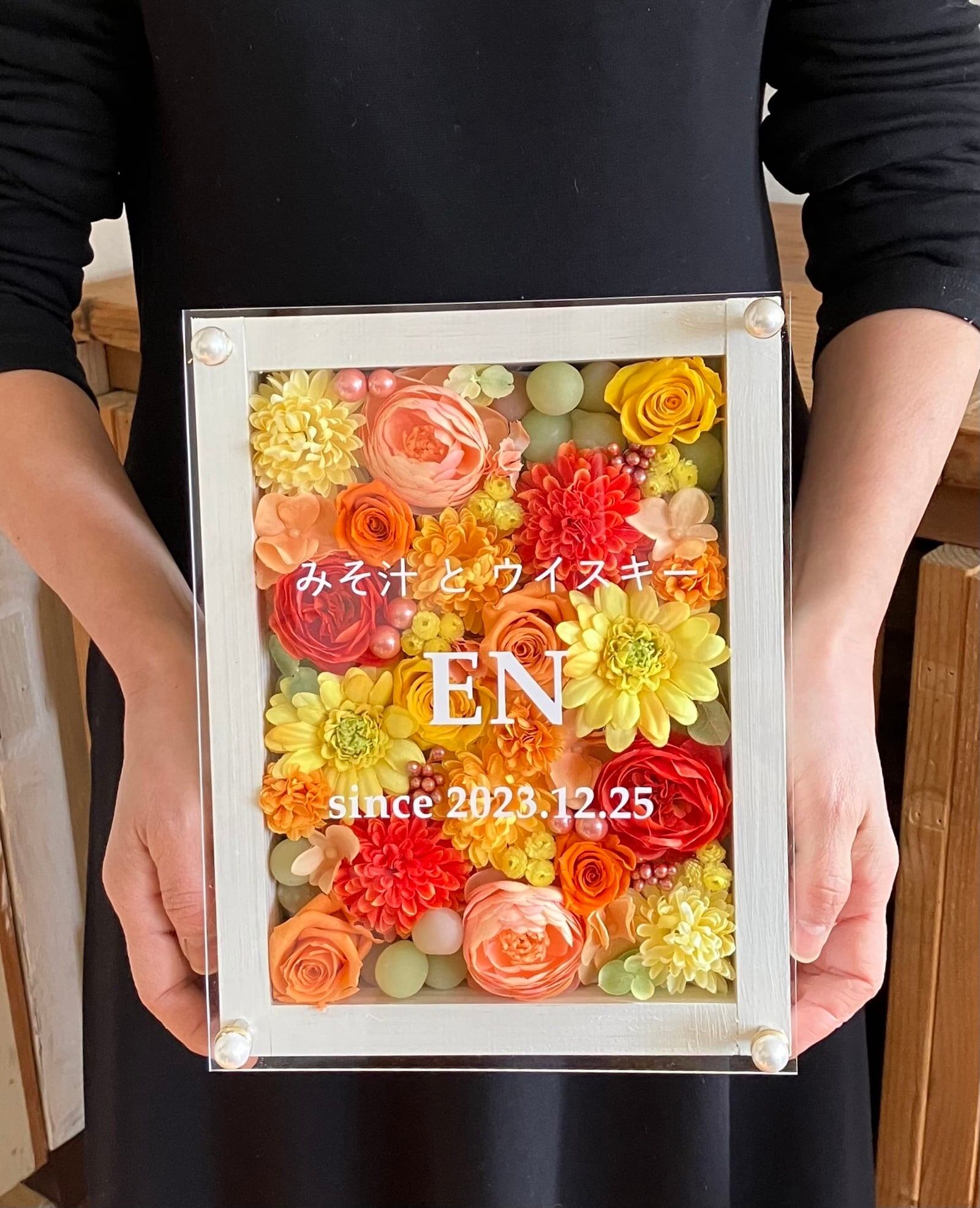 イエローオレンジの明るく元気な色の名入れお花フレーム