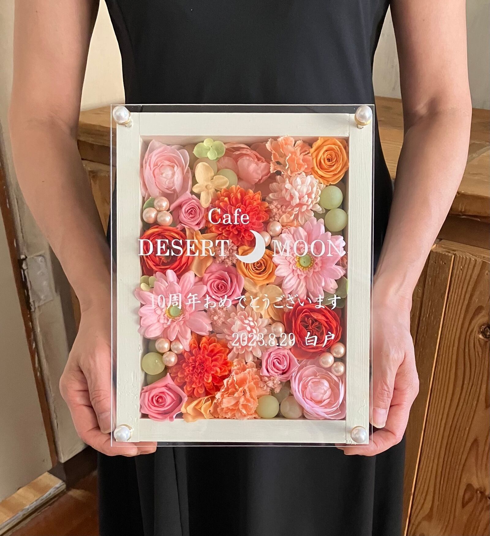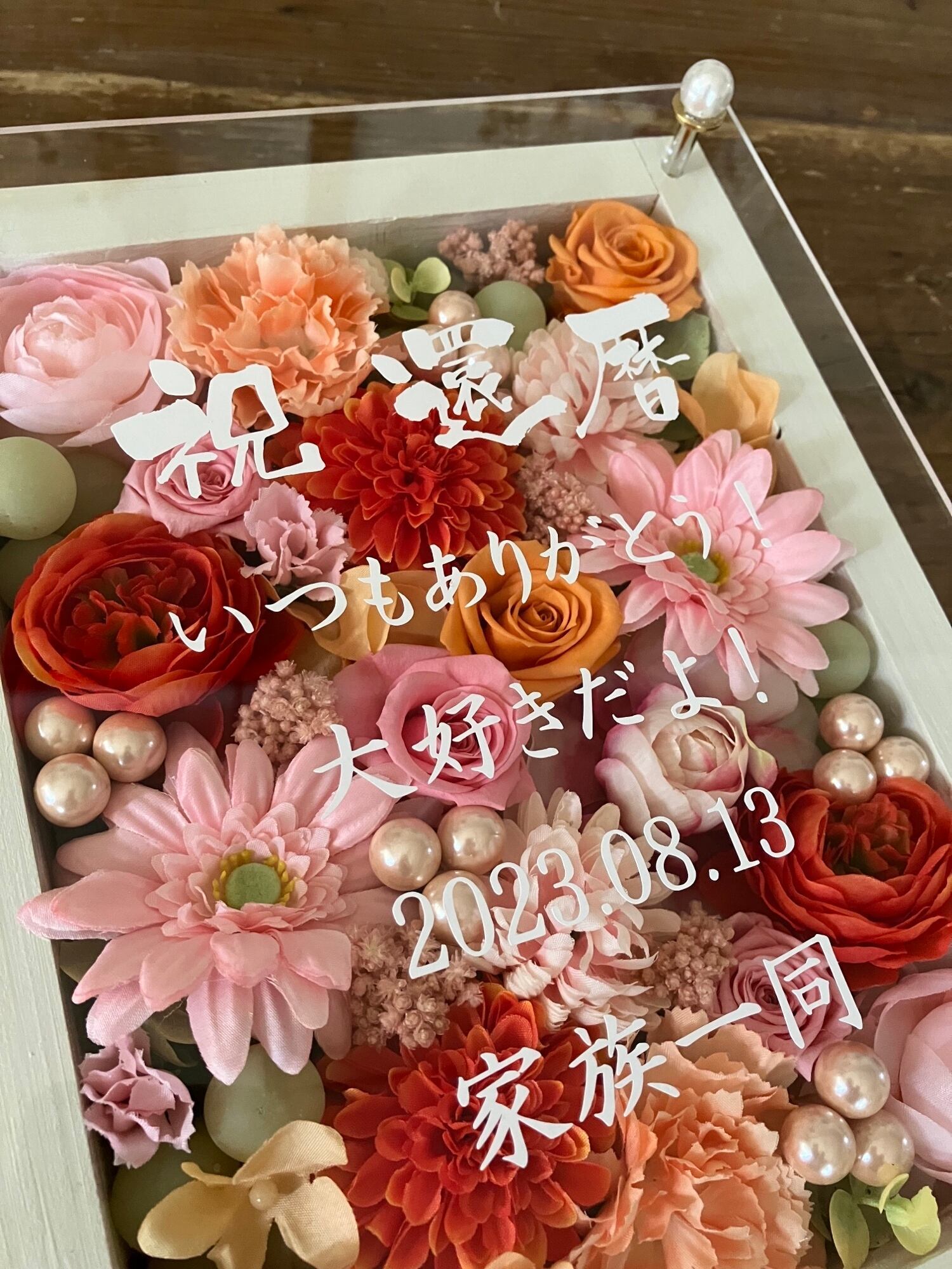 開店祝い・退職祝い・還暦祝い・結婚祝い・母の日ギフト【名入れ】プリザーブドフラワーアレンジ ウッドフレーム 白木枠〈ピンクオレンジ〉