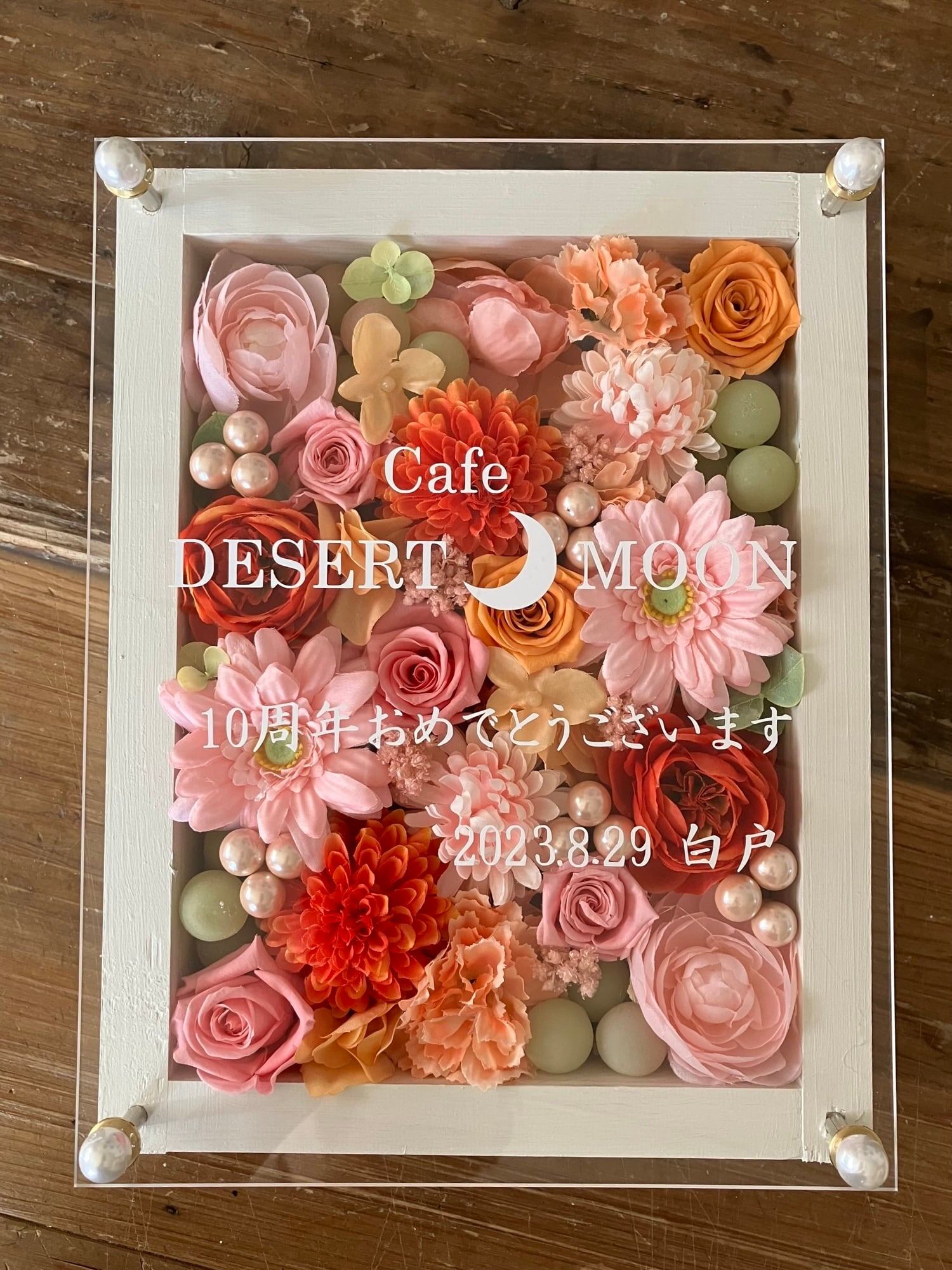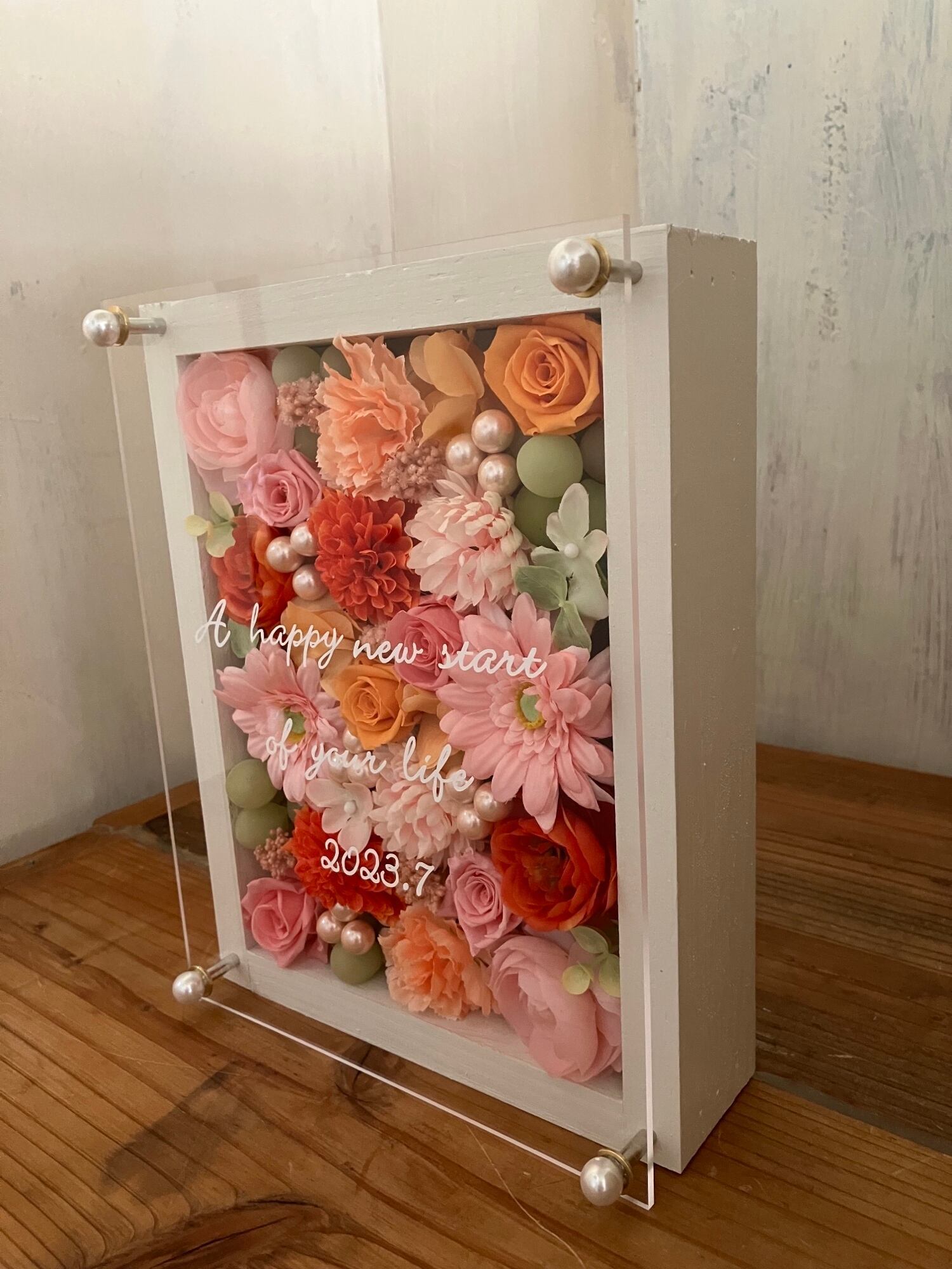白色のウッドフレームにプリザーブドフラワーと造花をぎっしり詰め込み、アクリル板にはカッティングシートでメッセージをお入れします。