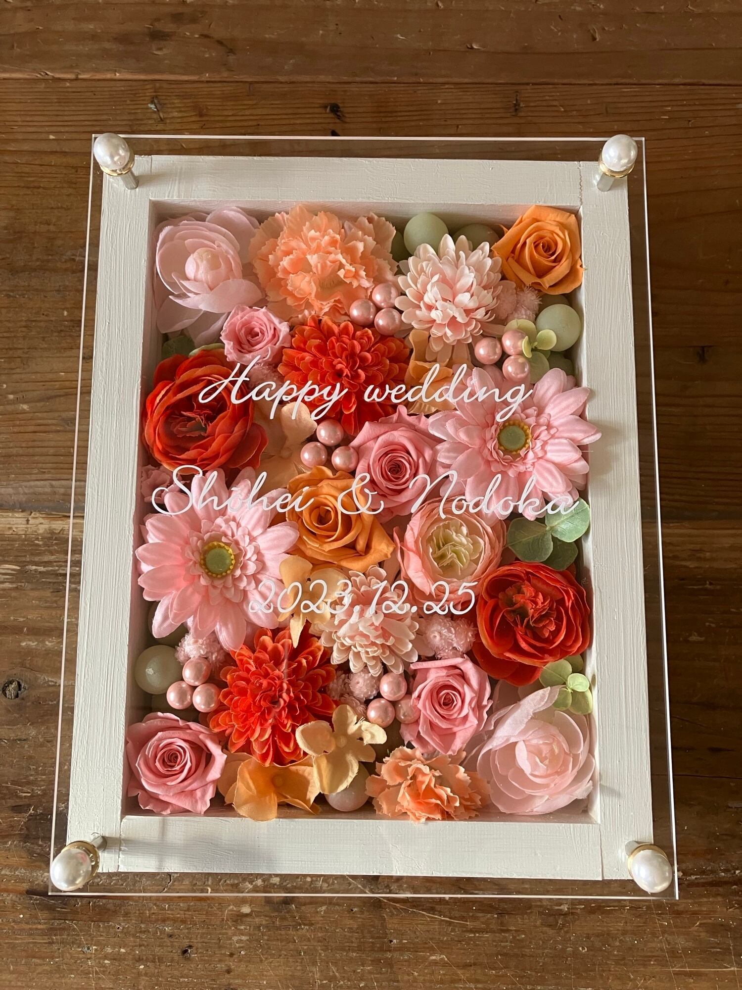 ピンクオレンジの華やかな名入れお花フレーム