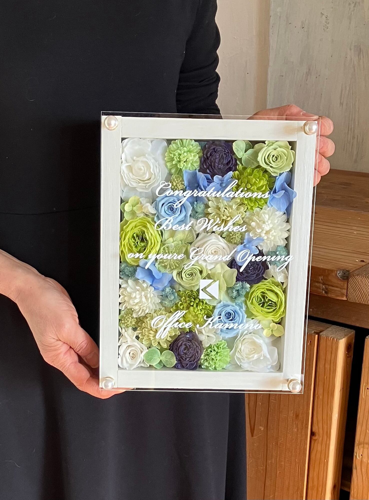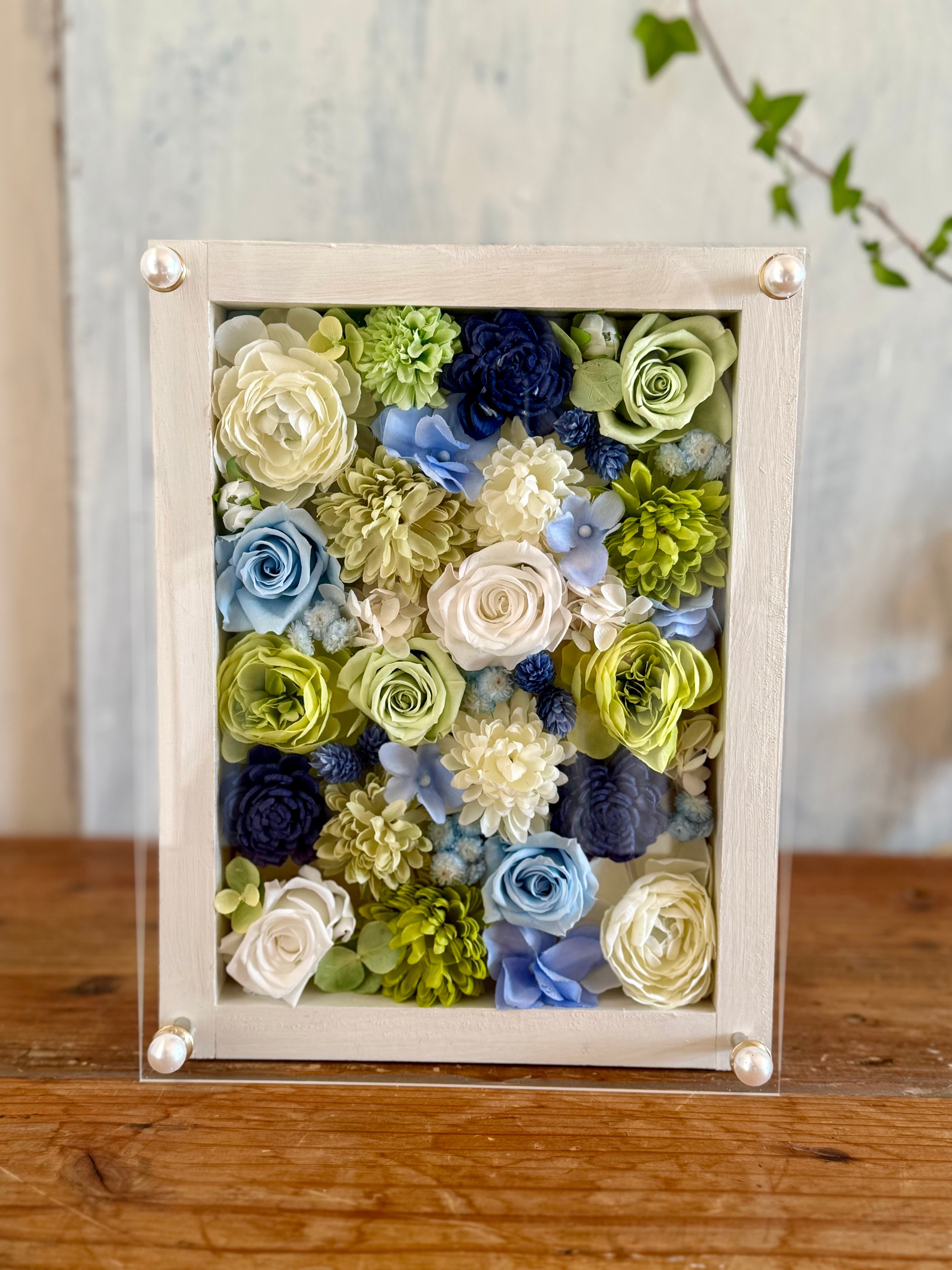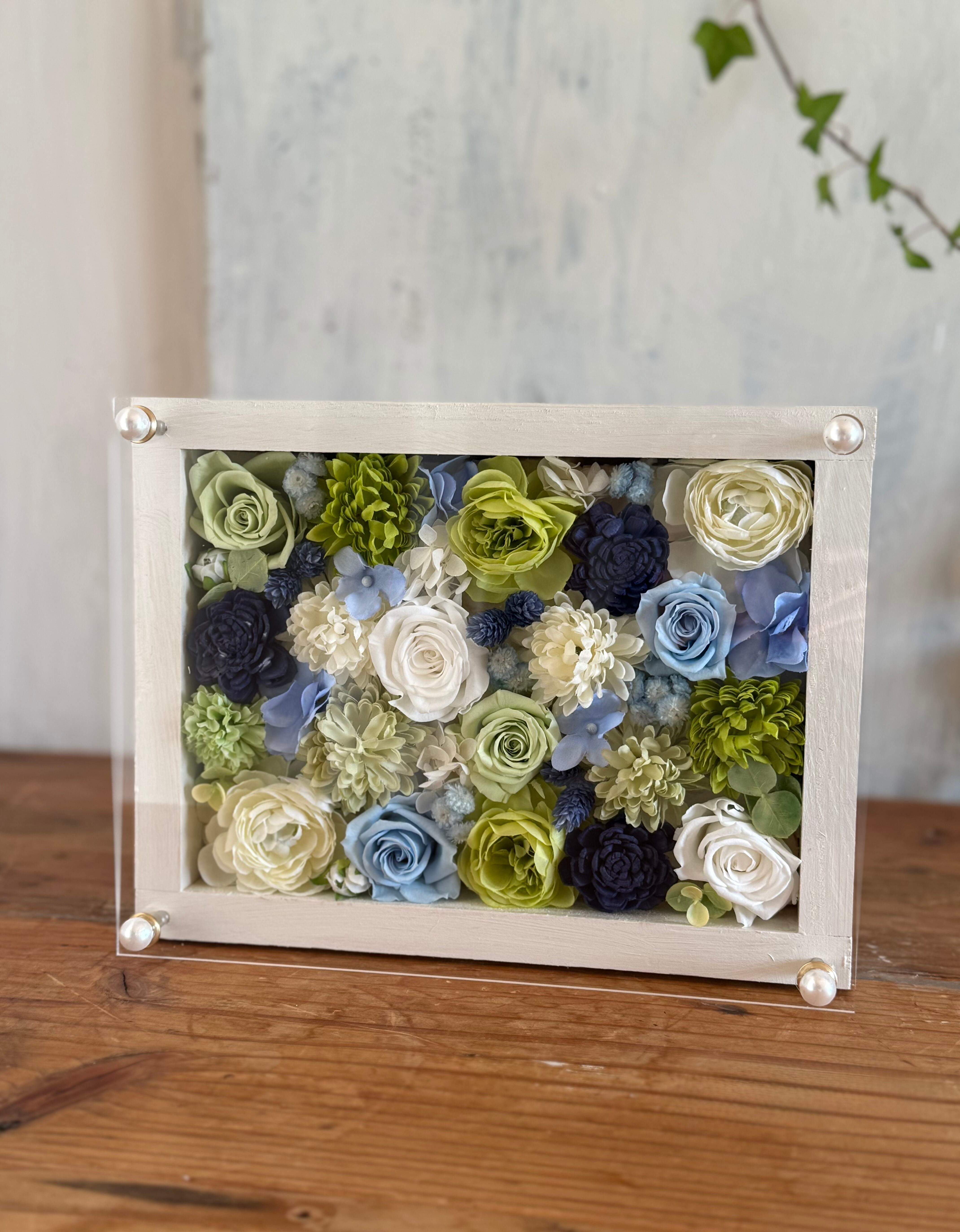 結婚祝い・開店祝い・開院祝い・サロンオープン祝い・周年祝い【名入れ】プリザーブドフラワーアレンジ ウッドフレーム 白木枠〈白グリーンブルー〉