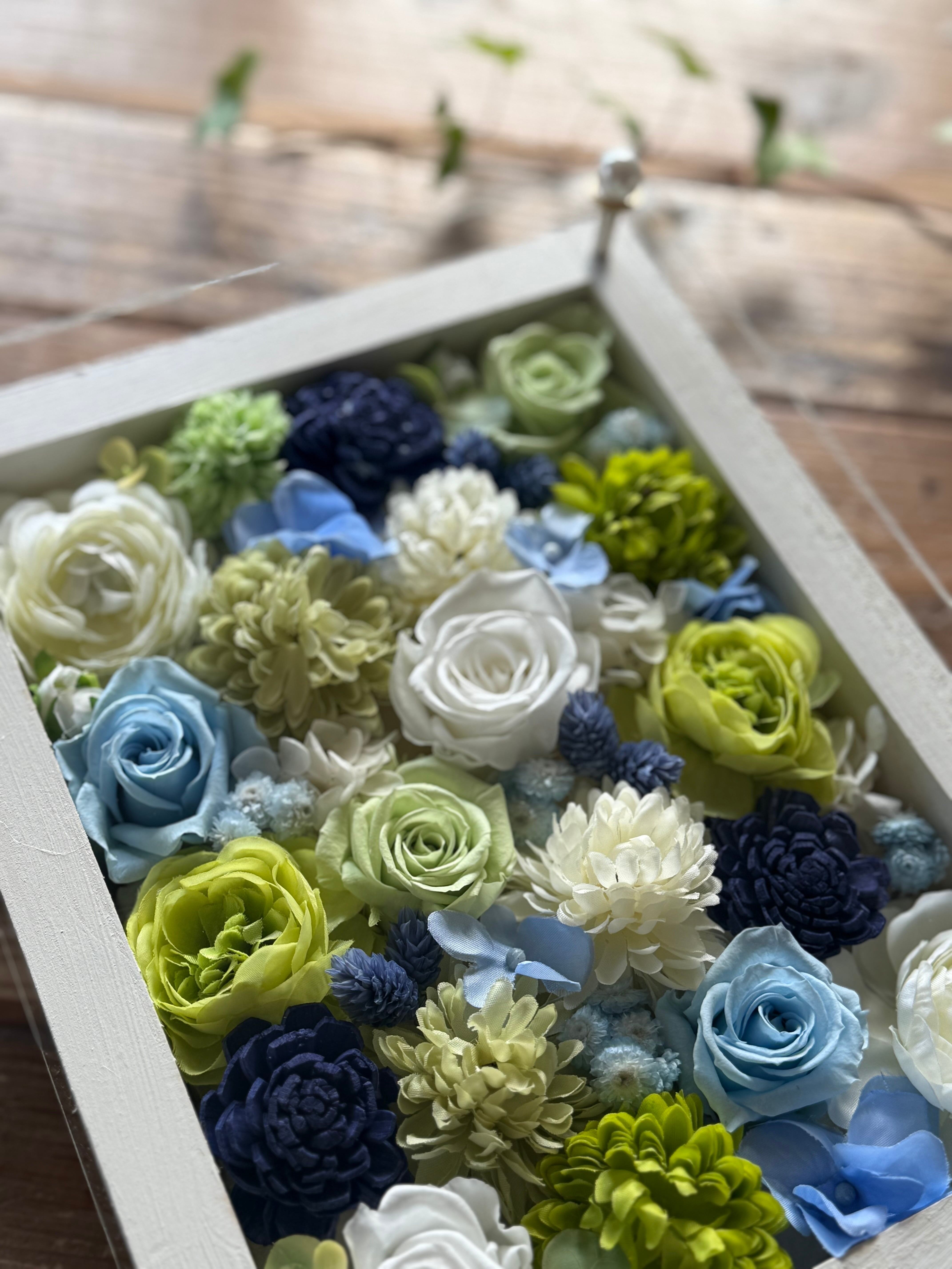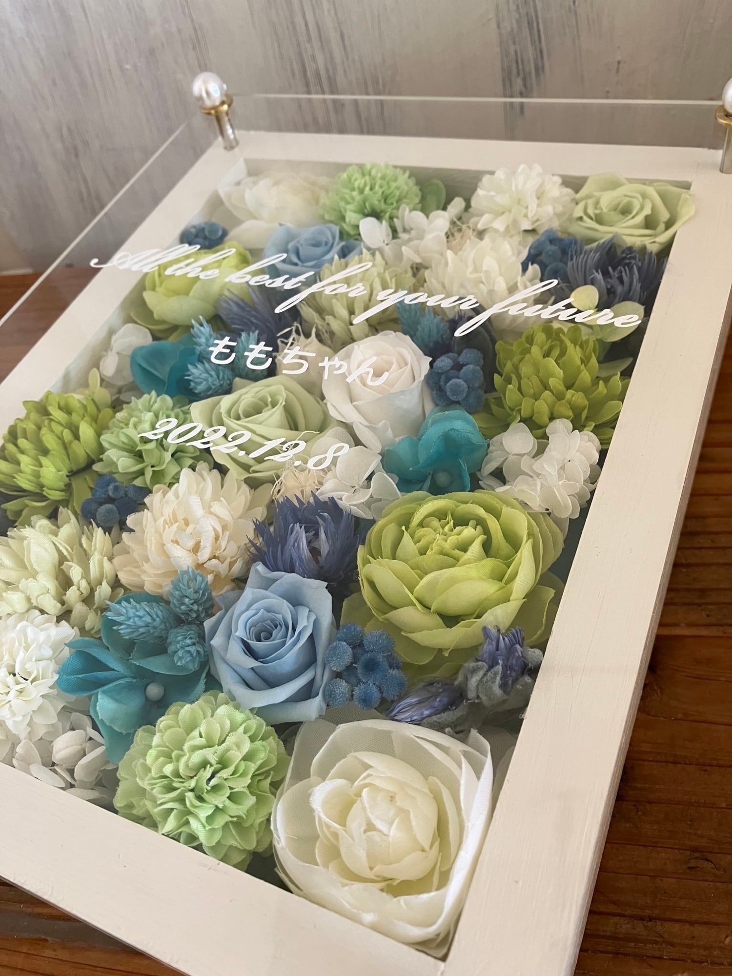 白グリーンブルーの爽やかな名入れお花フレーム