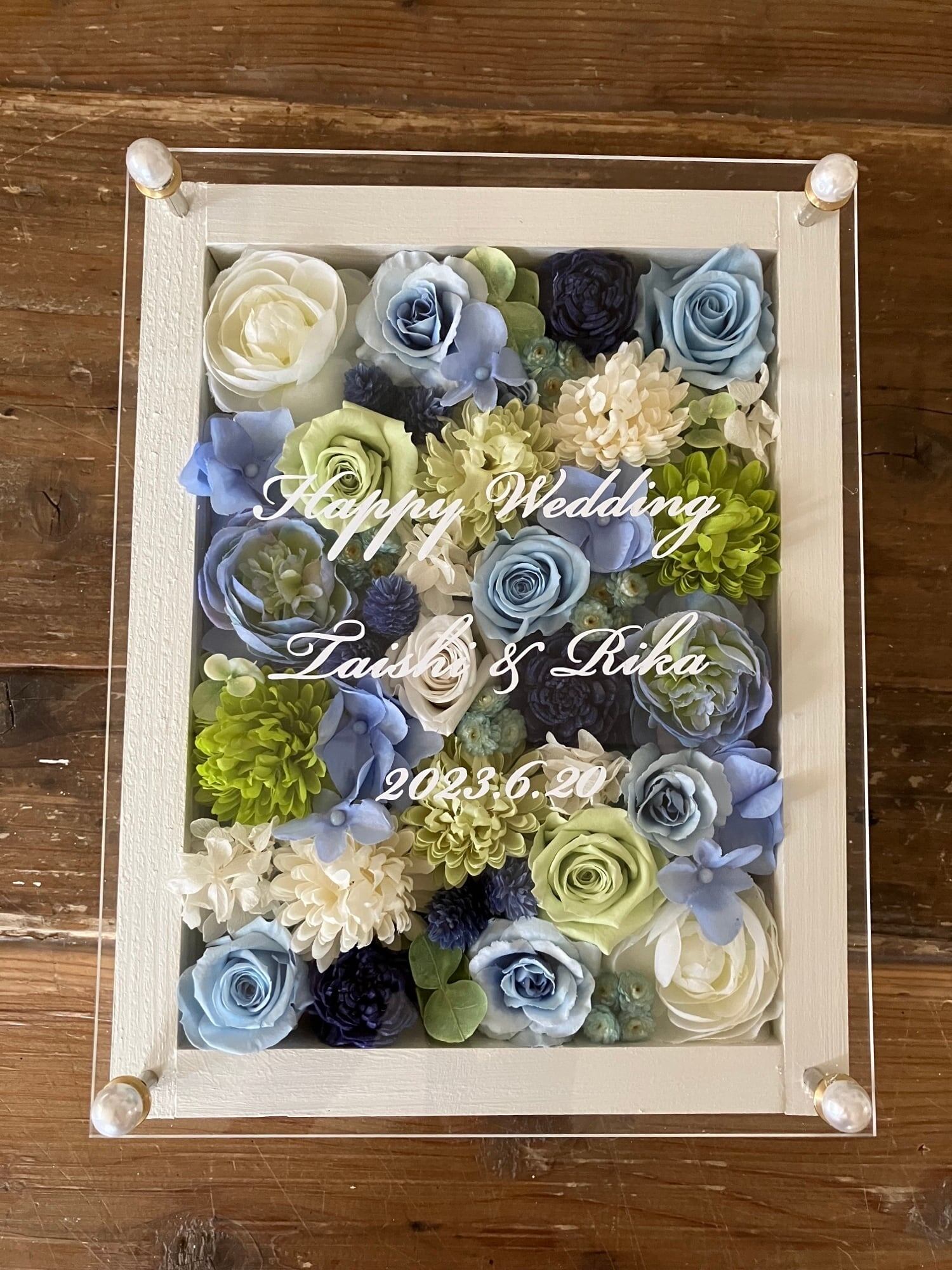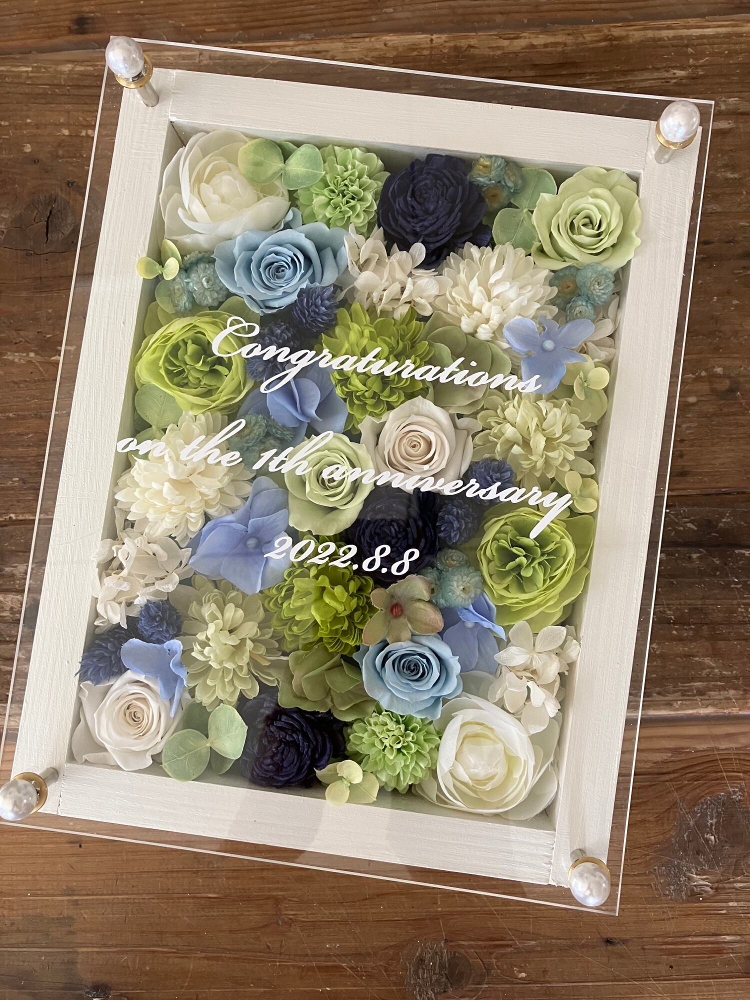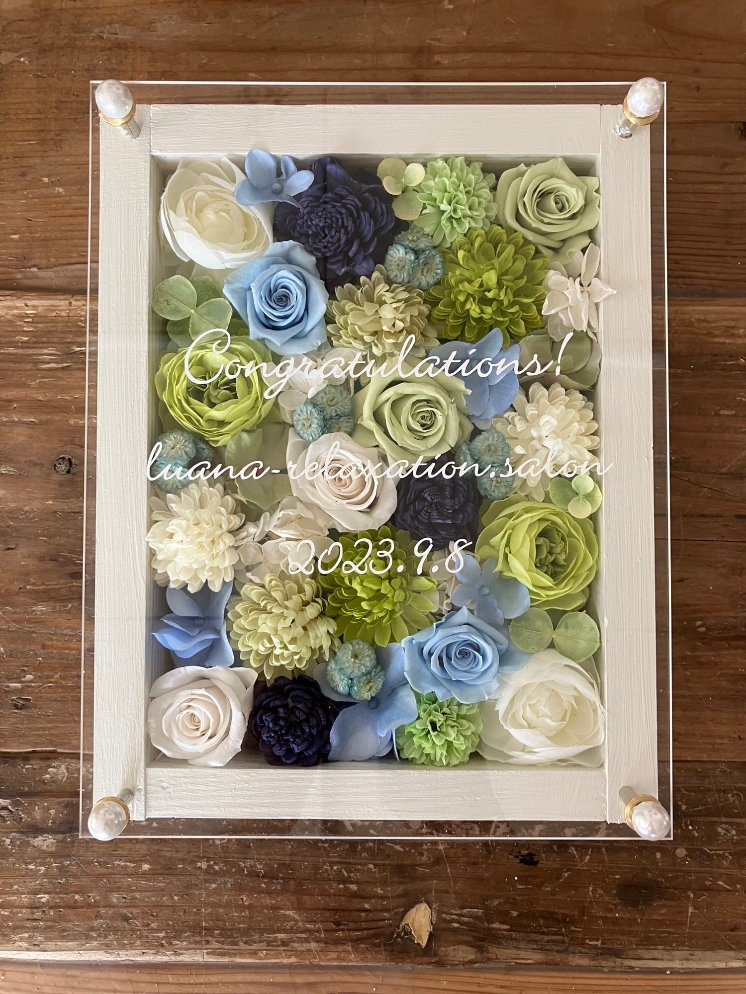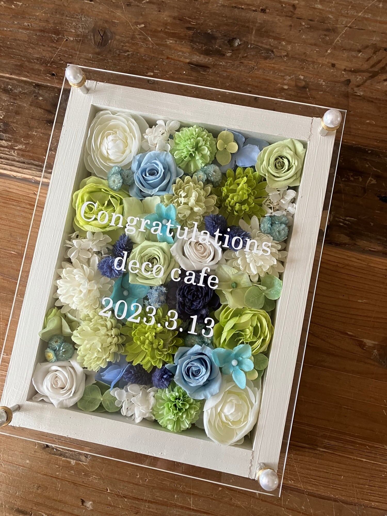 白色のウッドフレームにプリザーブドフラワーと造花をぎっしり詰め込み、アクリル板にはカッティングシートでメッセージをお入れします。