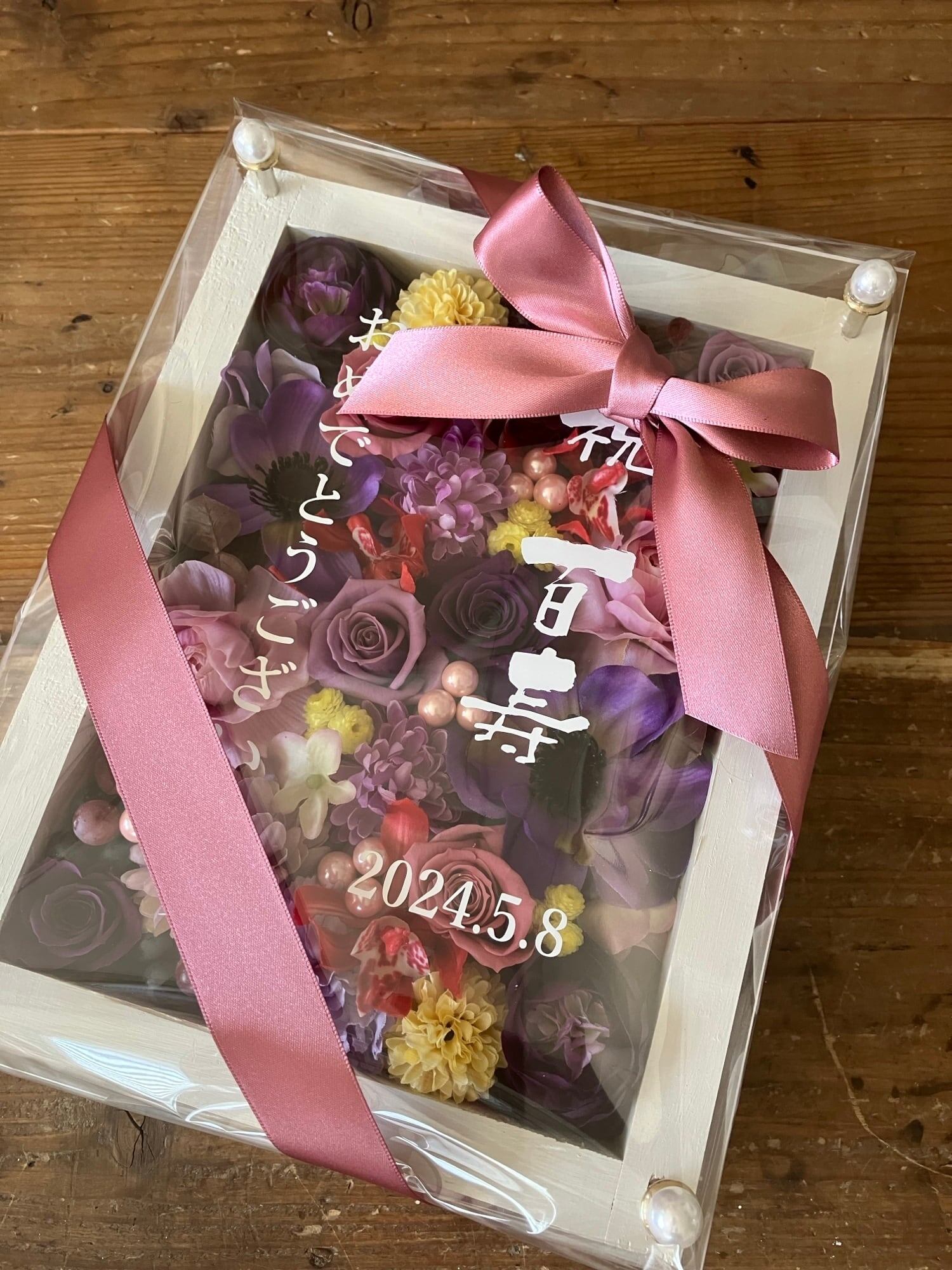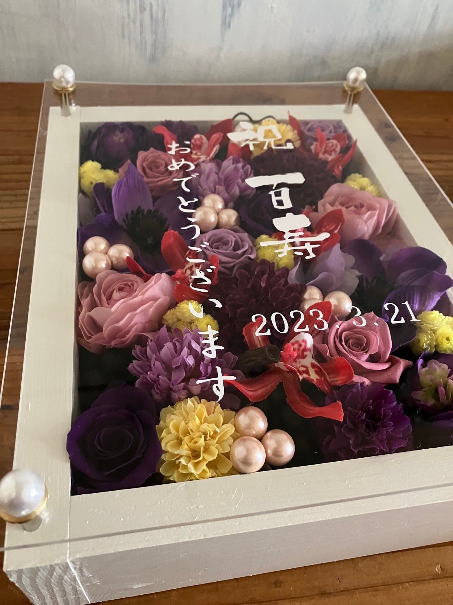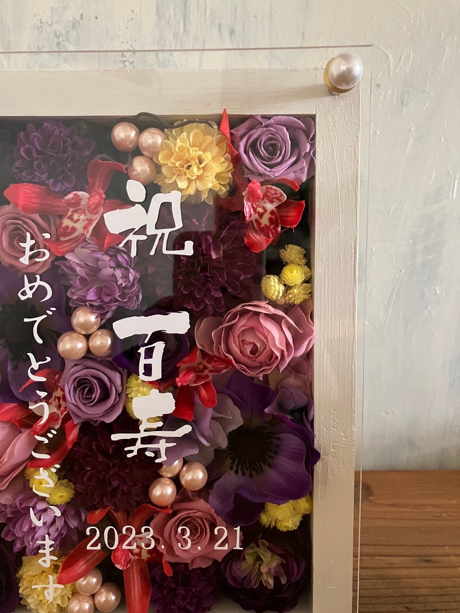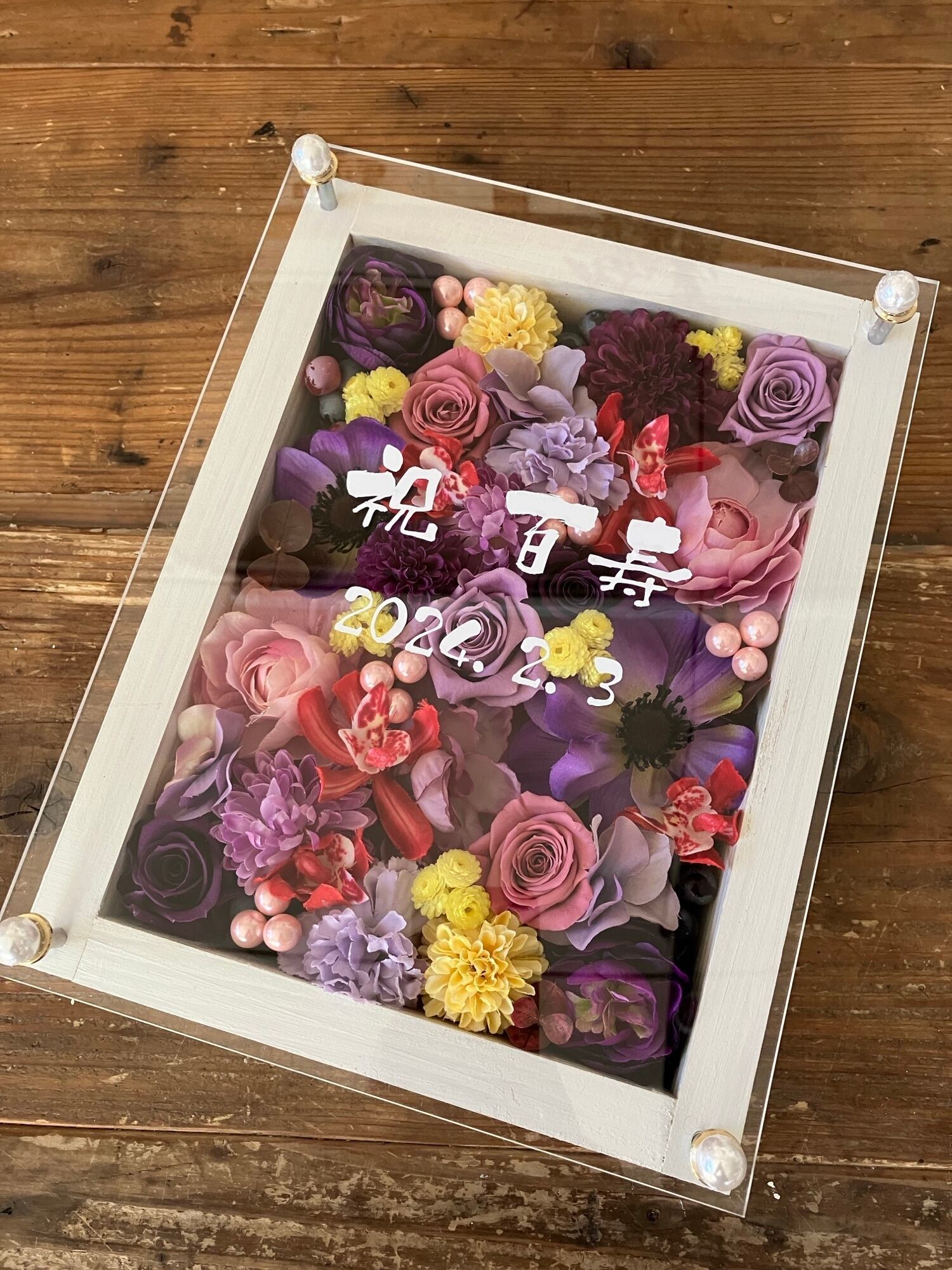 白色のウッドフレームにプリザーブドフラワーと造花をぎっしり詰め込み、アクリル板にはカッティングシートでメッセージをお入れします。