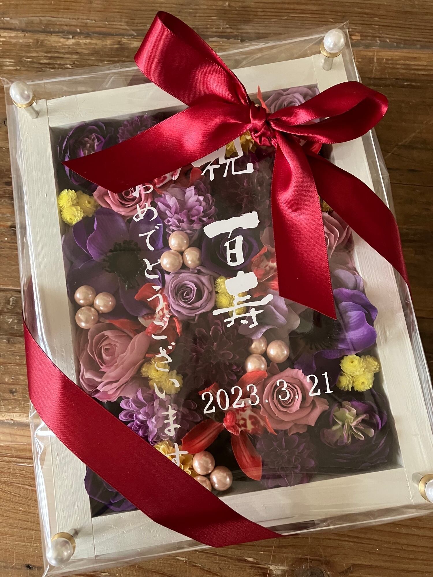 喜寿祝い・百寿祝い・退職祝い【名入れ】プリザーブドフラワーアレンジ ウッドフレーム 白木枠〈パープル赤イエロー〉