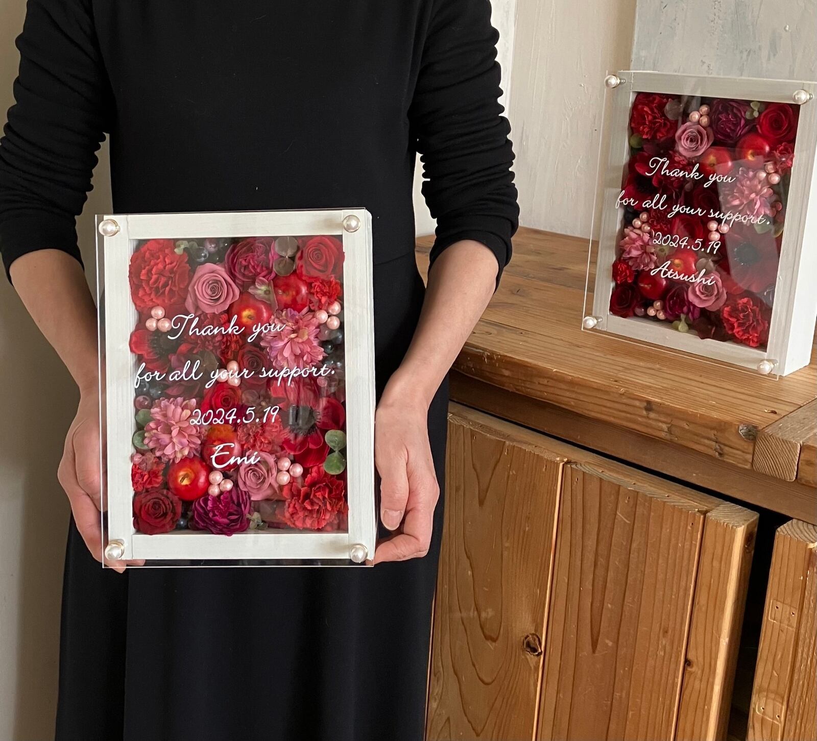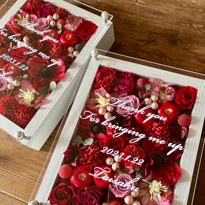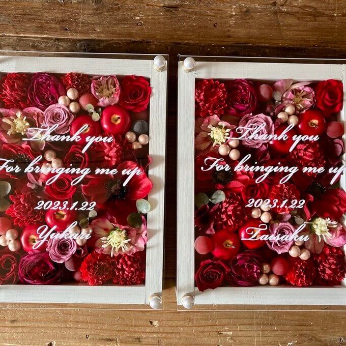 子育て感謝状・両親贈呈品 2個セット【名入れ】プリザーブドフラワーアレンジ ウッドフレーム 白木枠〈レッドペア〉結婚式 ギフト
