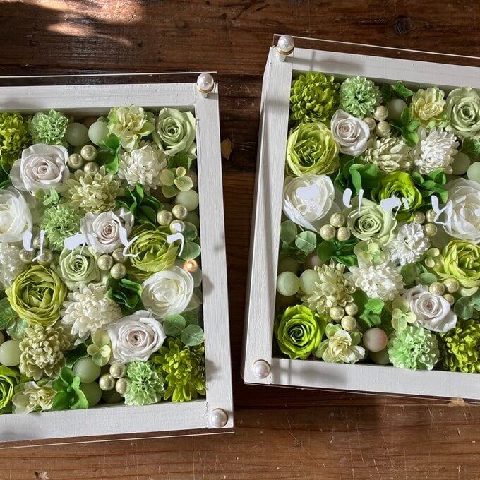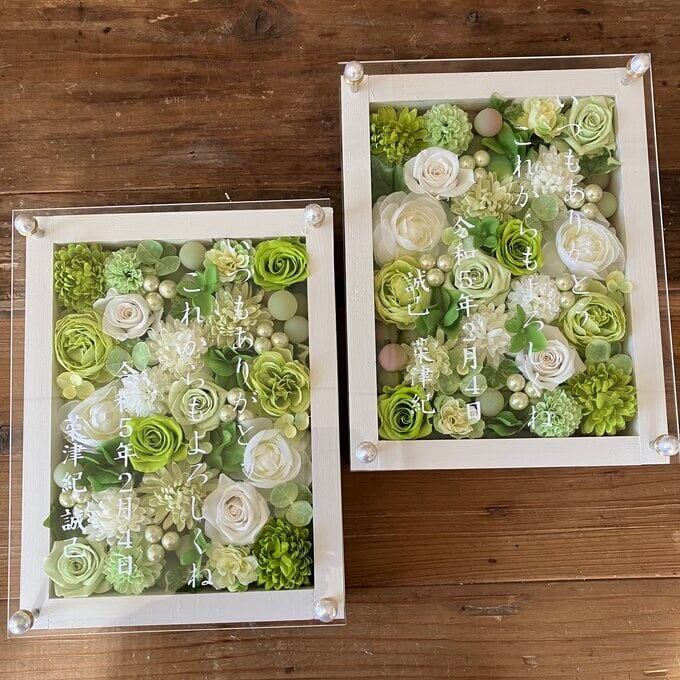 子育て感謝状・両親贈呈品 2個セット【名入れ】プリザーブドフラワーアレンジ ウッドフレーム〈白グリーンペア〉結婚式 ギフト