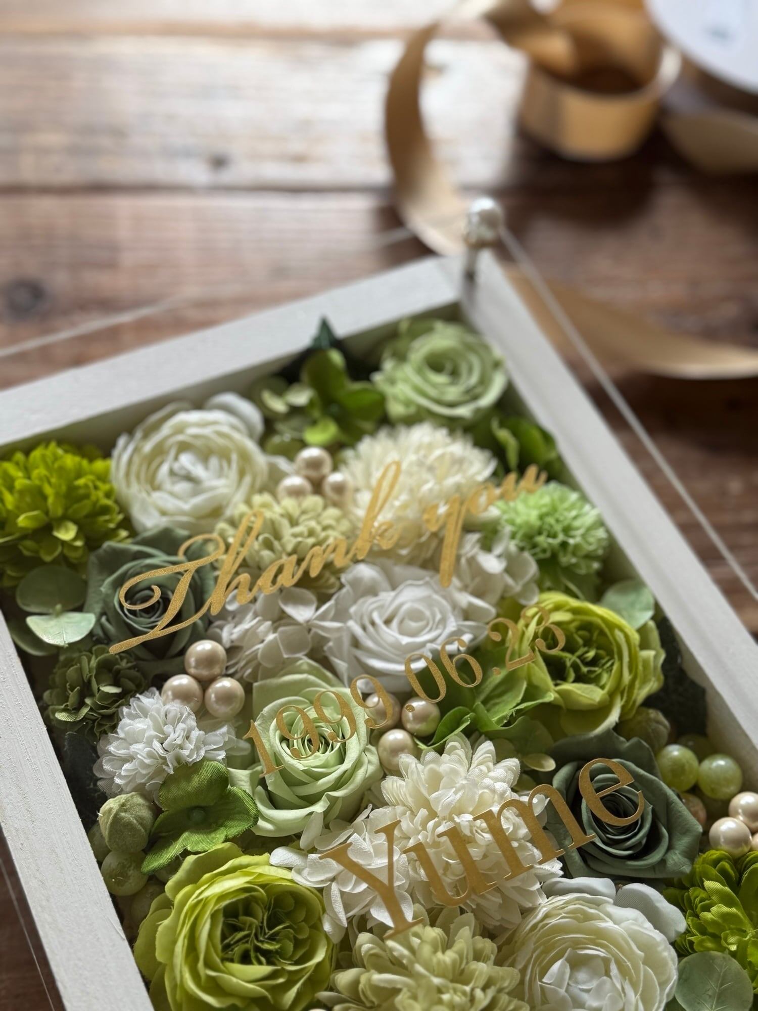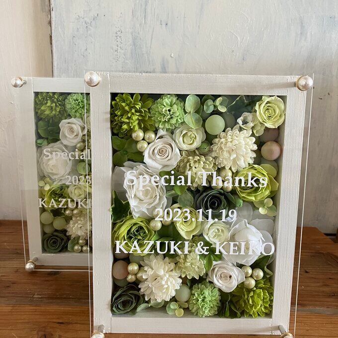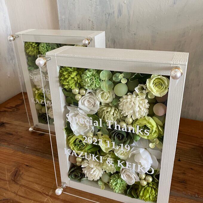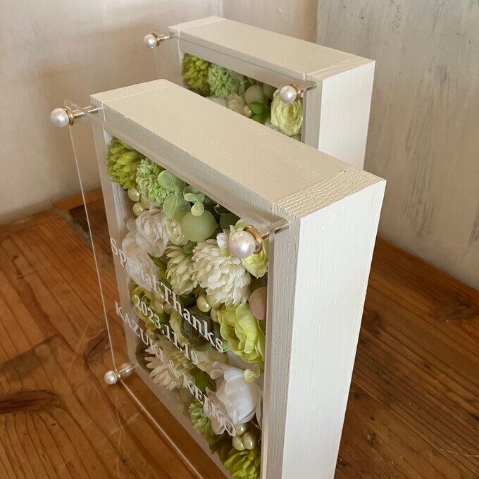ウッドフレームにプリザーブドフラワーと造花をぎっしり詰め込みアクリル板にはカッティングシートでお名前、挙式日、生まれてから今日までの日数などをお入れします