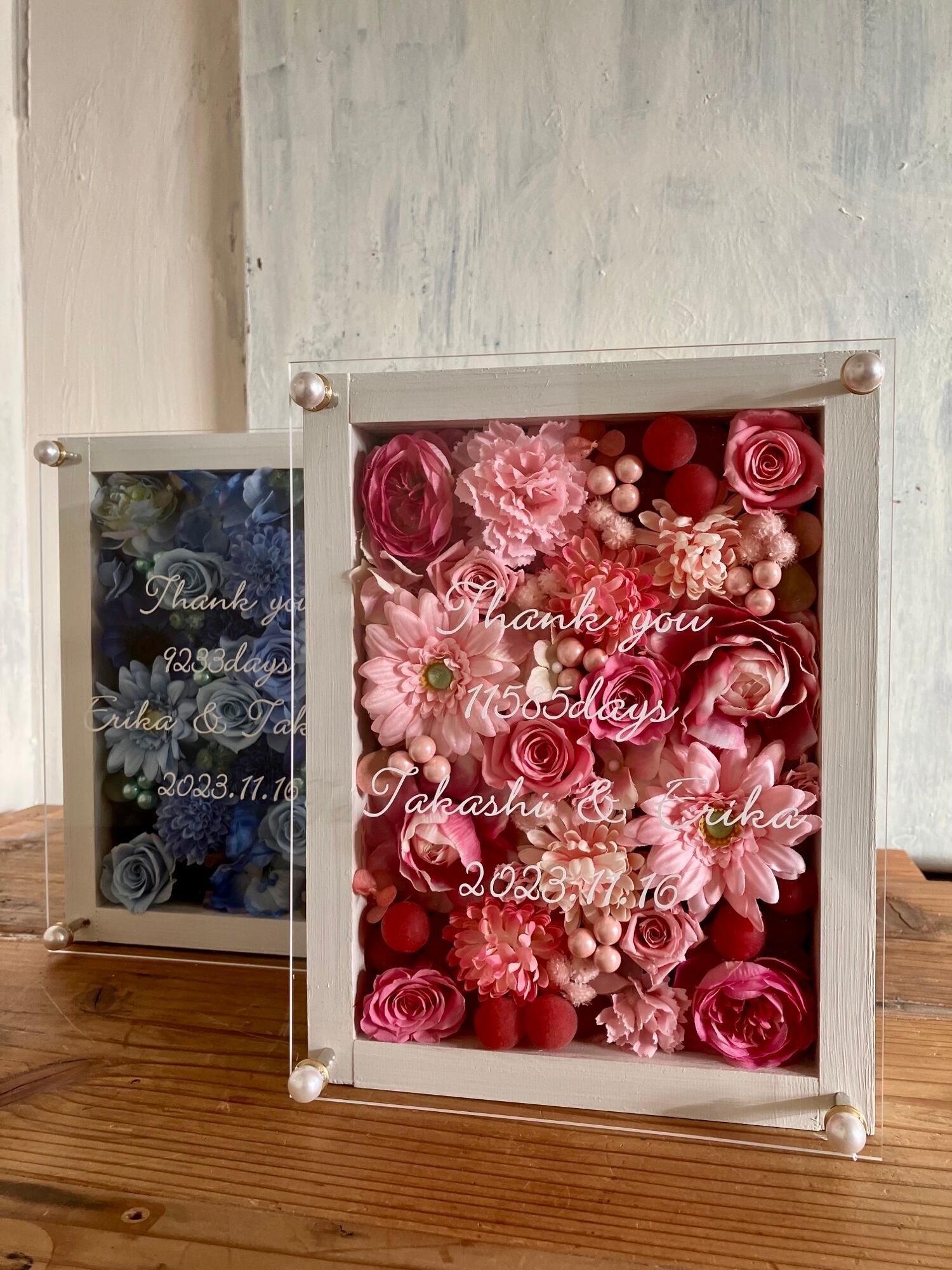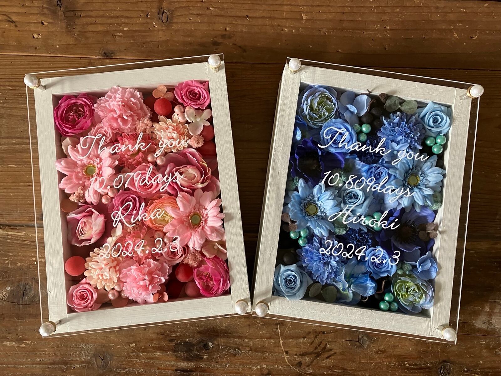 ウッドフレームにプリザーブドフラワーと造花をぎっしり詰め込みアクリル板にはカッティングシートでお名前、挙式日、生まれてから今日までの日数などをお入れします