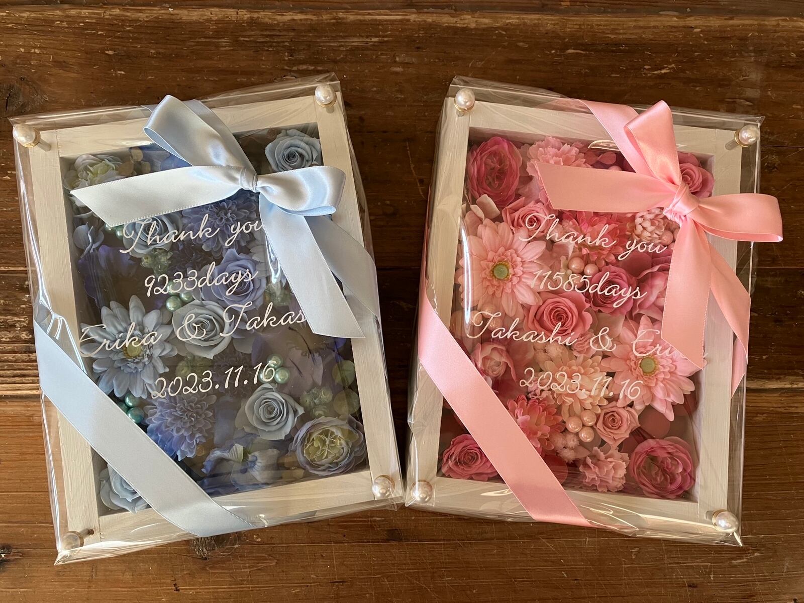 子育て感謝状・両親贈呈品 2個セット【名入れ】 プリザーブドフラワーアレンジ ウッドフレーム〈ブルー&ピンク〉結婚式 ギフト