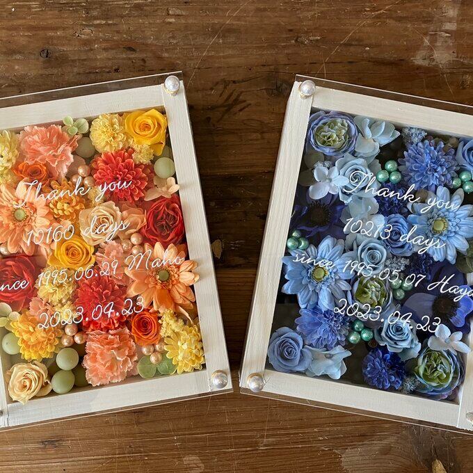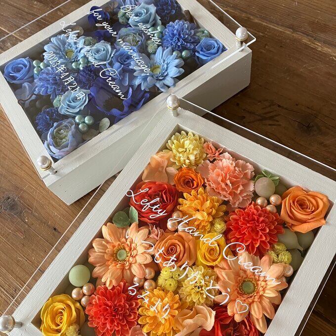 子育て感謝状・両親贈呈品 2個セット【名入れ】プリザーブドフラワーアレンジ ウッドフレーム 白木枠〈ブルー&イエローオレンジ〉結婚式 ギフト