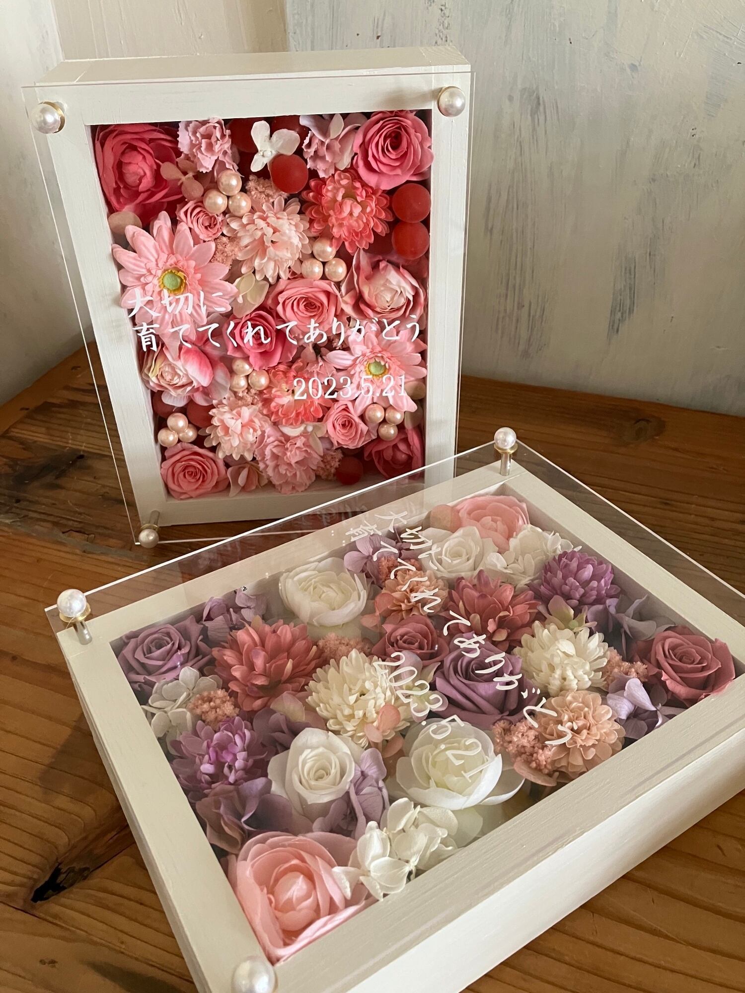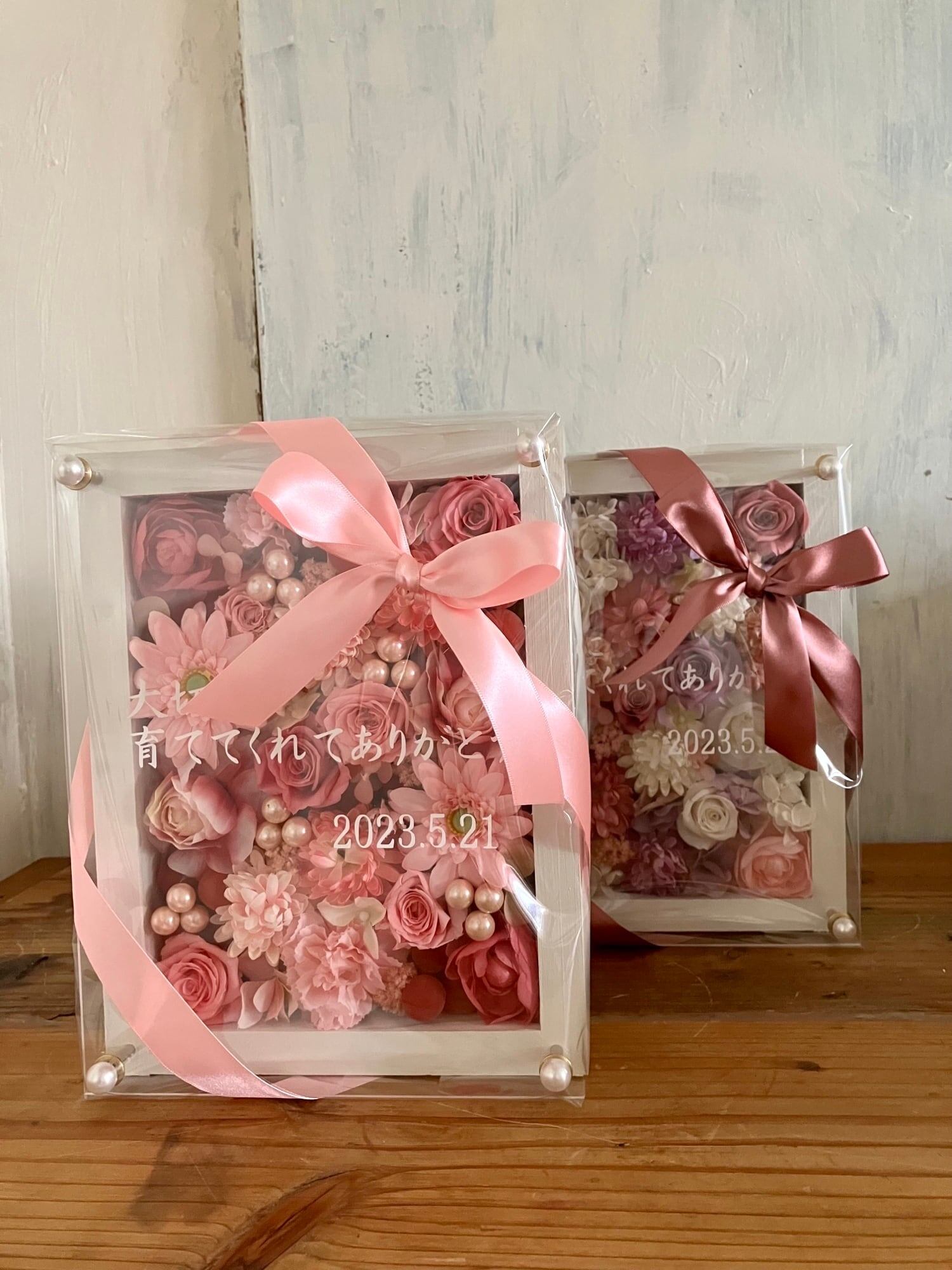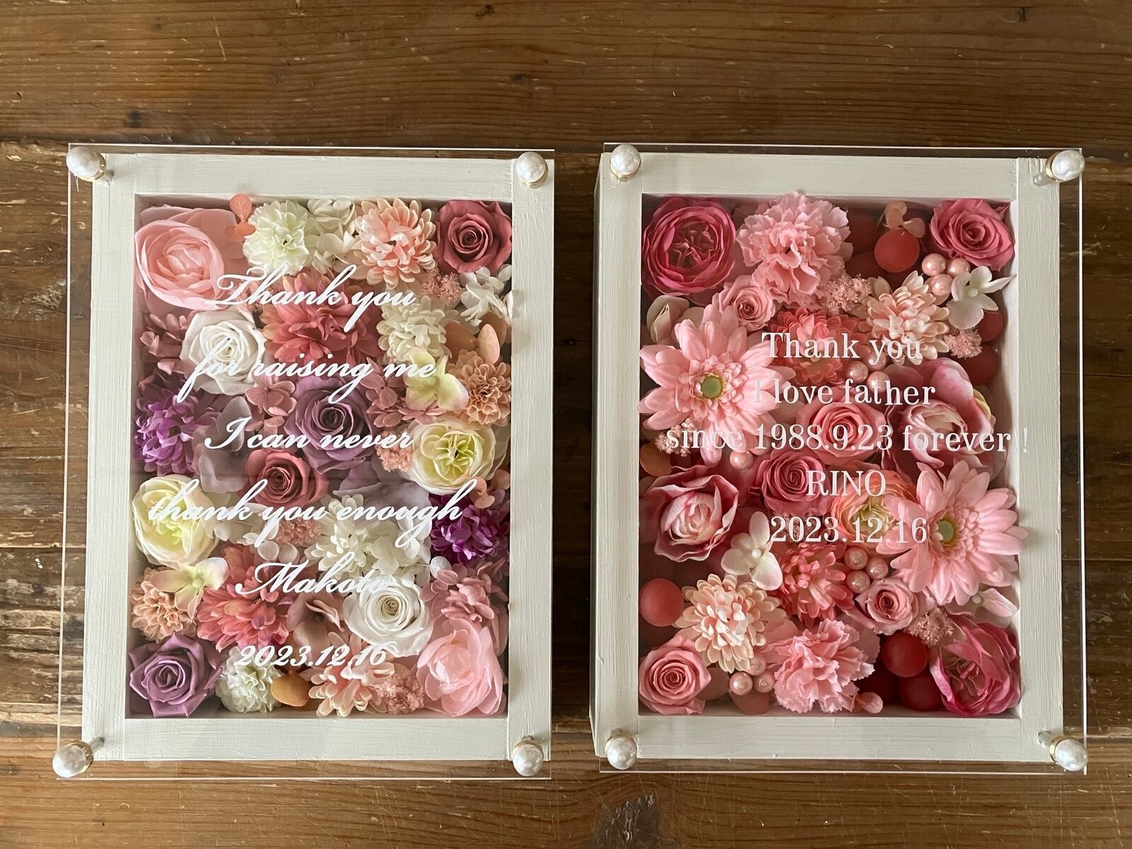子育て感謝状・両親贈呈品 2個セット【名入れ】プリザーブドフラワーアレンジ ウッドフレーム 白木枠〈ピンク&ピンクパープル白〉結婚式 ギフト