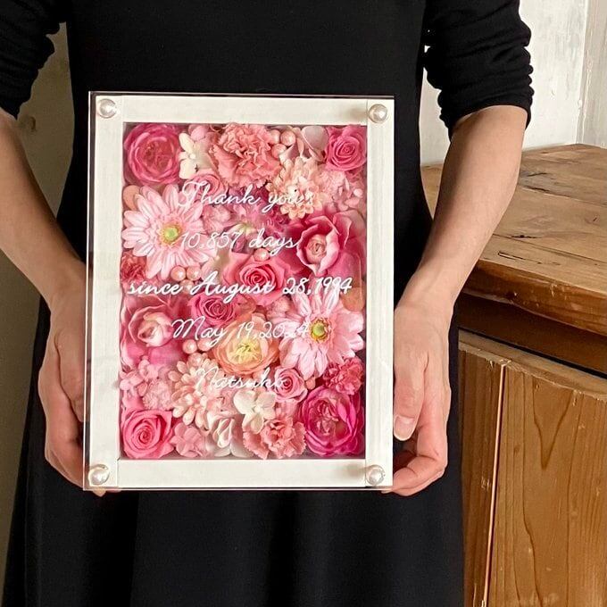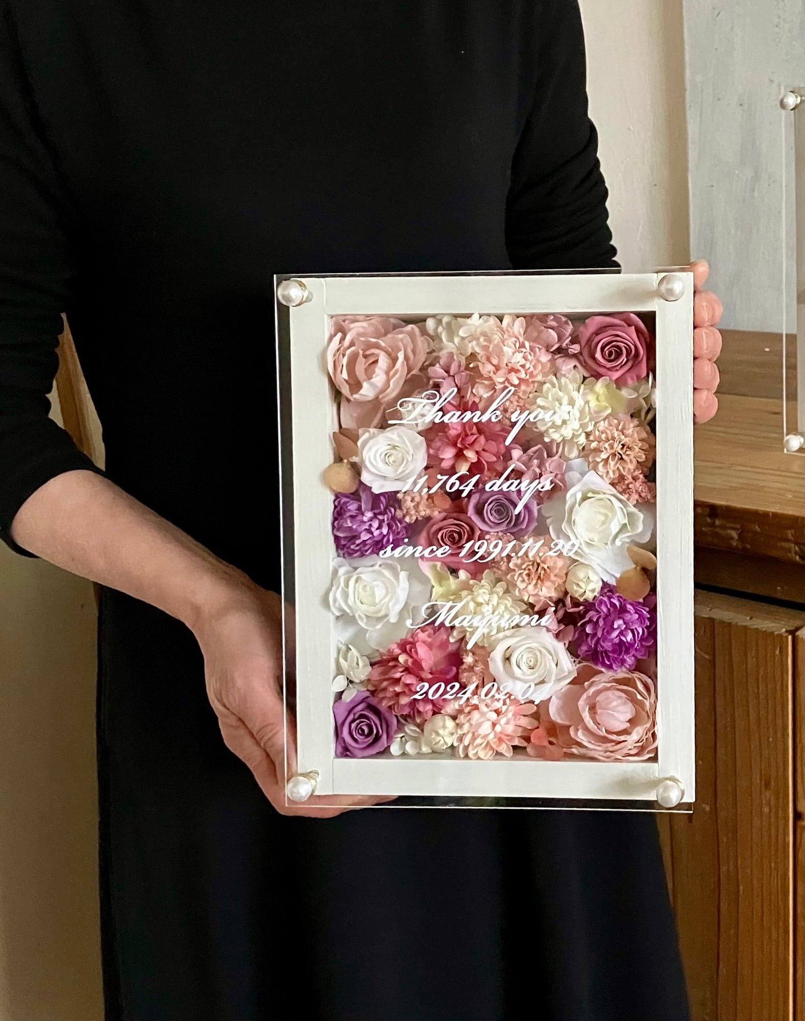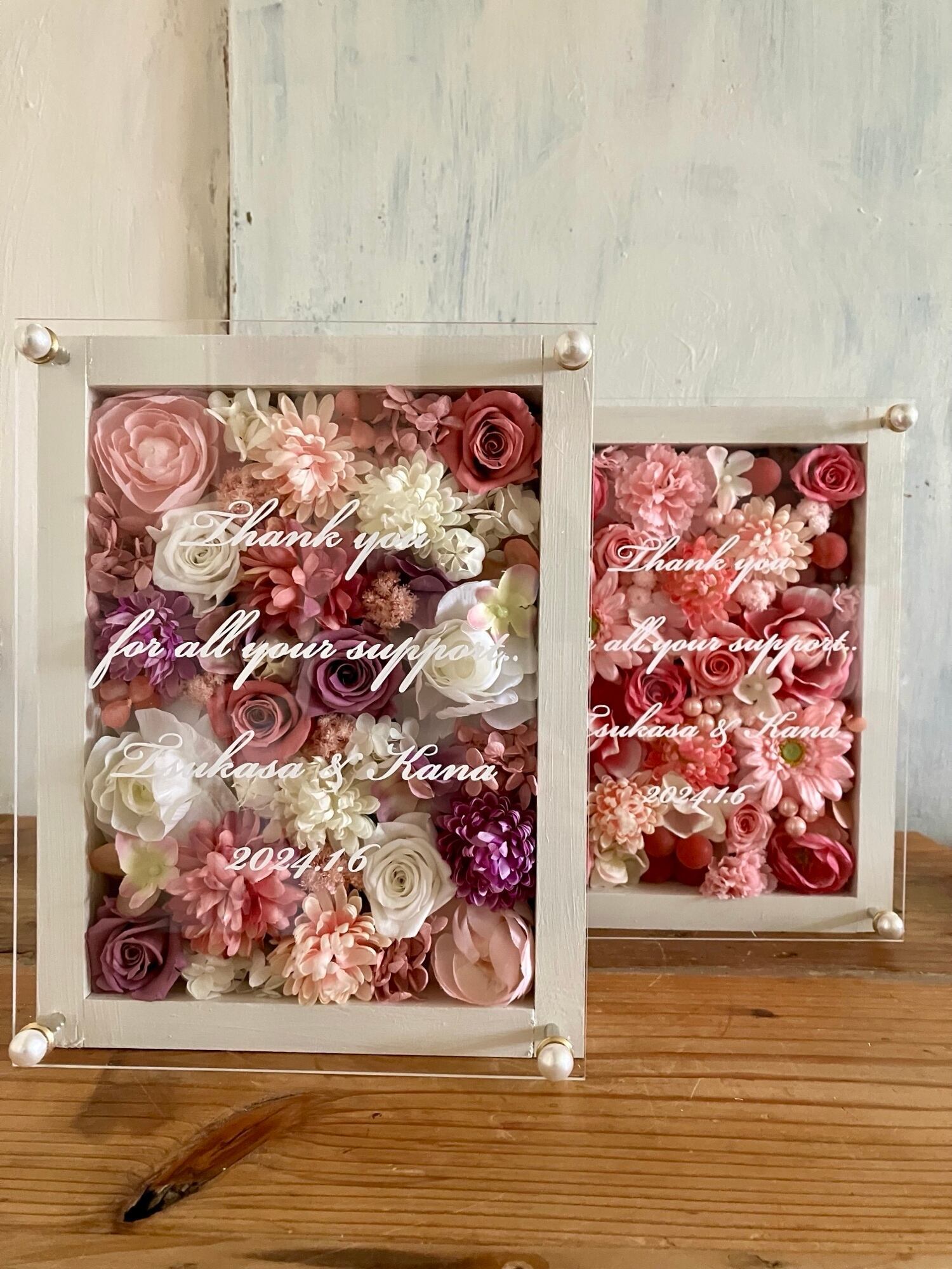 ウッドフレームにプリザーブドフラワーと造花をぎっしり詰め込みアクリル板にはカッティングシートでお名前、挙式日、生まれてから今日までの日数などをお入れします