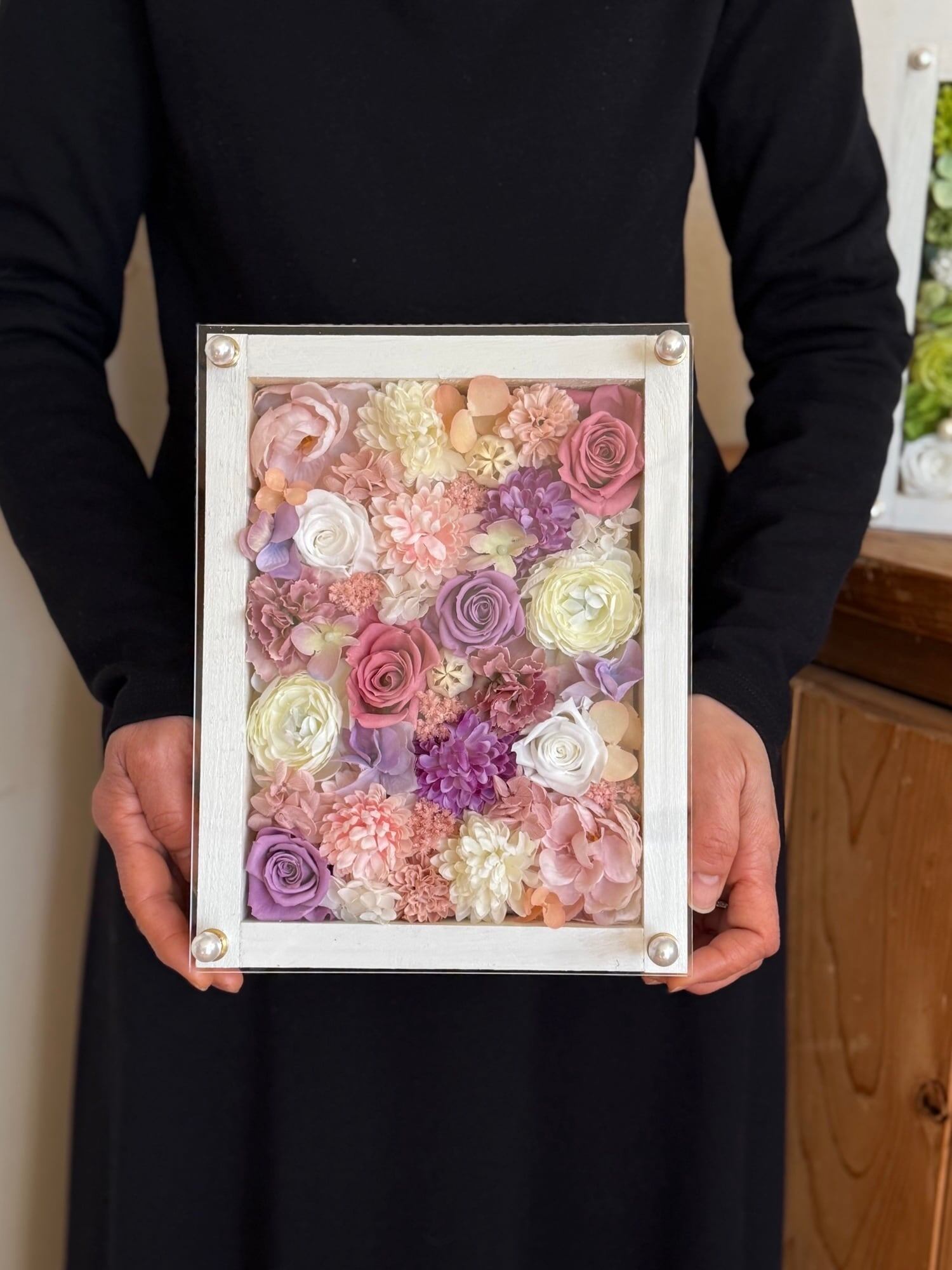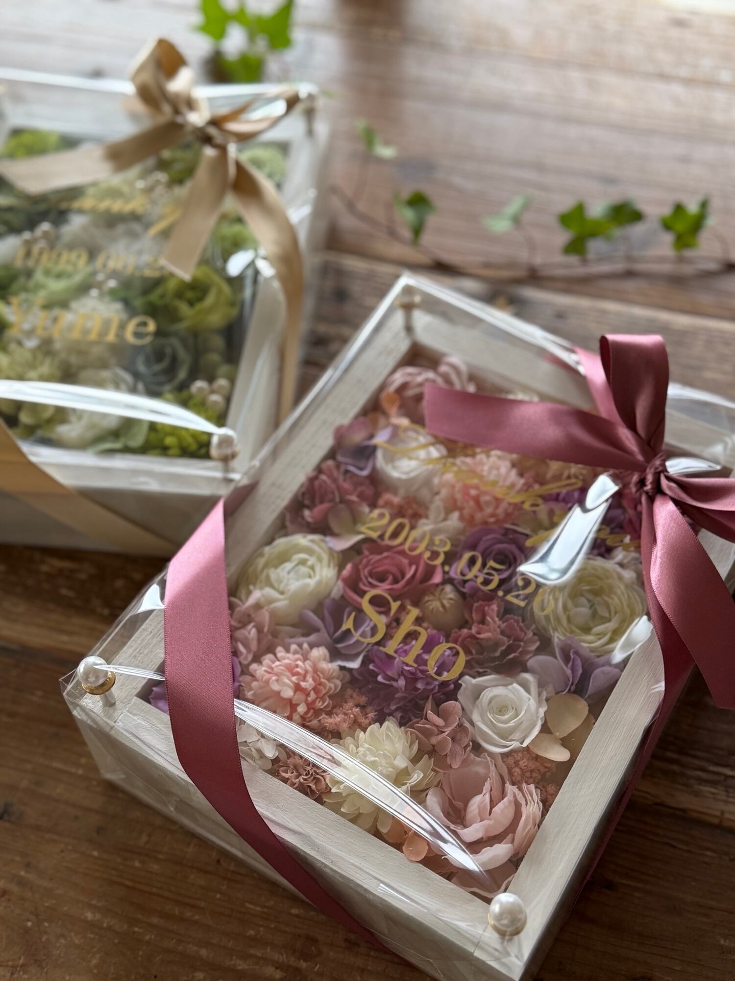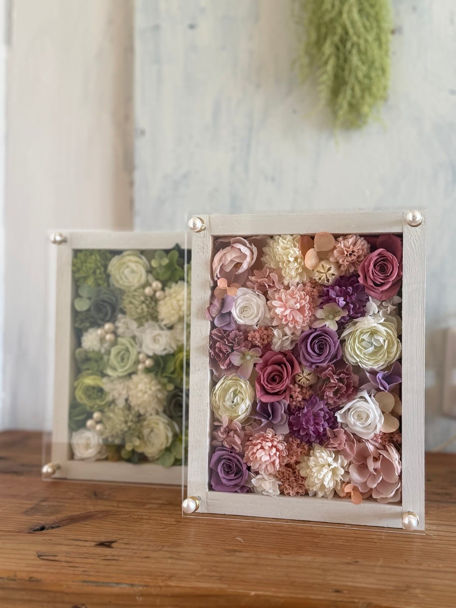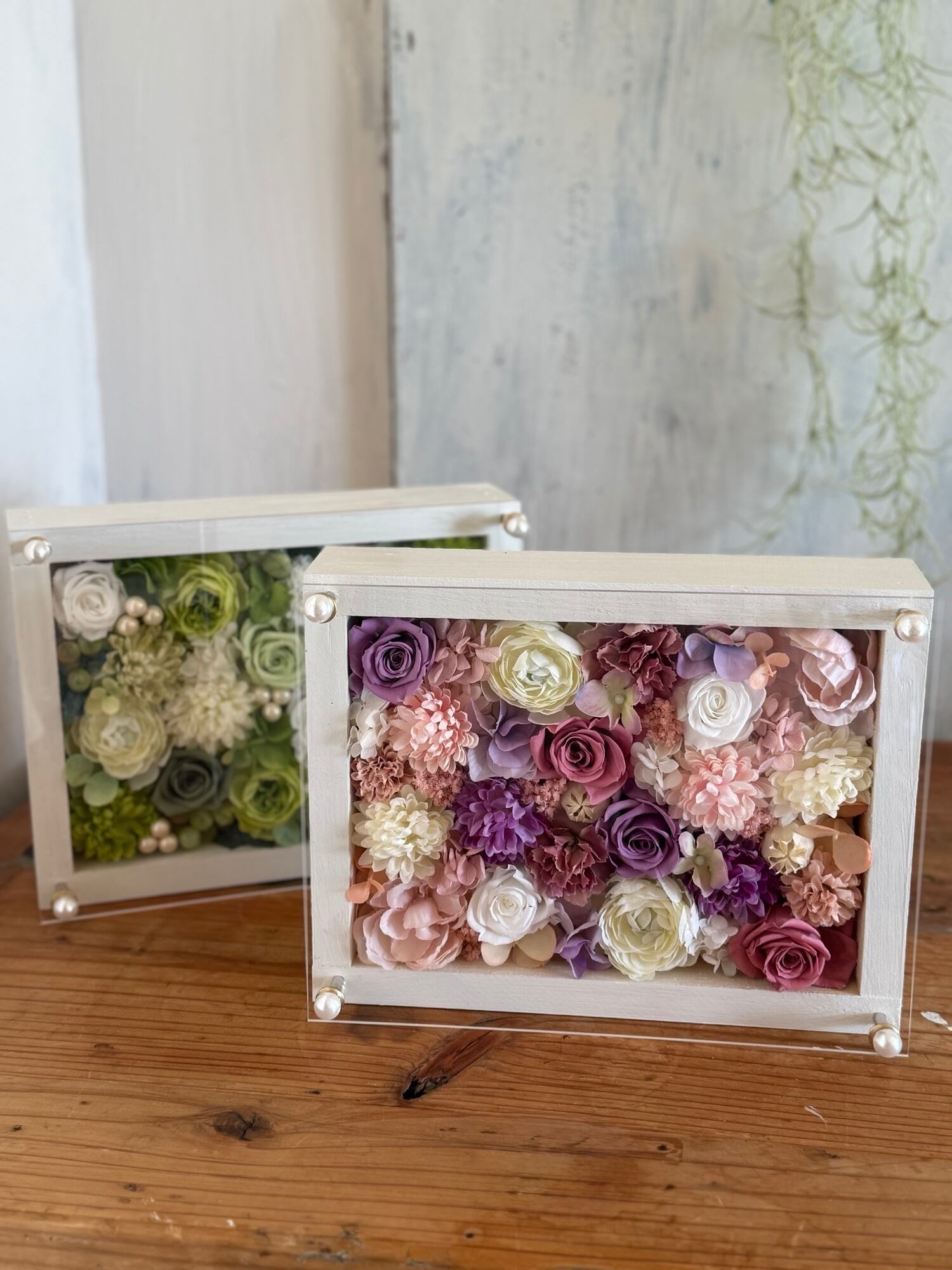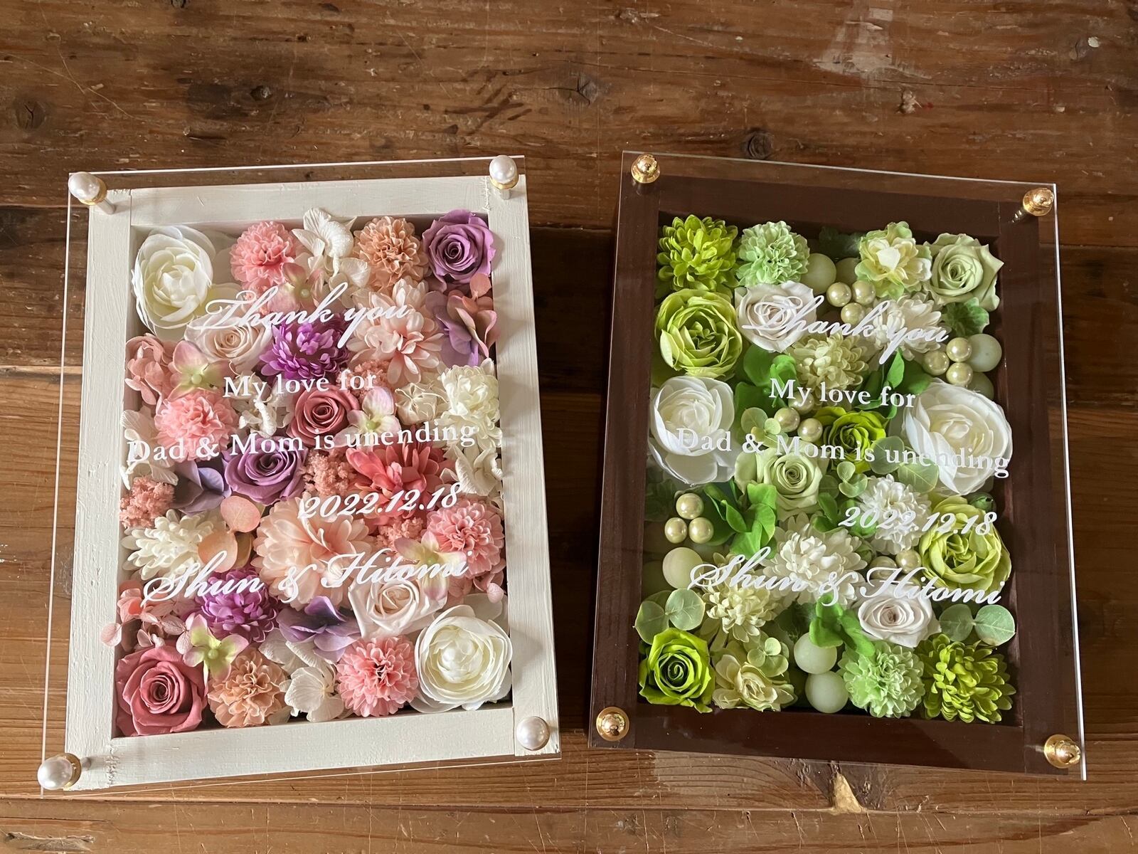 子育て感謝状・両親贈呈品 2個セット【名入れ】 プリザーブドフラワーアレンジ ウッドフレーム〈白グリーン&ピンクパープル白〉結婚式 ギフト