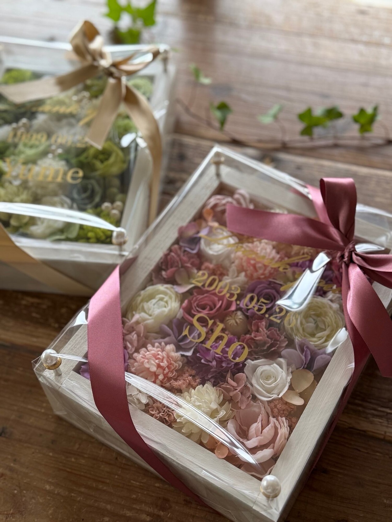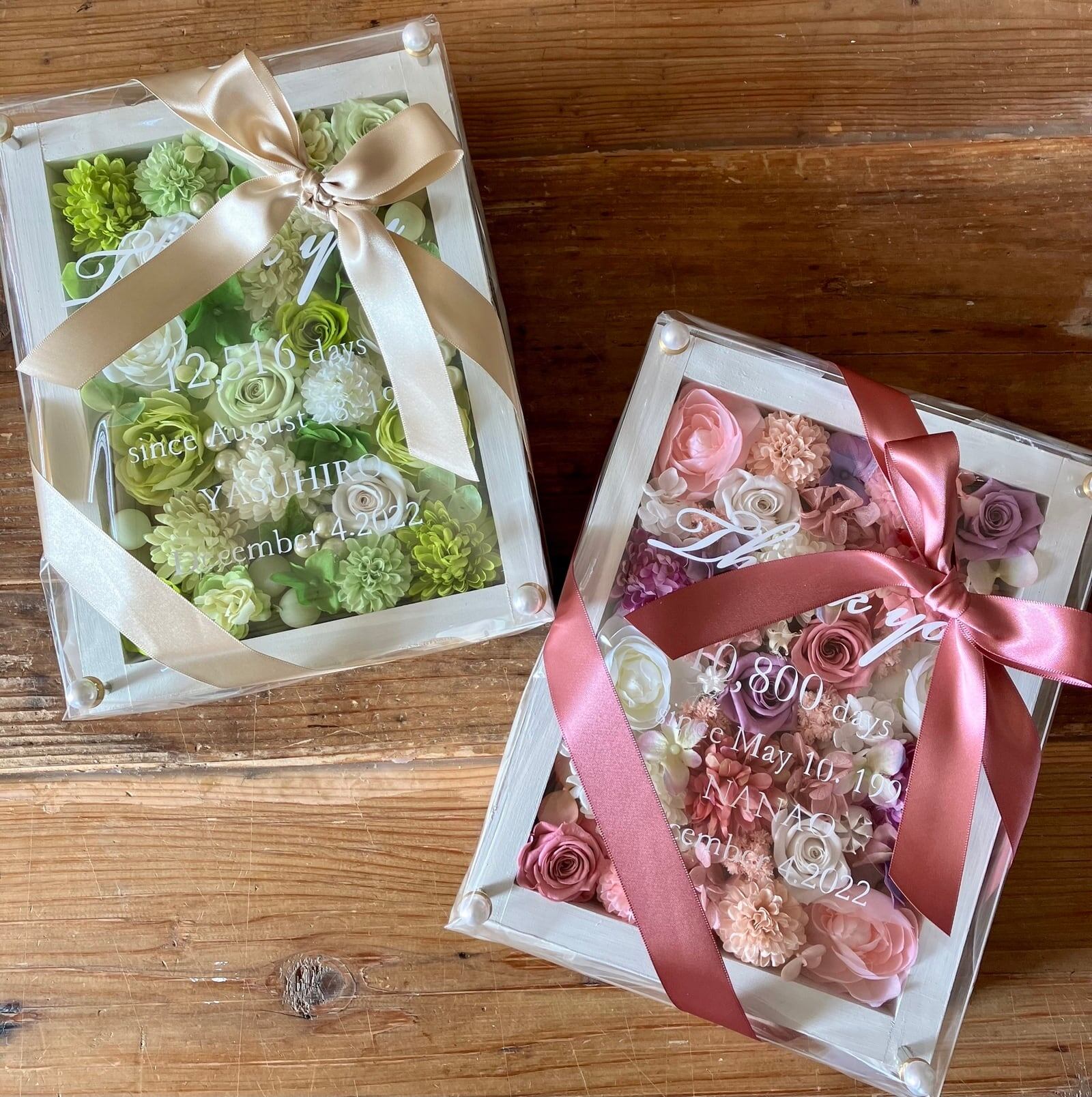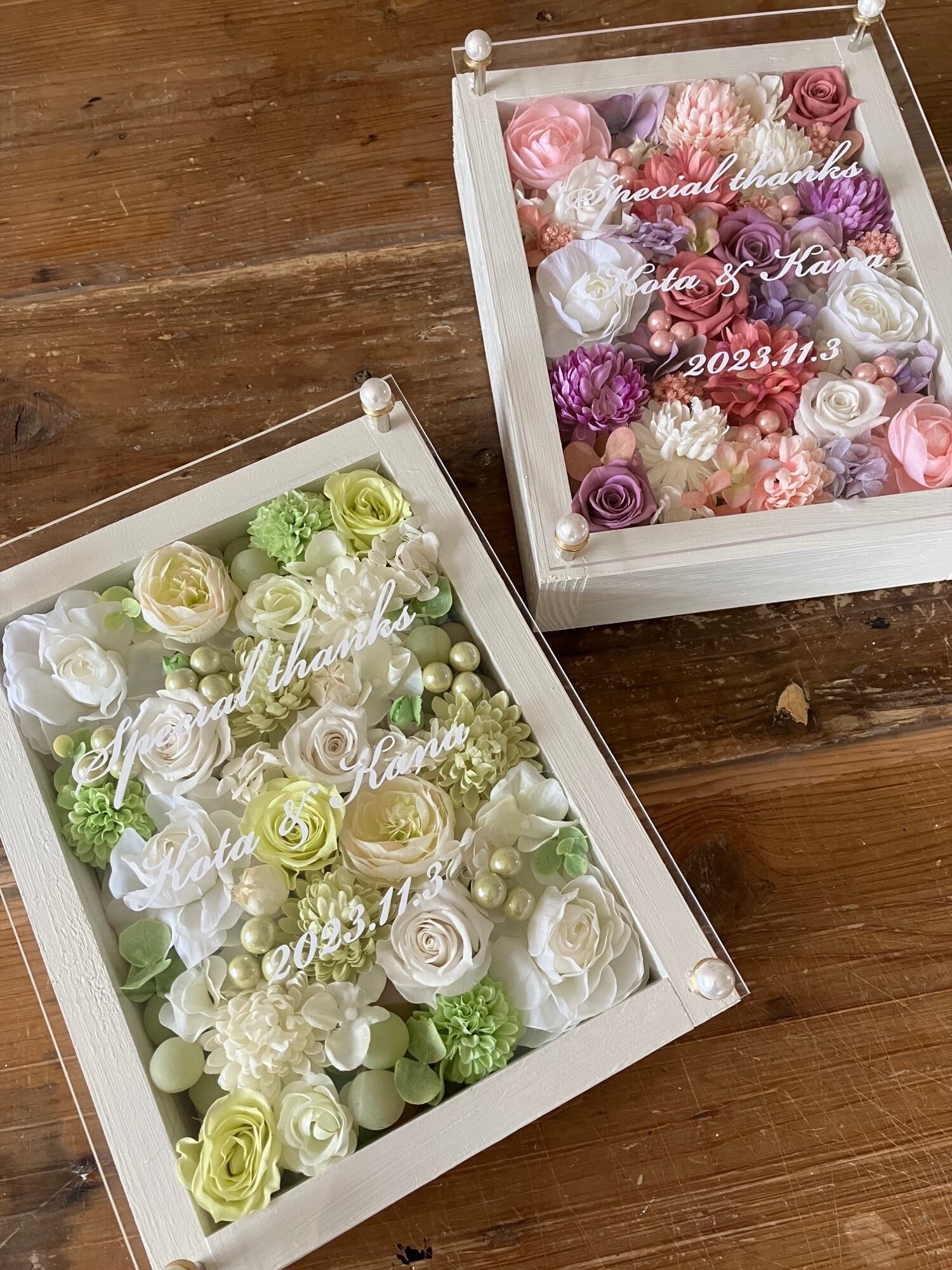 ウッドフレームにプリザーブドフラワーと造花をぎっしり詰め込みアクリル板にはカッティングシートでお名前、挙式日、生まれてから今日までの日数などをお入れします
