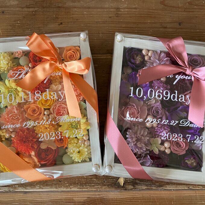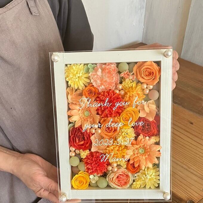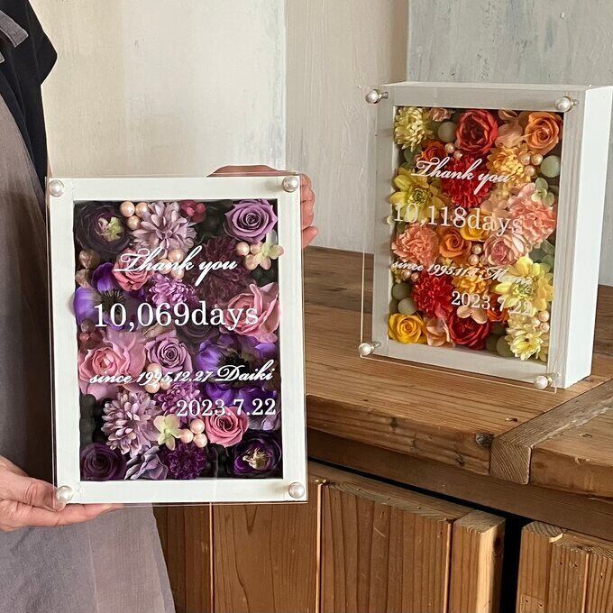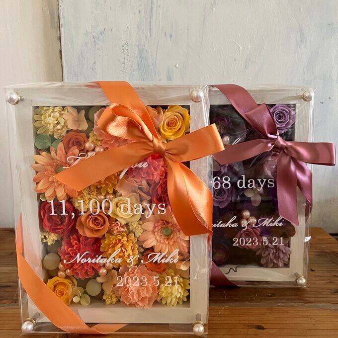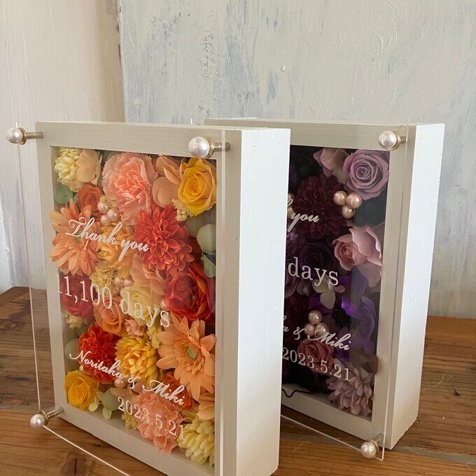 ウッドフレームにプリザーブドフラワーと造花をぎっしり詰め込みアクリル板にはカッティングシートでお名前、挙式日、生まれてから今日までの日数などをお入れします