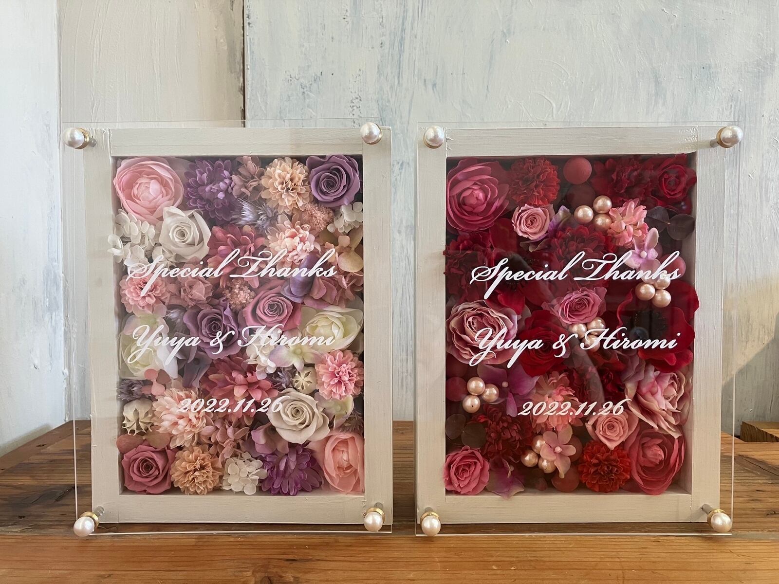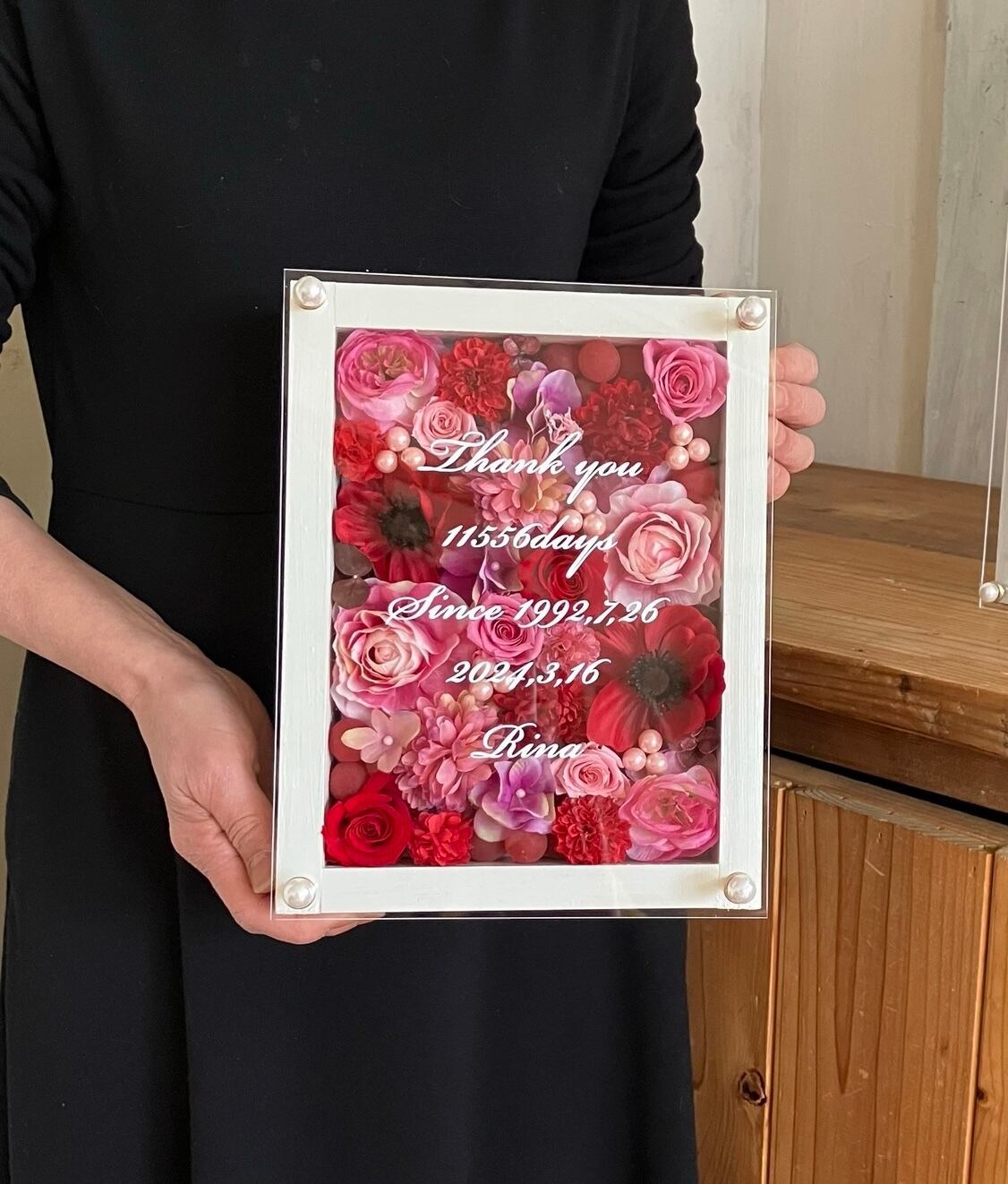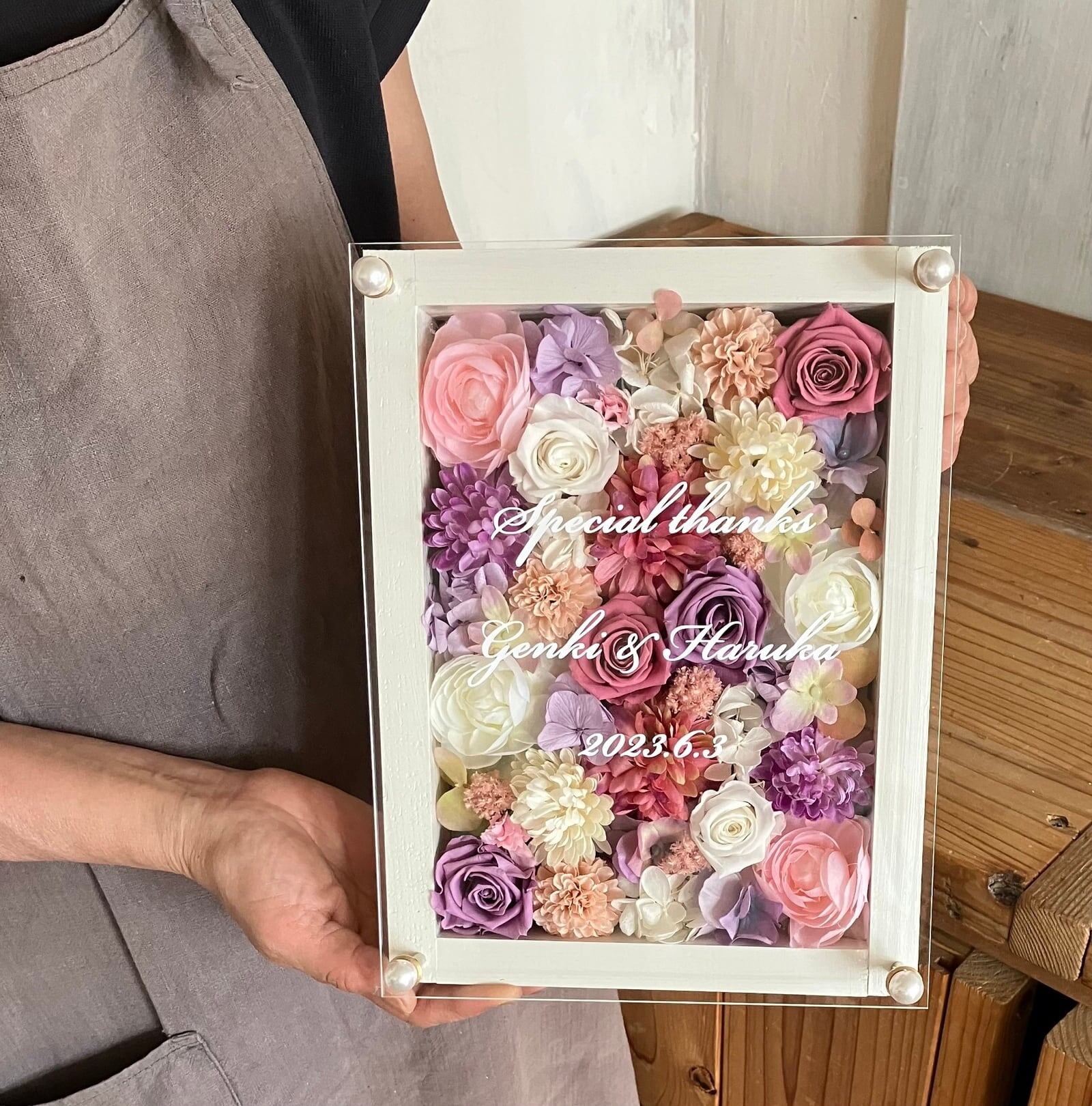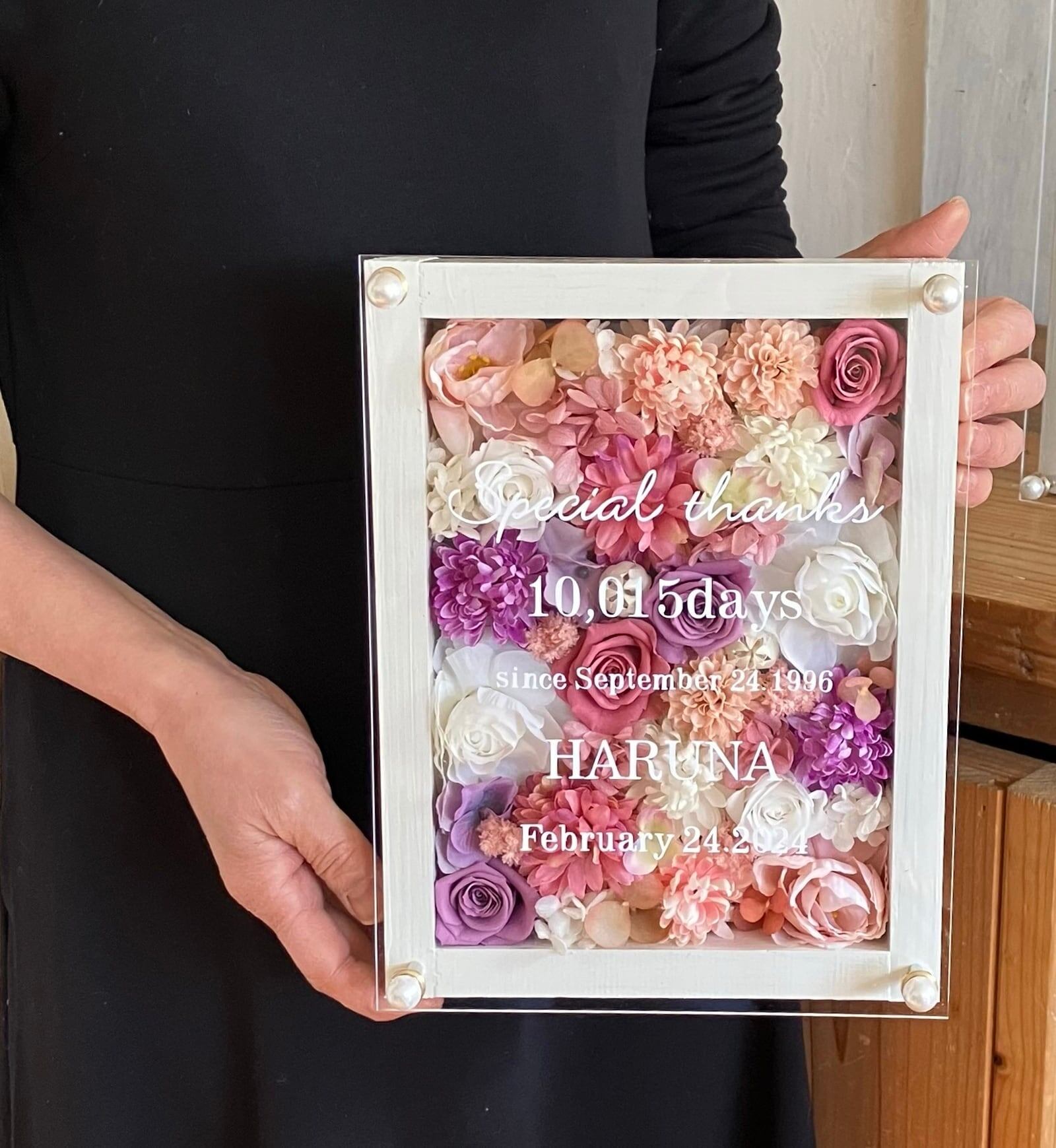 白色のウッドフレームにプリザーブドフラワーと造花をぎっしり詰め込みアクリル板にはカッティングシートでお名前、挙式日、生まれてから今日までの日数などをお入れします